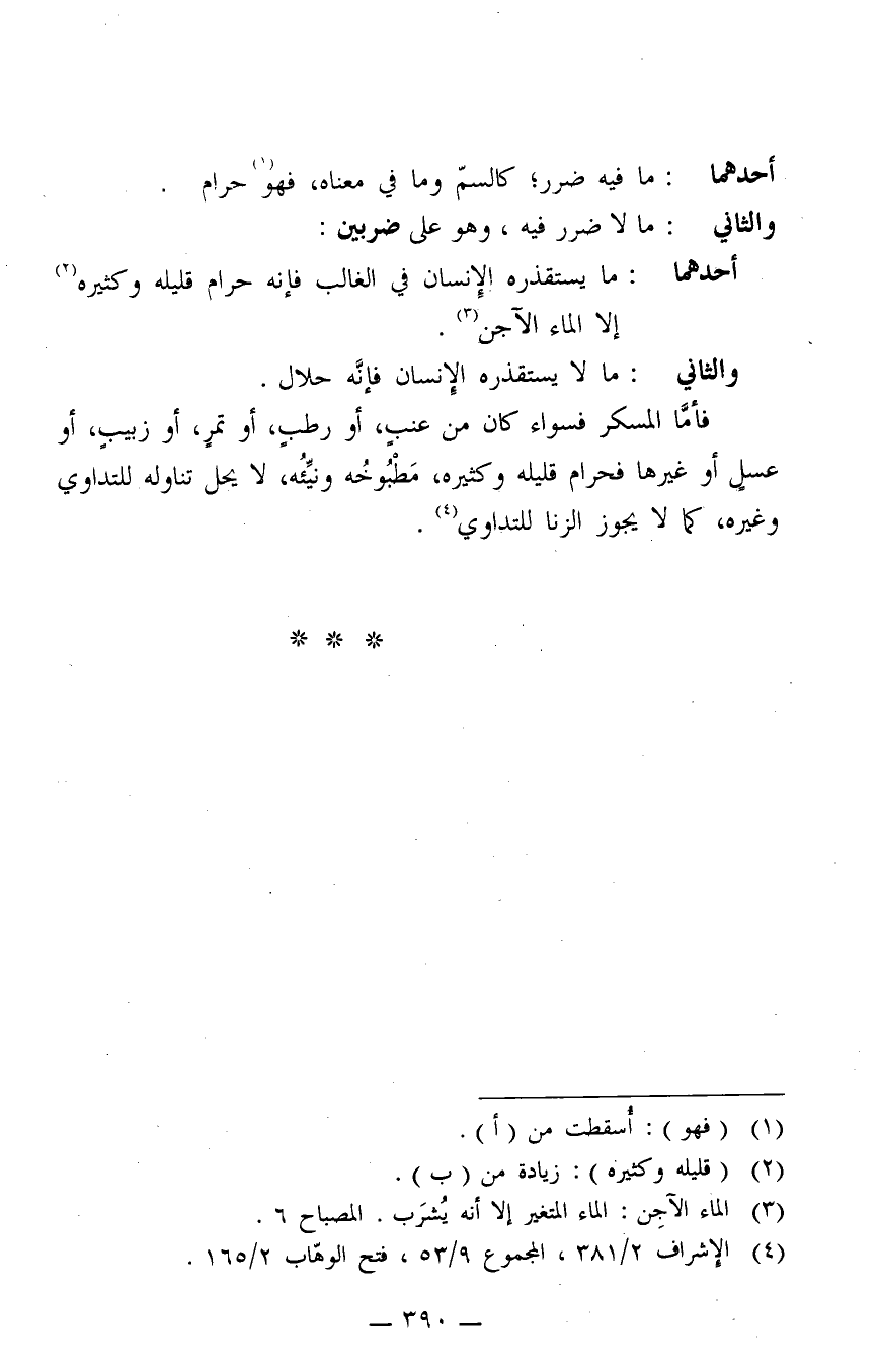 فأما المسكر فسواء كان من عنب، أو رطب، أو تمر، أو زبيب، أو عسل، أو غيرها فحرام قليله وكثيره، مطبوخه ونَيِّئُه، لا يحل تناوله للتداوي وغيره، كما لا يجوز الزنا للتداوي4.