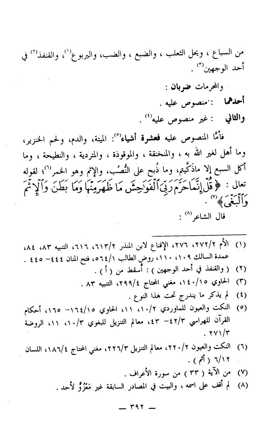 فأما المنصوص عليه فعشرة أشياء 5: الميتة، والدم، ولحم الخنزير، وما أهل لغير الله به، والمنخنقة، والموقوذة، والمتردية، والنطيحة، وما أكل السبع إلا ما ذكيتم، وما ذبح على النُّصُب، والإثم وهو الخمر6؛ لقوله تعالى: {قُلْ إِنَّمَا حَرَّمَ رَبِّيَ الْفَوَاحِشَ مَا ظَهَرَ مِنْهَا وَمَا بَطَنَ وَالْإِثْمَ وَالْبَغْي} 7.