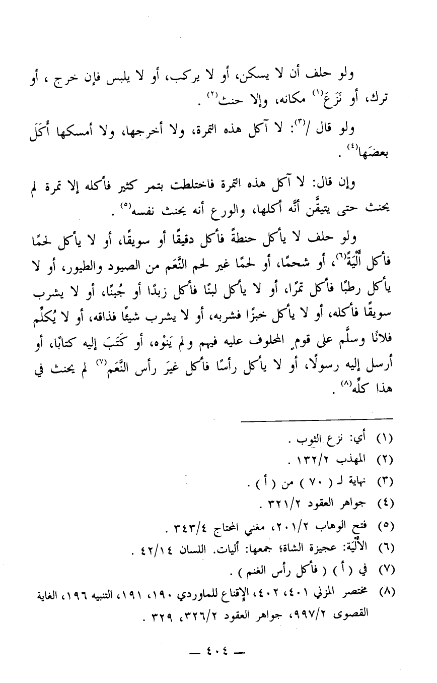 ولو حلف لا يأكل حنطة فأكل دقيقا أو سويقا، أو لا يأكل لحما فأكل ألْيَة6، أو شحما، أو لحما غير لحم النّعم من الصيود والطيور، ولا يأكل رطبا فأكل تمرا، أو لا يأكل لبنا فأكل زبدا أو جبنا، أو لا يشرب سويقا فأكله، أو لا يأكل خبزا فشربه، أو لا يشرب شيئا فذاقه، أو لا يكلّم فلانا وسلَّم على قوم المحلوف عليه فيهم ولم يَنْوِه، أو كتب إليه كتابا، أو أرسل إليه رسولا، أو لا يأكل رأسا فأكل غير رأس النّعم7 لم يحنث في هذا كلّه8.