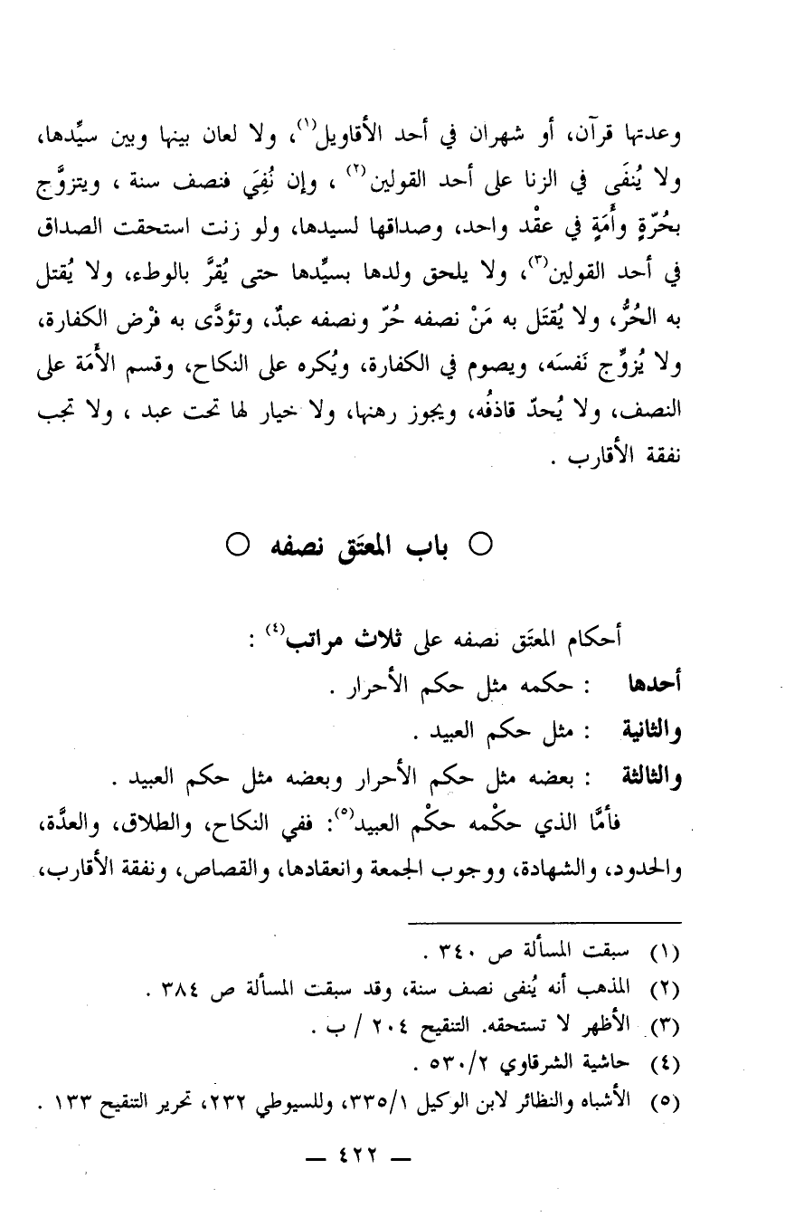 فأما الذي حكمه حكم العبيد5: ففي النكاح، والطلاق، والعدة، والحدود، والشهادة، ووجوب الجمعة وانعقادها، والقصاص، ونفقة الأقارب،