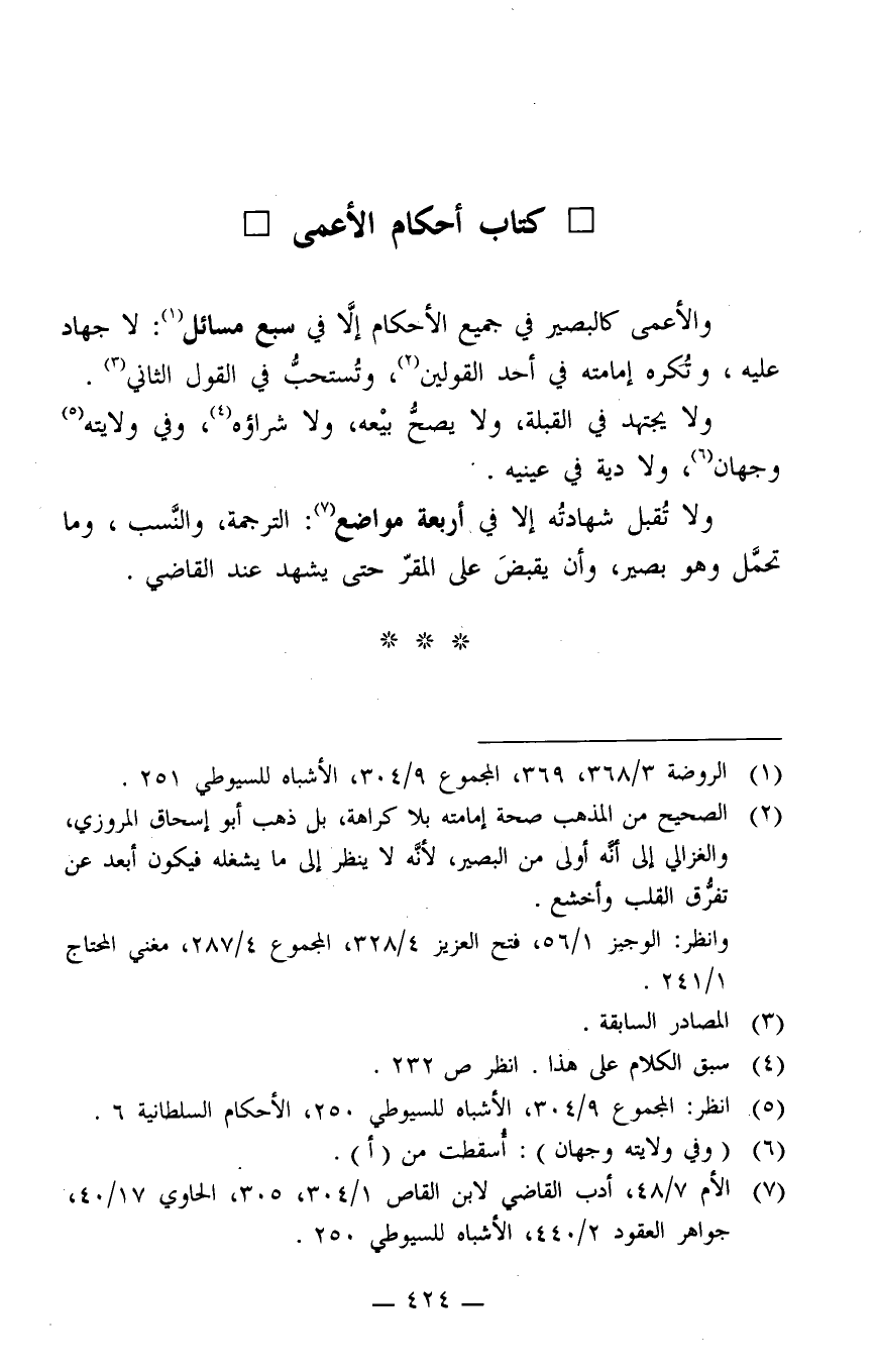 والأعمى كالبصير في جميع الأحكام إلا في سبع مسائل1: لا جهاد عليه، وتُكرَه إمامته في أحد القولين2، وتُستحبّ في القول الثاني3.