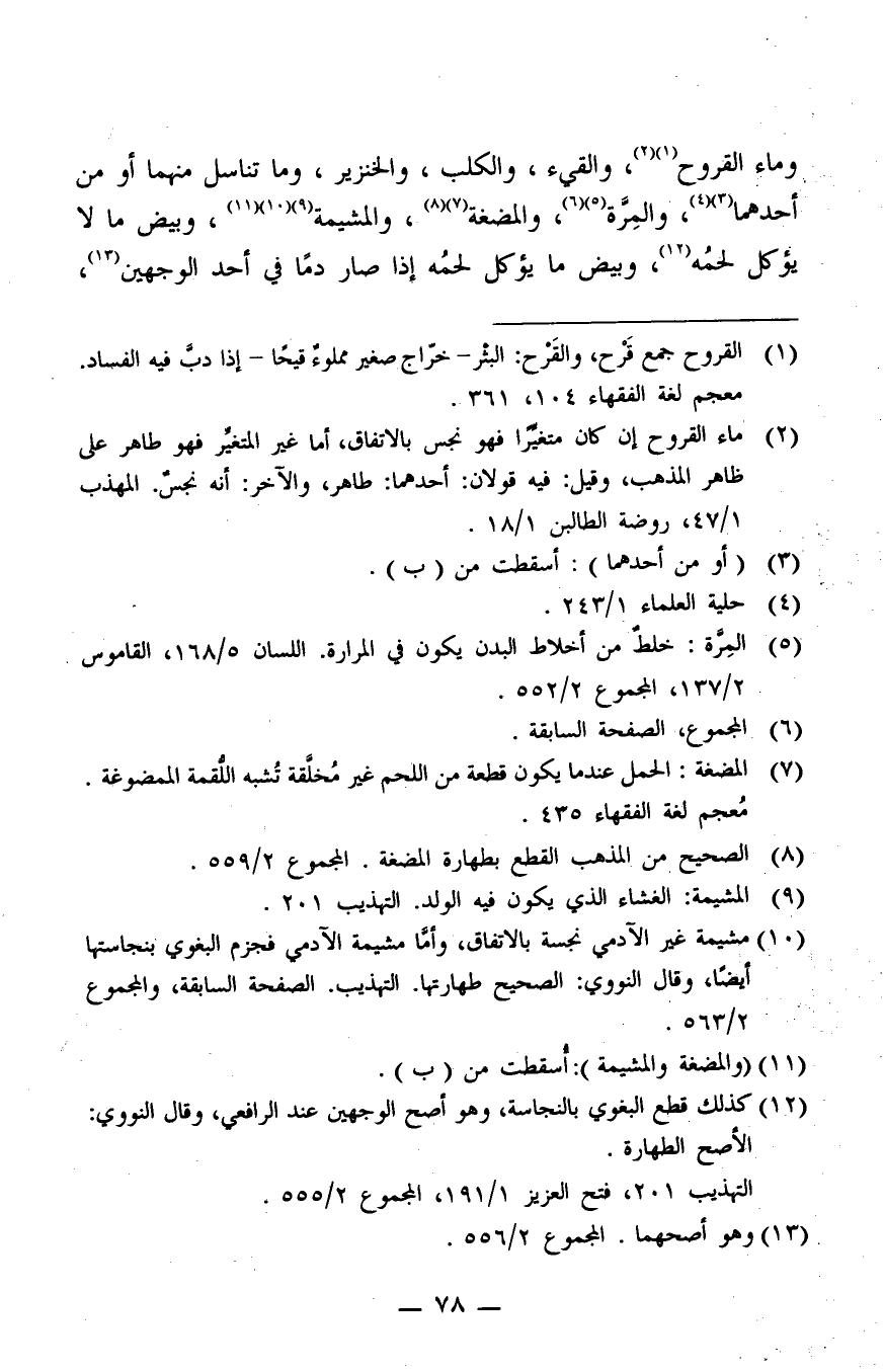 وماء القروح1 2، والقيء، والكلب، والخنزير، وما تناسل منهما أو من أحدهما3 4، والمِرَّة5 6، والمضغة7 8، والمشيمة9 10 11، وبيض ما لا يؤكل لحمه12، وبيض ما يؤكل لحمه إذا صار دمًا في أحد الوجهين13،