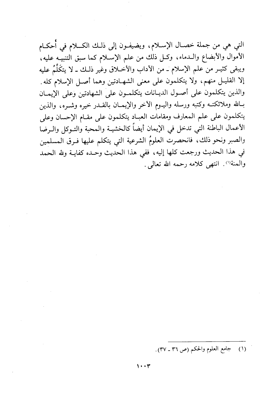 الَّتِي هِيَ مِنْ جُمْلَةِ خِصَالِ الْإِسْلَامِ, وَيُضِيفُونَ إِلَى ذَلِكَ الْكَلَامَ فِي أَحْكَامِ الْأَمْوَالِ وَالْأَبْضَاعِ وَالدِّمَاءِ, وَكُلُّ ذَلِكَ مِنْ عِلْمِ الْإِسْلَامِ كَمَا سَبَقَ التَّنْبِيهُ عَلَيْهِ, وَيَبْقَى كَثِيرٌ مِنْ عِلْمِ الْإِسْلَامِ -مِنَ الْآدَابِ وَالْأَخْلَاقِ وَغَيْرِ ذَلِكَ- لَا يَتَكَلَّمُ عَلَيْهِ إِلَّا الْقَلِيلُ مِنْهُمْ, وَلَا يَتَكَلَّمُونَ عَلَى مَعْنَى الشَّهَادَتَيْنِ وَهُمَا أَصْلُ الْإِسْلَامِ كُلِّهِ. وَالَّذِينَ يَتَكَلَّمُونَ عَلَى أُصُولِ الدِّيَانَاتِ يَتَكَلَّمُونَ عَلَى الشَّهَادَتَيْنِ وَعَلَى الْإِيمَانِ بِاللَّهِ وَمَلَائِكَتِهِ وَكُتُبِهِ وَرُسُلِهِ وَالْيَوْمِ الْآخِرِ وَالْإِيمَانِ بِالْقَدَرِ خَيْرِهِ وَشَرِّهِ, وَالَّذِينَ يَتَكَلَّمُونَ عَلَى عِلْمِ الْمَعَارِفِ وَمَقَامَاتِ الْعِبَادِ يَتَكَلَّمُونَ عَلَى مَقَامِ الْإِحْسَانِ وَعَلَى الْأَعْمَالِ الْبَاطِنَةِ الَّتِي تَدْخُلُ فِي الْإِيمَانِ أَيْضًا كَالْخَشْيَةِ وَالْمَحَبَّةِ وَالتَّوَكُّلِ وَالرِّضَا وَالصَّبْرِ وَنَحْوِ ذَلِكَ, فَانْحَصَرَتِ الْعُلُومُ الشَّرْعِيَّةُ الَّتِي يَتَكَلَّمُ عَلَيْهَا فِرَقُ الْمُسْلِمِينَ فِي هَذَا الْحَدِيثِ وَرَجَعَتْ كُلُّهَا إِلَيْهِ, فَفِي هَذَا الْحَدِيثِ وَحْدَهُ كِفَايَةٌ وَلِلَّهِ الْحَمْدُ وَالْمِنَّةُ1. انْتَهَى كَلَامُهُ رَحِمَهُ اللَّهُ تَعَالَى.