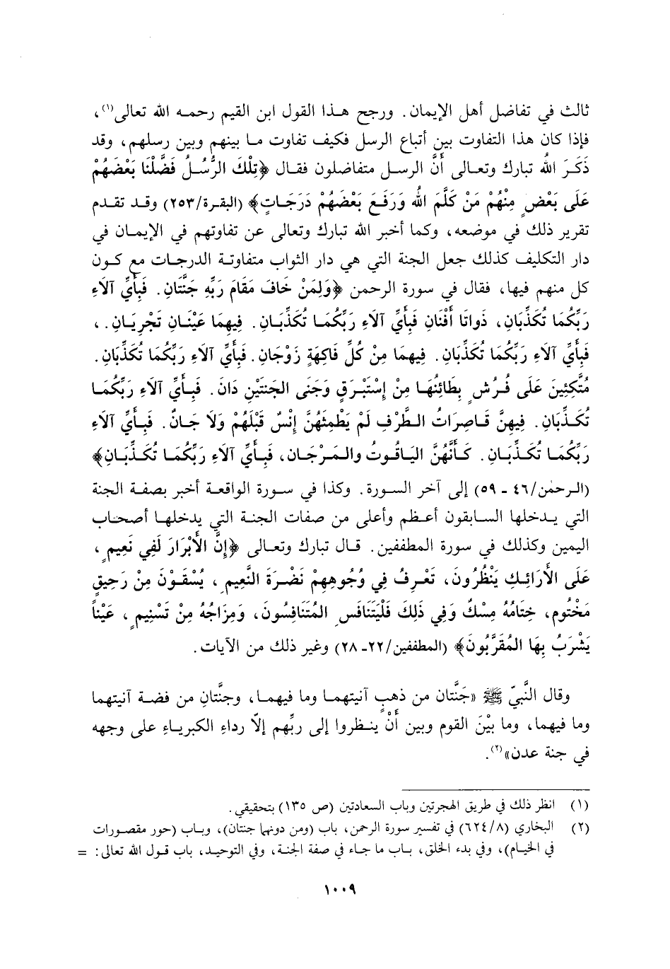 ثَالِثٌ فِي تُفَاضِلِ أَهْلِ الْإِيمَانِ. وَرَجَّحَ هَذَا الْقَوْلَ ابْنُ الْقَيِّمِ رَحِمَهُ اللَّهُ تَعَالَى1, فَإِذَا كَانَ هَذَا التَّفَاوُتُ بَيْنَ أَتِّبَاعِ الرُّسُلِ فَكَيْفَ تَفَاوَتَ مَا بَيْنَهُمْ وَبَيْنَ رُسُلِهِمْ, وَقَدْ ذَكَرَ اللَّهُ تَبَارَكَ وَتَعَالَى أَنَّ الرُّسُلَ مُتَفَاضِلُونَ فَقَالَ {تِلْكَ الرُّسُلُ فَضَّلْنَا بَعْضَهُمْ عَلَى بَعْضٍ مِنْهُمْ مَنْ كَلَّمَ اللَّهُ وَرَفَعَ بَعْضَهُمْ دَرَجَاتٍ} [الْبَقَرَةِ: 253] وَقَدْ تَقَدَّمَ تَقْرِيرُ ذَلِكَ فِي مَوْضِعِهِ, وَكَمَا أَخْبَرَ اللَّهُ تَبَارَكَ وَتَعَالَى عَنْ تَفَاوُتِهِمْ فِي الْإِيمَانِ فِي دَارِ التَّكْلِيفِ كَذَلِكَ جَعَلَ الْجَنَّةَ الَّتِي هِيَ دَارُ الثَّوَابِ مُتَفَاوِتَةَ الدَّرَجَاتِ مَعَ كَوْنِ كُلٍّ مِنْهُمْ فِيهَا, فَقَالَ فِي سُورَةِ الرَّحْمَنِ: {وَلِمَنْ خَافَ مَقَامَ رَبِّهِ جَنَّتَانِ فَبِأَيِّ آلَاءِ رَبِّكُمَا تُكَذِّبَانِ ذَوَاتَا أَفْنَانٍ فَبِأَيِّ آلَاءِ رَبِّكُمَا تُكَذِّبَانِ فِيهِمَا عَيْنَانِ تَجْرِيَانِ فَبِأَيِّ آلَاءِ رَبِّكُمَا تُكَذِّبَانِ فِيهِمَا مِنْ كُلِّ فَاكِهَةٍ زَوْجَانِ فَبِأَيِّ آلَاءِ رَبِّكُمَا تُكَذِّبَانِ مُتَّكِئِينَ عَلَى فُرُشٍ بَطَائِنُهَا مِنْ إِسْتَبْرَقٍ وَجَنَى الْجَنَّتَيْنِ دَانٍ فَبِأَيِّ آلَاءِ رَبِّكُمَا تُكَذِّبَانِ فِيهِنَّ قَاصِرَاتُ الطَّرْفِ لَمْ يَطْمِثْهُنَّ إِنْسٌ قَبْلَهُمْ وَلَا جَانٌّ فَبِأَيِّ آلَاءِ رَبِّكُمَا تُكَذِّبَانِ كَأَنَّهُنَّ الْيَاقُوتُ وَالْمَرْجَانُ فَبِأَيِّ آلَاءِ رَبِّكُمَا تُكَذِّبَانِ} [الرَّحْمَنِ: 46-59] إِلَى آخِرِ السُّورَةِ. وَكَذَا فِي سُورَةِ الْوَاقِعَةِ أَخْبَرَ بِصِفَةِ الْجَنَّةِ الَّتِي يَدْخُلُهَا السَّابِقُونَ أَعْظَمَ وَأَعْلَى مِنْ صِفَاتِ الْجَنَّةِ الَّتِي يَدْخُلُهَا أَصْحَابُ الْيَمِينِ, وَكَذَلِكَ فِي سُورَةِ الْمُطَفِّفِينَ؛ قَالَ تَبَارَكَ وَتَعَالَى: {إِنَّ الْأَبْرَارَ لَفِي نَعِيمٍ عَلَى الْأَرَائِكِ يَنْظُرُونَ تَعْرِفُ فِي وُجُوهِهِمْ نَضْرَةَ النَّعِيمِ يُسْقَوْنَ مِنْ رَحِيقٍ مَخْتُومٍ خِتَامُهُ مِسْكٌ وَفِي ذَلِكَ فَلْيَتَنَافَسِ الْمُتَنَافِسُونَ وَمِزَاجُهُ مِنْ تَسْنِيمٍ عَيْنًا يَشْرَبُ بِهَا الْمُقَرَّبُونَ} [الْمُطَفِّفِينَ: 22-28] وَغَيْرُ ذَلِكَ مِنَ الْآيَاتِ.