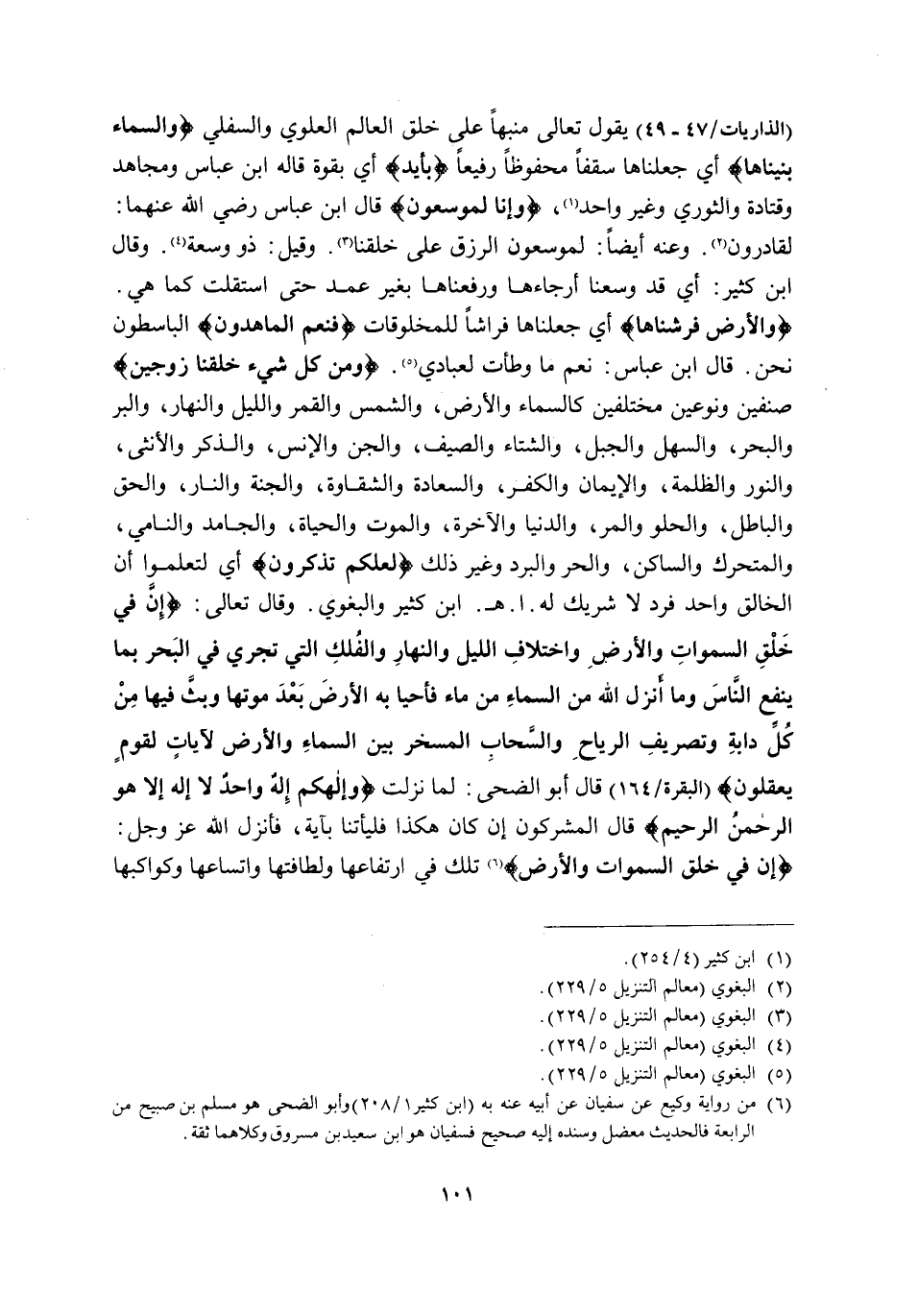 [الذَّارِيَاتِ: 47-49] يَقُولُ تَعَالَى مُنَبِّهًا عَلَى خَلْقِ الْعَالَمِ الْعُلْوِيِّ وَالسُّفْلِيِّ {وَالسَّمَاءَ بَنَيْنَاهَا} أَيْ: جَعَلْنَاهَا سَقْفًا مَحْفُوظًا رَفِيعًا {بِأَيْدٍ} أَيْ: بِقُوَّةٍ قَالَهُ ابْنُ عَبَّاسٍ وَمُجَاهِدٌ وَقَتَادَةُ وَالثَّوْرِيُّ وَغَيْرُ وَاحِدٍ1، {وَإِنَّا لَمُوسِعُونَ} قَالَ ابْنُ عَبَّاسٍ رَضِيَ اللَّهُ عَنْهُمَا: لَقَادِرُونَ2. وَعَنْهُ أَيْضًا: لَمُوسِعُونَ الرِّزْقَ عَلَى خَلْقِنَا3. وَقِيلَ: ذُو وسعة4. وَقَالَ ابْنُ كَثِيرٍ: أَيْ: قَدْ وَسَّعْنَا أَرْجَاءَهَا وَرَفَعْنَاهَا بِغَيْرِ عمد حتى استقرت كَمَا هِيَ {وَالْأَرْضَ فَرَشْنَاهَا} أَيْ: جَعَلْنَاهَا فِرَاشًا لِلْمَخْلُوقَاتِ {فَنِعْمَ الْمَاهِدُونَ} الْبَاسِطُونَ نَحْنُ. قَالَ ابْنُ عَبَّاسٍ: نِعْمَ مَا وَطَّأْتُ لِعِبَادِي5. {وَمِنْ كُلِّ شَيْءٍ خَلَقْنَا زَوْجَيْنِ} صِنْفَيْنِ وَنَوْعَيْنِ مُخْتَلِفَيْنِ كَالسَّمَاءِ وَالْأَرْضِ وَالشَّمْسِ وَالْقَمَرِ وَاللَّيْلِ وَالنَّهَارِ وَالْبَرِّ وَالْبَحْرِ وَالسَّهْلِ وَالْجَبَلِ وَالشِّتَاءِ وَالصَّيْفِ وَالْجِنِّ وَالْإِنْسِ وَالذَّكَرِ وَالْأُنْثَى وَالنُّورِ وَالظُّلْمَةِ وَالْإِيمَانِ وَالْكُفْرِ وَالسَّعَادَةِ وَالشَّقَاوَةِ وَالْجَنَّةِ وَالنَّارِ وَالْحَقِّ وَالْبَاطِلِ وَالْحُلْوِ وَالْمُرِّ وَالدُّنْيَا وَالْآخِرَةِ وَالْمَوْتِ وَالْحَيَاةِ وَالْجَامِدِ وَالنَّامِي وَالْمُتَحَرِّكِ وَالسَّاكِنِ وَالْحَرِّ وَالْبَرْدِ وَغَيْرِ ذَلِكَ {لَعَلَّكُمْ تَذَكَّرُونَ} أَيْ: لِتَعْلَمُوا أَنَّ الْخَالِقَ وَاحِدٌ فَرْدٌ لَا شَرِيكَ لَهُ ا. هـ. ابْنِ كَثِيرٍ وَالْبَغَوِيِّ. وَقَالَ تَعَالَى: {إِنَّ فِي خَلْقِ السَّمَاوَاتِ وَالْأَرْضِ وَاخْتِلَافِ اللَّيْلِ وَالنَّهَارِ وَالْفُلْكِ الَّتِي تَجْرِي فِي الْبَحْرِ بِمَا يَنْفَعُ النَّاسَ وَمَا أَنْزَلَ اللَّهُ مِنَ السَّمَاءِ مِنْ مَاءٍ فَأَحْيَا بِهِ الْأَرْضَ بَعْدَ مَوْتِهَا وَبَثَّ فِيهَا مِنْ كُلِّ دَابَّةٍ وَتَصْرِيفِ الرِّيَاحِ وَالسَّحَابِ الْمُسَخَّرِ بَيْنَ السَّمَاءِ وَالْأَرْضِ لَآيَاتٍ لِقَوْمٍ يَعْقِلُونَ} [الْبَقَرَةِ: 164] قَالَ أَبُو الضُّحَى: لَمَّا نَزَلَتْ {وَإِلَهُكُمْ إِلَهٌ وَاحِدٌ لَا إِلَهَ إِلَّا هُوَ الرَّحْمَنُ الرَّحِيمُ} قَالَ الْمُشْرِكُونَ: إِنْ كَانَ هَكَذَا فَلْيَأْتِنَا بِآيَةٍ فَأَنْزَلَ اللَّهُ عَزَّ وَجَلَّ: {إِنَّ فِي خَلْقِ السَّمَاوَاتِ وَالْأَرْضِ} 6 تِلْكَ فِي ارْتِفَاعِهَا وَلَطَافَتِهَا وَاتِّسَاعِهَا وَكَوَاكِبِهَا