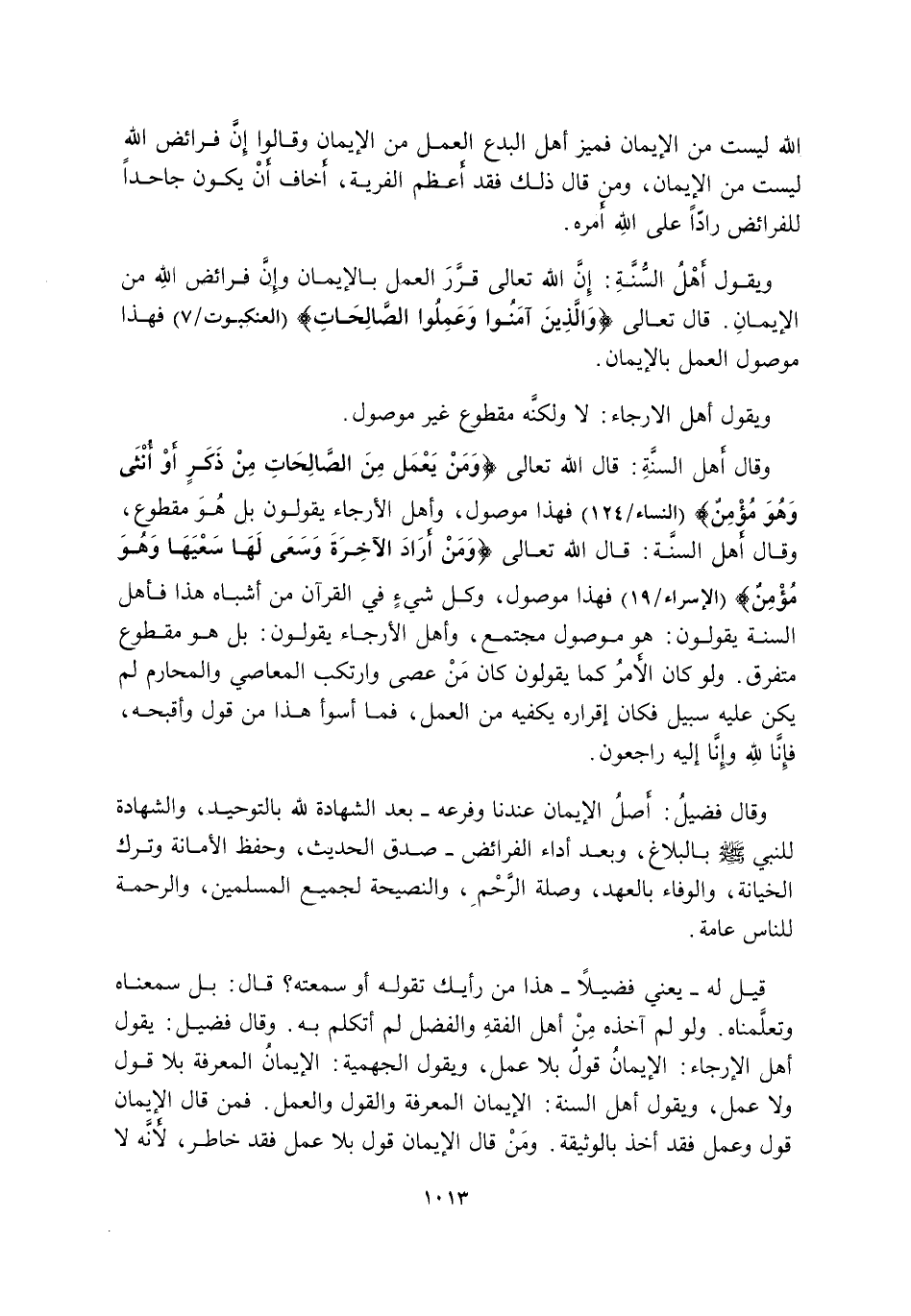 وَقَالَ أَهْلُ السُّنَّةِ: قَالَ اللَّهُ تَعَالَى: {وَمَنْ يَعْمَلْ مِنَ الصَّالِحَاتِ مِنْ ذَكَرٍ أَوْ أُنْثَى وَهُوَ مُؤْمِنٌ} [النِّسَاءِ: 124] فَهَذَا مَوْصُولٌ, وَأَهْلُ الْإِرْجَاءِ يَقُولُونَ: بَلْ هُوَ مَقْطُوعٌ. وَقَالَ أَهْلُ السُّنَّةِ: قَالَ اللَّهُ تَعَالَى: {وَمَنْ أَرَادَ الْآخِرَةَ وَسَعَى لَهَا سَعْيَهَا وَهُوَ مُؤْمِنٌ} [الْإِسْرَاءِ: 19] فَهَذَا مَوْصُولٌ, وَكُلُّ شَيْءٍ فِي الْقُرْآنِ مِنْ أَشْبَاهِ هَذَا فَأَهْلُ السُّنَّةِ يَقُولُونَ: هُوَ مَوْصُولٌ مُجْتَمِعٌ, وَأَهْلُ الْإِرْجَاءِ يَقُولُونَ: بَلْ هُوَ مَقْطُوعٌ مُتَفَرِّقٌ. وَلَوْ كَانَ الْأَمْرُ كَمَا يَقُولُونَ كَانَ مَنْ عَصَى وَارْتَكَبَ الْمَعَاصِيَ وَالْمَحَارِمَ لَمْ يَكُنْ عَلَيْهِ سَبِيلٌ فَكَانَ إِقْرَارُهُ يَكْفِيهِ مِنَ الْعَمَلِ, فَمَا أَسْوَأَ هَذَا مِنْ قَوْلٍ وَأَقْبَحَهُ, فَإِنَّا لِلَّهِ وَإِنَّا إِلَيْهِ رَاجِعُونَ.