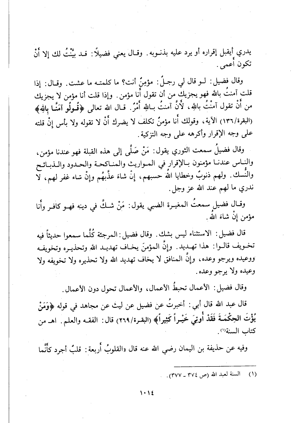 قَالَ فُضَيْلٌ: الِاسْتِثْنَاءُ لَيْسَ بِشَكٍّ. وَقَالَ فُضَيْلٌ: الْمُرْجِئَةُ كُلَّمَا سَمِعُوا حَدِيثًا فِيهِ تَخْوِيفٌ قَالُوا: هَذَا تَهْدِيدٌ. وَإِنَّ الْمُؤْمِنَ يَخَافُ تَهْدِيدَ اللَّهِ وَتَحْذِيرَهُ وَتَخْوِيفَهُ وَوَعِيدَهُ وَيَرْجُو وَعْدَهَ, وَإِنَّ الْمُنَافِقَ لَا يَخَافُ تَهْدِيدَ اللَّهِ وَلَا تَحْذِيرَهُ وَلَا تَخْوِيفَهُ وَلَا وَعِيدَهُ وَلَا يَرْجُو وَعْدَهُ.