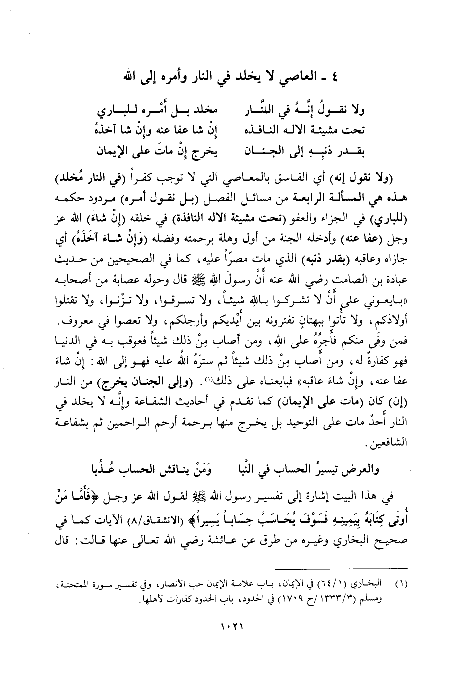 وَلَا نَقُولُ إِنَّهُ فِي النَّارِ ... مُخَلَّدٌ بَلْ أَمْرُهُ لِلْبَارِي