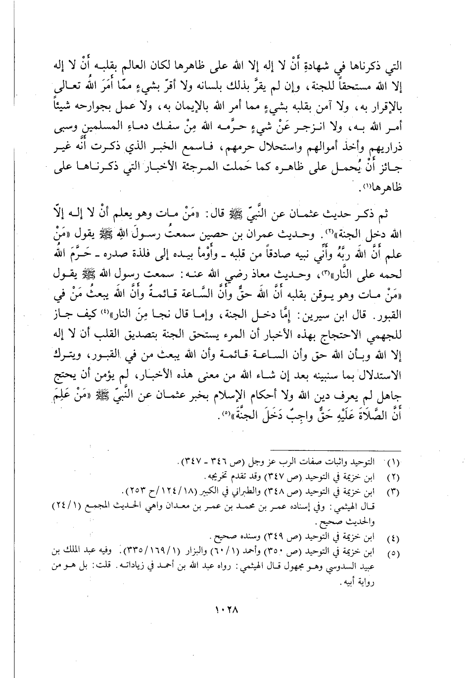 ثُمَّ ذَكَرَ حَدِيثَ عُثْمَانَ عَنِ النَّبِيِّ -صَلَّى اللَّهُ عَلَيْهِ وَسَلَّمَ- قَالَ: "مَنْ مَاتَ وَهُوَ يَعْلَمُ أَنْ لَا إِلَهَ إِلَّا اللَّهُ دَخَلَ الْجَنَّةَ" 2. وَحَدِيثَ عِمْرَانَ بْنِ حُصَيْنٍ سَمِعْتُ رَسُولَ اللَّهِ -صَلَّى اللَّهُ عَلَيْهِ وَسَلَّمَ- يَقُولُ: "مَنْ عَلِمَ أَنَّ اللَّهَ رَبُّهُ وَأَنِّي نَبِيُّهُ صَادِقًا مِنْ قَلْبِهِ -وَأَوْمَأَ بِيَدِهِ إِلَى فِلْذَةِ صَدْرِهِ- حَرَّمَ اللَّهُ لَحْمَهُ عَلَى النَّارِ" 3, وَحَدِيثُ مُعَاذٍ رَضِيَ اللَّهُ عَنْهُ: سَمِعْتُ رَسُولَ اللَّهِ -صَلَّى اللَّهُ عَلَيْهِ وَسَلَّمَ- يَقُولُ: "مَنْ مَاتَ وَهُوَ يُوقِنُ بِقَلْبِهِ أَنَّ اللَّهَ حَقٌّ وَأَنَّ السَّاعَةَ قَائِمَةٌ وَأَنَّ اللَّهَ يَبْعَثُ مَنْ فِي الْقُبُورِ" قَالَ ابْنُ سِيرِينَ: "إِمَّا دَخَلَ الْجَنَّةَ" وَإِمَّا قَالَ: "نَجَا مِنَ النَّارِ"4, كَيْفَ جَازَ لِلْجَهْمِيِّ الِاحْتِجَاجُ بِهَذِهِ الْأَخْبَارِ أَنَّ الْمَرْءَ يَسْتَحِقُّ الْجَنَّةَ بِتَصْدِيقِ الْقَلْبِ أَنْ لَا إِلَهَ إِلَّا اللَّهُ وَبِأَنَّ اللَّهَ حَقٌّ وَأَنَّ السَّاعَةَ قَائِمَةٌ وَأَنَّ اللَّهَ يَبْعَثُ مَنْ فِي الْقُبُورِ, وَيَتْرُكُ الِاسْتِدْلَالَ بِمَا سَنُبَيِّنُهُ بَعْدُ إِنْ شَاءَ اللَّهُ مِنْ مَعْنَى هَذِهِ الْأَخْبَارِ, لَمْ يُؤْمَنْ أَنْ يَحْتَجَّ جَاهِلٌ لَمْ يَعْرِفْ دِينَ اللَّهِ وَلَا أَحْكَامَ الْإِسْلَامِ بِخَبَرِ عُثْمَانَ عَنِ النَّبِيِّ, صَلَّى اللَّهُ عَلَيْهِ وَسَلَّمَ "مَنْ عَلِمَ أَنَّ الصَّلَاةَ عَلَيْهِ حَقٌّ وَاجِبٌ دَخَلَ الْجَنَّةَ" 5.