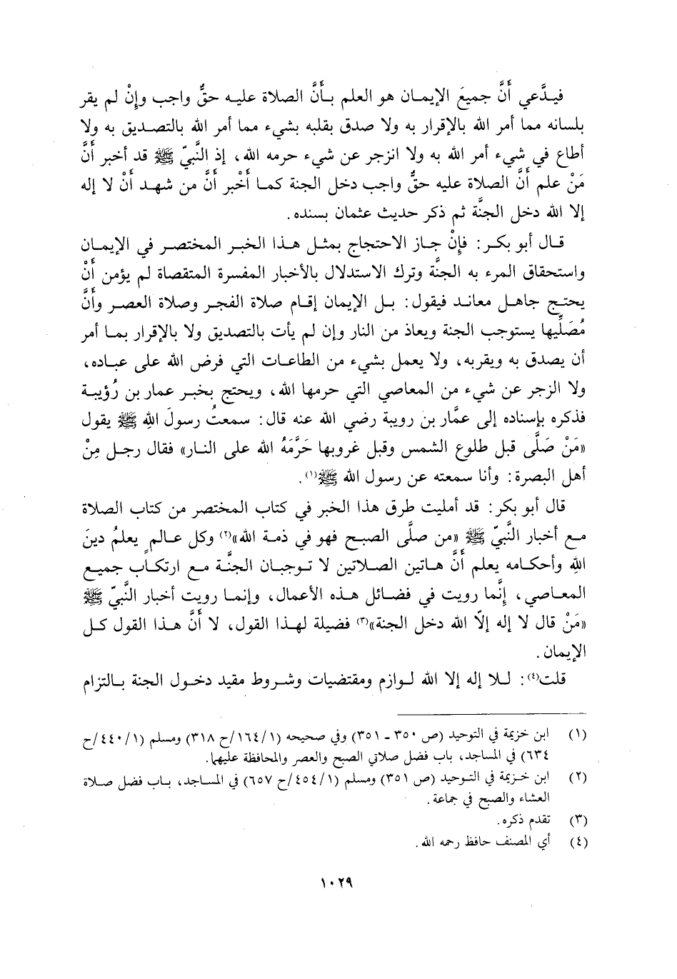قَالَ أَبُو بَكْرٍ: قَدْ أَمْلَيْتُ طُرُقَ هَذَا الْخَبَرِ فِي كِتَابِ الْمُخْتَصَرِ مِنْ كِتَابِ الصَّلَاةِ مَعَ أَخْبَارِ النَّبِيِّ, صَلَّى اللَّهُ عَلَيْهِ وَسَلَّمَ "مَنْ صَلَّى الصُّبْحَ فَهُوَ فِي ذِمَّةِ اللَّهِ" 2 وَكُلُّ عَالِمٍ يَعْلَمُ دِينَ اللَّهِ وَأَحْكَامِهِ يَعْلَمُ أَنَّ هَاتَيْنِ الصَّلَاتَيْنِ لَا تُوجِبَانِ الْجَنَّةَ مَعَ ارْتِكَابِ جَمِيعِ الْمَعَاصِي, إِنَّمَا رُوِيَتْ فِي فَضَائِلِ هَذِهِ الْأَعْمَالِ, وَإِنَّمَا رُوِيَتْ أَخْبَارَ النَّبِيِّ, صَلَّى اللَّهُ عَلَيْهِ وَسَلَّمَ "مَنْ قَالَ لَا إِلَهَ إِلَّا اللَّهُ دَخَلَ الْجَنَّةَ" 3 فَضِيلَةً لِهَذَا الْقَوْلِ, لَا أَنَّ هَذَا الْقَوْلَ كُلُّ الْإِيمَانِ.