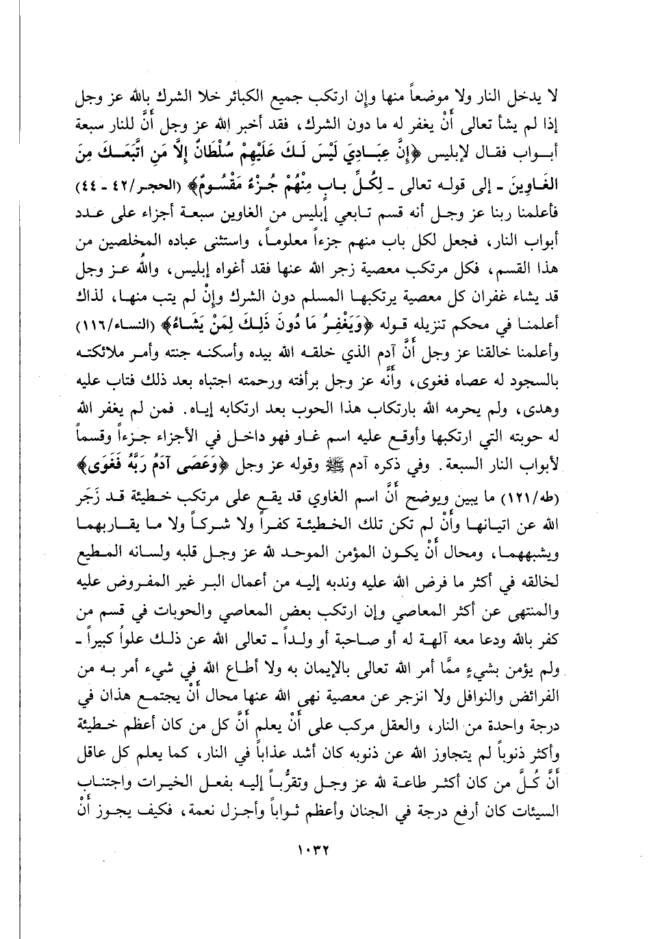 لَا يَدْخُلُ النَّارَ وَلَا مَوْضِعًا مِنْهَا وَإِنِ ارْتَكَبَ جَمِيعَ الْكَبَائِرِ خَلَا الشِّرْكَ بِاللَّهِ عَزَّ وَجَلَّ إِذَا لَمْ يَشَأْ تَعَالَى أَنْ يَغْفِرَ لَهُ مَا دُونَ الشِّرْكِ, فَقَدْ أَخْبَرَ اللَّهُ عَزَّ وَجَلَّ أَنَّ لِلنَّارِ سَبْعَةَ أَبْوَابٍ فَقَالَ لِإِبْلِيسَ: {إِنَّ عِبَادِي لَيْسَ لَكَ عَلَيْهِمْ سُلْطَانٌ إِلَّا مَنِ اتَّبَعَكَ مِنَ الْغَاوِينَ} إِلَى قَوْلِهِ تَعَالَى: {لِكُلِّ بَابٍ مِنْهُمْ جُزْءٌ مَقْسُومٌ} [الْحِجْرِ: 44-42] فَأَعْلَمْنَا رَبُّنَا عَزَّ وَجَلَّ أَنَّهُ قَسَّمَ تَابِعِي إِبْلِيسَ مِنَ الْغَاوِينَ سَبْعَةَ أَجْزَاءَ عَلَى عَدَدِ أَبْوَابِ النَّارِ, فَجَعَلَ لِكُلِّ بَابٍ مِنْهُمْ جُزْءًا مَعْلُومًا, وَاسْتَثْنَى عِبَادَهُ الْمُخْلِصِينَ مِنْ هَذَا الْقِسْمِ, فَكُلُّ مُرْتَكِبٍ مَعْصِيَةً زَجَرَ اللَّهُ عَنْهَا فَقَدْ أَغْوَاهُ إِبْلِيسُ, وَاللَّهُ عَزَّ وَجَلَّ قَدْ يَشَاءُ غُفْرَانَ كُلِّ مَعْصِيَةٍ يَرْتَكِبُهَا الْمُسْلِمُ دُونَ الشِّرْكِ وَإِنْ لَمْ يَتُبْ مِنْهَا, لِذَاكَ أَعْلَمَنَا فِي مُحْكَمِ تَنْزِيلِهِ قَوْلَهُ: {وَيَغْفِرُ مَا دُونَ ذَلِكَ لِمَنْ يَشَاءُ} [النِّسَاءِ: 116] وَأَعْلَمَنَا خَالِقُنَا عَزَّ وَجَلَّ أَنَّ آدَمَ الَّذِي خَلَقَهُ اللَّهُ بِيَدِهِ وَأَسْكَنَهُ جَنَّتَهُ وَأَمْرَ مَلَائِكَتِهِ بِالسُّجُودِ لَهُ عَصَاهُ فَغَوَى, وَأَنَّهُ عَزَّ وَجَلَّ بِرَأْفَتِهِ وَرَحْمَتِهِ اجْتَبَاهُ بَعْدَ ذَلِكَ فَتَابَ عَلَيْهِ وَهَدَى, وَلَمْ يَحْرِمْهُ اللَّهُ بِارْتِكَابِ هَذَا الْحُوبَ بَعْدَ ارْتِكَابِهِ إِيَّاهُ, فَمَنْ لَمْ يَغْفِرِ اللَّهُ لَهُ حَوْبَتَهُ الَّتِي ارْتَكَبَهَا وَأَوْقَعَ عَلَيْهِ اسْمَ غَاوٍ فَهُوَ دَاخِلٌ فِي الْأَجْزَاءِ جُزْءًا وَقِسْمًا لِأَبْوَابِ النَّارِ السَّبْعَةِ. وَفِي ذِكْرِهِ آدَمَ -صَلَّى اللَّهُ عَلَيْهِ وَسَلَّمَ- وَقَوْلِهِ عَزَّ وَجَلَّ: {وَعَصَى آدَمُ رَبَّهُ فَغَوَى} [طه: 121] مَا يُبَيِّنُ وَيُوَضِّحُ أَنَّ اسْمَ الْغَاوِي قَدْ يَقَعُ عَلَى مُرْتَكِبِ خَطِيئَةٍ قَدْ زَجَرَ اللَّهُ عَنِ إِتْيَانِهَا وَأَنْ لَمْ تَكُنْ تِلْكَ الْخَطِيئَةُ كُفْرًا وَلَا شِرْكًا وَلَا مَا يُقَارِبُهُمَا وَيُشْبِهُهُمَا, وَمُحَالٌ أَنْ يَكُونَ الْمُؤْمِنُ الْمُوَحِّدُ لِلَّهِ عَزَّ وَجَلَّ قَلْبُهُ وَلِسَانُهُ الْمُطِيعُ لِخَالِقِهِ فِي أَكْثَرِ مَا فَرَضَ اللَّهُ عَلَيْهِ وَنَدَبَهُ إِلَيْهِ مِنْ أَعْمَالِ الْبِرِّ غَيْرَ الْمَفْرُوضِ عَلَيْهِ وَالْمُنْتَهِي عَنْ أَكْثَرِ الْمَعَاصِي وَإِنِ ارْتَكَبَ بَعْضَ الْمَعَاصِي وَالْحَوْبَاتِ فِي قِسْمِ مَنْ كَفَرَ بِاللَّهِ وَدَعَا مَعَهُ آلِهَةً لَهُ أَوْ صَاحِبَةً أَوْ وَلَدًا -تَعَالَى اللَّهُ عَنْ ذَلِكَ عُلُوًّا كَبِيرًا- وَلَمْ يُؤْمِنْ بِشَيْءٍ مِمَّا أَمَرَ اللَّهُ تَعَالَى بِالْإِيمَانِ بِهِ وَلَا أَطَاعَ اللَّهَ فِي شَيْءٍ أَمَرَ بِهِ مِنَ الْفَرَائِضِ وَالنَّوَافِلِ وَلَا انْزَجَرَ عَنْ مَعْصِيَةٍ نَهَى اللَّهُ عَنْهَا مُحَالٌ أَنْ يَجْتَمِعَ هَذَانِ فِي دَرَجَةٍ وَاحِدَةٍ مِنَ النَّارِ, وَالْعَقْلُ مُرَكَّبٌ عَلَى أَنْ يَعْلَمَ أَنَّ كُلَّ مَنْ كَانَ أَعْظَمَ خَطِيئَةً وَأَكْثَرَ ذُنُوبًا لَمْ يَتَجَاوَزِ اللَّهُ عَنْ ذُنُوبِهِ كَانَ أَشَدَّ عَذَابًا فِي النَّارِ, كَمَا يَعْلَمُ كُلُّ عَاقِلٍ أَنَّ كُلَّ مَنْ كَانَ أَكْثَرَ طَاعَةً لِلَّهِ عَزَّ وَجَلَّ وَتَقَرُّبًا إِلَيْهِ بِفِعْلِ الْخَيْرَاتِ وَاجْتِنَابِ السَّيِّئَاتِ كَانَ أَرْفَعَ دَرَجَةً فِي الْجِنَانِ وَأَعْظَمَ ثَوَابًا وَأَجْزَلَ نِعْمَةً, فَكَيْفَ يَجُوزُ أَنْ