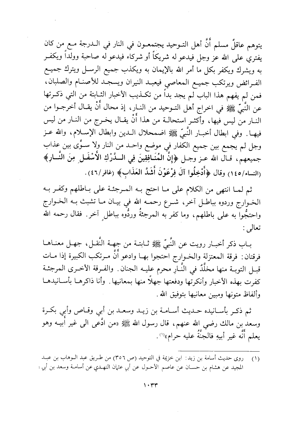 يَتَوَهَّمَ عَاقِلٌ مُسْلِمٌ أَنَّ أَهْلَ التَّوْحِيدِ يَجْتَمِعُونَ فِي النَّارِ فِي الدَّرَجَةِ مَعَ مَنْ كَانَ يَفْتَرِي عَلَى اللَّهِ عَزَّ وَجَلَّ فَيَدْعُو لَهُ شَرِيكًا أَوْ شُرَكَاءَ فَيَدْعُونَ لَهُ صَاحِبَةً وَوَلَدًا وَيَكْفُرُ بِهِ وَيُشْرِكُ وَيَكْفُرُ بِكُلِّ مَا أَمَرَ اللَّهُ بِالْإِيمَانِ بِهِ وَيُكَذِّبُ جَمِيعَ الرُّسُلِ وَيَتْرُكُ جَمِيعَ الْفَرَائِضِ وَيَرْتَكِبُ الْمَعَاصِيَ فَيَعْبُدُ النِّيرَانَ وَيَسْجُدُ لِلْأَصْنَامِ وَالصُّلْبَانِ, فَمَنْ لَمْ يَفْهَمْ هَذَا الْبَابَ لَمْ يَجِدْ بُدًّا مِنْ تَكْذِيبِ الْأَخْبَارِ الثَّابِتَةِ مِنَ الَّتِي ذَكَرْتُهَا عَنِ النَّبِيِّ -صَلَّى اللَّهُ عَلَيْهِ وَسَلَّمَ- فِي إِخْرَاجِ أَهْلِ التَّوْحِيدِ مِنَ النَّارِ, إِذْ مُحَالٌ أَنْ يُقَالَ أَخْرِجُوا مِنَ النَّارِ مَنْ لَيْسَ فِيهَا, وَأَكْثَرُ اسْتِحَالَةً مِنْ هَذَا أَنْ يُقَالَ يَخْرُجُ مِنَ النَّارِ مَنْ لَيْسَ فِيهَا. وَفِي إِبْطَالِ أَخْبَارِ النَّبِيِّ -صَلَّى اللَّهُ عَلَيْهِ وَسَلَّمَ- اضْمِحْلَالُ الدِّينِ وَإِبْطَالُ الْإِسْلَامِ, وَاللَّهُ عَزَّ وَجَلَّ لَمْ يَجْمَعْ بَيْنَ جَمِيعِ الْكُفَّارِ فِي مَوْضِعٍ وَاحِدٍ مِنَ النَّارِ, وَلَا سَوَّى بَيْنِ عَذَابِ جَمِيعِهِمْ, قَالَ اللَّهُ عَزَّ وَجَلَّ: {إِنَّ الْمُنَافِقِينَ فِي الدَّرْكِ الْأَسْفَلِ مِنَ النَّارِ} [النِّسَاءِ: 145] وَقَالَ: {أَدْخِلُوا آلَ فِرْعَوْنَ أَشَدَّ الْعَذَابِ} [غَافِرٍ: 46] .