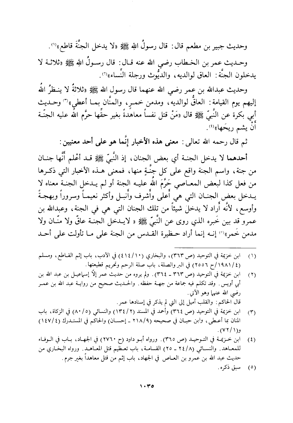 وَحَدِيثَ عَبْدِ اللَّهِ بْنِ عُمَرَ رَضِيَ اللَّهُ عَنْهُمَا قَالَ رَسُولُ اللَّهِ, صَلَّى اللَّهُ عَلَيْهِ وَسَلَّمَ: "ثَلَاثَةٌ لَا يَنْظُرُ اللَّهُ إِلَيْهِمْ يَوْمَ الْقِيَامَةِ: الْعَاقُّ لِوَالِدَيْهِ, وَمُدْمِنُ الْخَمْرِ, وَالْمَنَّانُ بِمَا أَعْطَى" 3 وَحَدِيثُ أَبِي بَكْرَةَ عَنِ النَّبِيِّ -صَلَّى اللَّهُ عَلَيْهِ وَسَلَّمَ- قَالَ: "مَنْ قَتَلَ نَفْسَا مُعَاهِدَةً بِغَيْرِ حَقِّهَا حَرَّمَ اللَّهُ عَلَيْهِ الْجَنَّةَ أَنْ يَشُمَّ رِيحَهَا" 4.