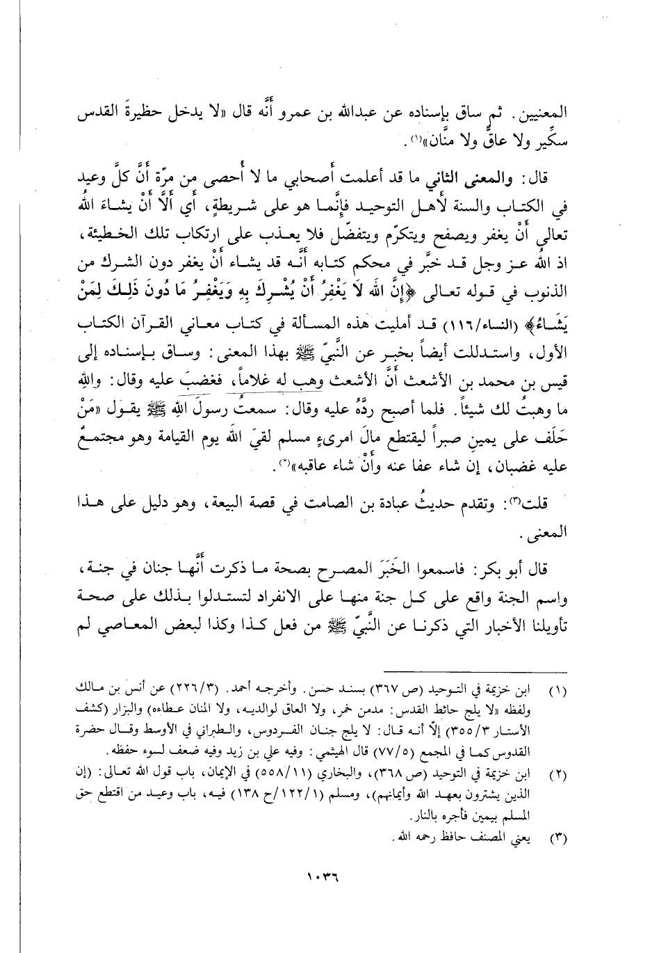 قَالَ: وَالْمَعْنَى الثَّانِي مَا قَدْ أَعْلَمْتُ أَصْحَابِي مَا لَا أُحْصِي مِنْ مَرَّةٍ أَنَّ كُلَّ وَعِيدٍ فِي الْكِتَابِ وَالسُّنَّةِ لِأَهْلِ التَّوْحِيدِ فَإِنَّمَا هُوَ عَلَى شَرِيطَةٍ, أَيْ: إِلَّا أَنْ يَشَاءَ اللَّهُ تَعَالَى أَنْ يَغْفِرَ وَيَصْفَحَ وَيَتَكَرَّمَ وَيَتَفَضَّلَ فَلَا يُعَذِّبُ عَلَى ارْتِكَابِ تِلْكَ الْخَطِيئَةِ, إِذِ اللَّهُ عَزَّ وَجَلَّ قَدْ خَبَّرَ فِي مُحْكَمِ كِتَابِهِ أَنَّهُ قَدْ يَشَاءُ أَنْ يَغْفِرَ دُونَ الشِّرْكِ مِنَ الذُّنُوبِ فِي قَوْلِهِ تَعَالَى: {إِنَّ اللَّهَ لَا يَغْفِرُ أَنْ يُشْرَكَ بِهِ وَيَغْفِرُ مَا دُونَ ذَلِكَ لِمَنْ يَشَاءُ} [النِّسَاءِ: 116] قَدْ أَمْلَيْتُ هَذِهِ الْمَسْأَلَةَ فِي كِتَابِ مَعَانِي الْقُرْآنِ الْكِتَابِ الْأَوَّلِ, وَاسْتَدْلَلْتُ أَيْضًا بِخَبَرٍ عَنِ النَّبِيِّ -صَلَّى اللَّهُ عَلَيْهِ وَسَلَّمَ- بِهَذَا الْمَعْنَى: وَسَاقَ بِإِسْنَادِهِ إِلَى قَيْسِ بْنِ مُحَمَّدِ بْنِ الْأَشْعَثِ أَنَّ الْأَشْعَثَ وَهَبَ لَهُ غُلَامًا, فَغَضِبَ عَلَيْهِ وَقَالَ: وَاللَّهِ مَا وَهَبْتُ لَكَ شَيْئًا. فَلَمَّا أَصْبَحَ رَدَّهُ عَلَيْهِ وَقَالَ: سَمِعْتُ رَسُولَ اللَّهِ -صَلَّى اللَّهُ عَلَيْهِ وَسَلَّمَ- يَقُولُ: "مَنْ حَلَفَ عَلَى يَمِينٍ صَبْرًا لِيَقْتَطِعَ مَالَ امْرِئٍ مُسْلِمٍ لَقِيَ اللَّهَ يَوْمَ الْقِيَامَةِ وَهُوَ مُجْتَمِعٌ عَلَيْهِ غَضْبَانُ, إِنْ شَاءَ عَفَا عَنْهُ وَإِنْ شَاءَ عَاقَبَهُ" 2.