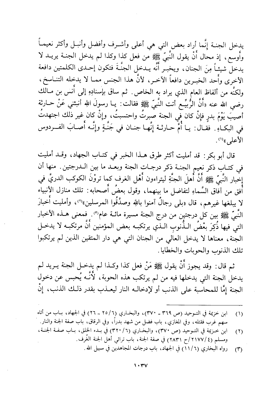 1 ابن خزيمة في التوحيد "ص369-370"، والبخاري "6/ 25-26" في الجهاد، باب من أتاه سهم غرب فقتله، وفي المغازي، باب فضل من شهد بدرا، وفي الرقاق، باب صفة الجنة والنار.