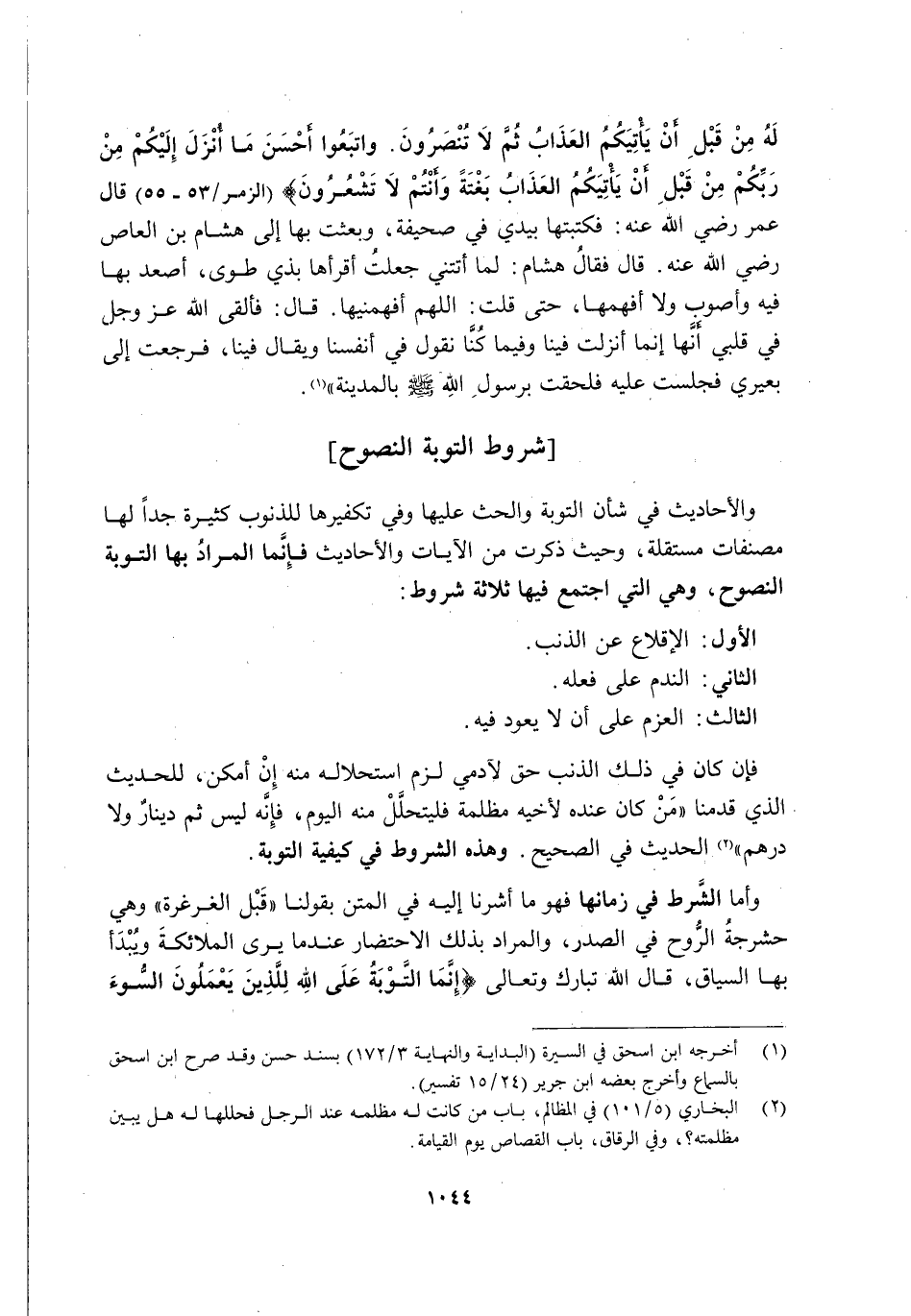 وَالْأَحَادِيثُ فِي شَأْنِ التَّوْبَةِ وَالْحَثِّ عَلَيْهَا وَفِي تَكْفِيرِهَا لِلذُّنُوبِ كَثِيرَةٌ جِدًّا, لَهَا مُصَنَّفَاتٌ مُسْتَقِلَّةٌ, وَحَيْثُ ذُكِرَتْ مِنَ الْآيَاتِ وَالْأَحَادِيثِ فَإِنَّمَا الْمُرَادُ بِهَا التَّوْبَةُ النَّصُوحُ, وَهِيَ الَّتِي اجْتَمَعَ فِيهَا ثَلَاثَةُ شُرُوطٍ: