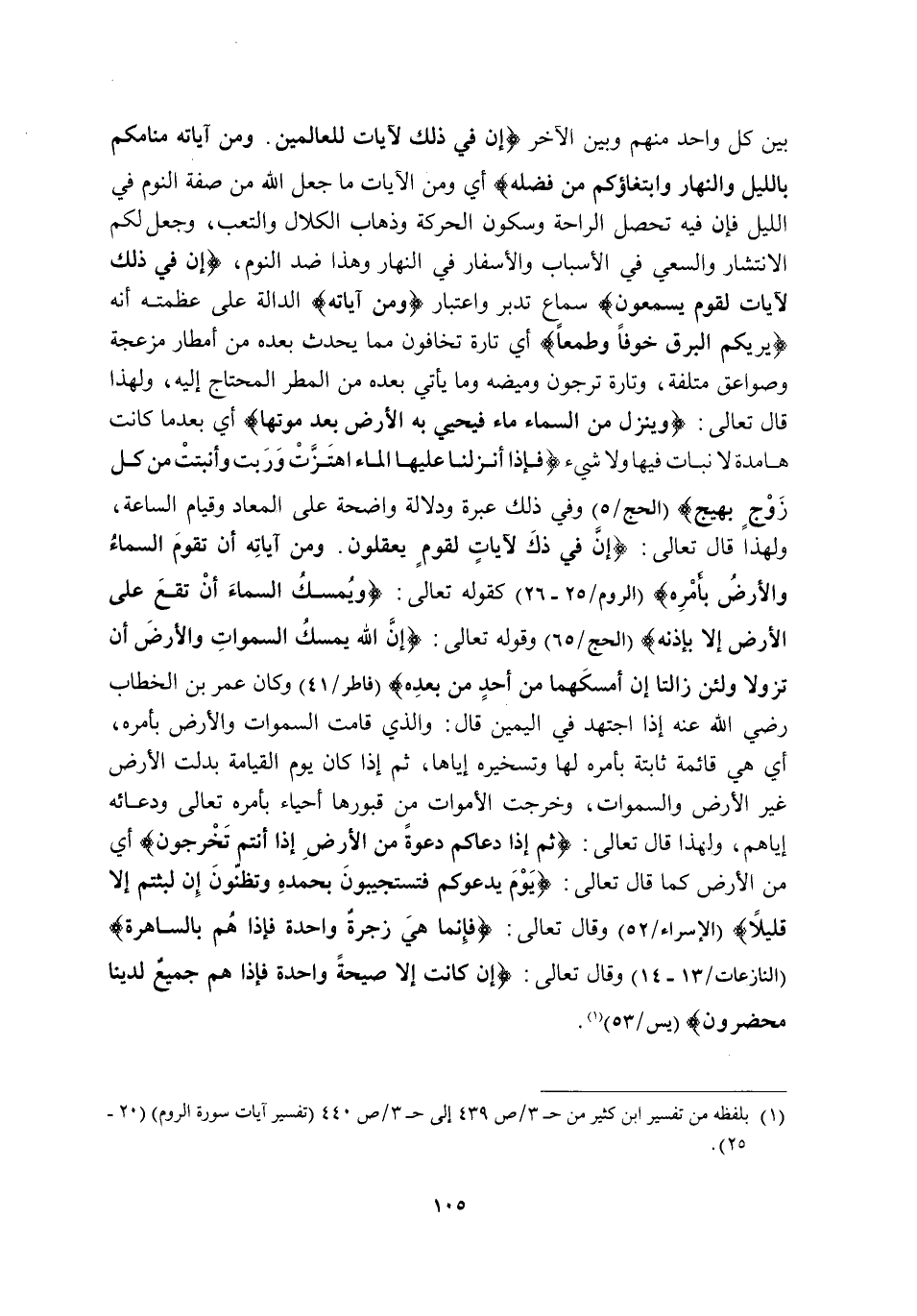 بَيْنَ كُلِّ وَاحِدٍ مِنْهُمْ وَبَيْنَ الْآخَرِ {إِنَّ فِي ذَلِكَ لَآيَاتٍ لِلْعَالِمِينَ، وَمِنْ آيَاتِهِ مَنَامُكُمْ بِاللَّيْلِ وَالنَّهَارِ وَابْتِغَاؤُكُمْ مِنْ فَضْلِهِ} أَيْ: وَمِنَ الْآيَاتِ مَا جَعَلَ اللَّهُ مِنْ صِفَةِ النَّوْمِ فِي اللَّيْلِ فَإِنَّ فِيهِ تَحْصُلُ الرَّاحَةُ وَسُكُونُ الْحَرَكَةِ وَذَهَابُ الْكَلَالِ وَالتَّعَبِ, وَجَعَلَ لَكُمْ الِانْتِشَارَ وَالسَّعْيَ فِي الْأَسْبَابِ وَالْأَسْفَارَ فِي النَّهَارِ وَهَذَا ضِدُّ النَّوْمِ {إِنَّ فِي ذَلِكَ لَآيَاتٍ لِقَوْمٍ يَسْمَعُونَ} سَمَاعَ تَدَبُّرٍ وَاعْتِبَارٍ {وَمِنْ آيَاتِهِ} الدَّالَّةِ عَلَى عَظَمَتِهِ أَنَّهُ {يُرِيكُمُ الْبَرْقَ خَوْفًا وَطَمَعًا} أَيْ: تَارَةً تَخَافُونَ مِمَّا يَحْدُثُ بَعْدَهُ مِنْ أَمْطَارٍ مُزْعِجَةٍ وَصَوَاعِقَ مُتْلِفَةٍ وَتَارَةً تَرْجُونَ وَمِيضَهُ وَمَا يَأْتِي بَعْدَهُ مِنَ الْمَطَرِ الْمُحْتَاجِ إِلَيْهِ, وَلِهَذَا قَالَ تَعَالَى: {وَيُنَزِّلُ مِنَ السَّمَاءِ مَاءً فَيُحْيِي بِهِ الْأَرْضَ بَعْدَ مَوْتِهَا} أي: بعد ما كَانَتْ هَامِدَةً لَا نَبَاتَ فِيهَا وَلَا شَيْءَ {فَإِذَا أَنْزَلْنَا عَلَيْهَا الْمَاءَ اهْتَزَّتْ وَرَبَتْ وَأَنْبَتَتْ مِنْ كُلِّ زَوْجٍ بَهِيجٍ} [الْحَجِّ: 5] وَفِي ذَلِكَ عِبْرَةٌ وَدَلَالَةٌ وَاضِحَةٌ عَلَى الْمَعَادِ وَقِيَامِ السَّاعَةِ وَلِهَذَا قَالَ تَعَالَى: {إِنَّ فِي ذَلِكَ لَآيَاتٍ لِقَوْمٍ يَعْقِلُونَ، وَمِنْ آيَاتِهِ أَنْ تَقُومَ السَّمَاءُ وَالْأَرْضُ بِأَمْرِهِ} [الرُّومِ: 25-26] كَقَوْلِهِ تَعَالَى: {وَيُمْسِكُ السَّمَاءَ أَنْ تَقَعَ عَلَى الْأَرْضِ إِلَّا بِإِذْنِهِ} [الْحَجِّ: 65] وَقَوْلِهِ تَعَالَى: {إِنَّ اللَّهَ يُمْسِكُ السَّمَاوَاتِ وَالْأَرْضَ أَنْ تَزُولَا وَلَئِنْ زَالَتَا إِنْ أَمْسَكَهُمَا مِنْ أَحَدٍ مِنْ بَعْدِهِ} [فَاطِرٍ: 41] وَكَانَ عُمَرُ بْنُ الْخَطَّابِ رَضِيَ اللَّهُ عَنْهُ إِذَا اجْتَهَدَ فِي الْيَمِينِ قَالَ: والذي قامت السموات وَالْأَرْضُ بِأَمْرِهِ أَيْ: هِيَ قَائِمَةٌ ثَابِتَةٌ بِأَمْرِهِ لَهَا وَتَسْخِيرِهِ إِيَّاهَا ثُمَّ إِذَا كَانَ يَوْمُ الْقِيَامَةِ بُدِّلَتِ الْأَرْضُ غير الأرض والسموات وَخَرَجَتِ الْأَمْوَاتُ مِنْ قُبُورِهَا أَحْيَاءً بِأَمْرِهِ تَعَالَى ودعائه إياهم ولهذا قَالَ تَعَالَى: {ثُمَّ إِذَا دَعَاكُمْ دَعْوَةً مِنَ الْأَرْضِ إِذَا أَنْتُمْ تَخْرُجُونَ} أَيْ: مِنَ الْأَرْضِ كَمَا قَالَ تَعَالَى: {يَوْمَ يَدْعُوكُمْ فَتَسْتَجِيبُونَ بِحَمْدِهِ وَتَظُنُّونَ إِنْ لَبِثْتُمْ إِلَّا قَلِيلًا} [الْإِسْرَاءِ: 52] وَقَالَ تَعَالَى: {فَإِنَّمَا هِيَ زَجْرَةٌ وَاحِدَةٌ، فَإِذَا هُمْ بِالسَّاهِرَةِ} [النَّازِعَاتِ: 13-14] وَقَالَ تَعَالَى: {إِنْ كَانَتْ إِلَّا صَيْحَةً وَاحِدَةً فَإِذَا هُمْ جَمِيعٌ لَدَيْنَا مُحْضَرُونَ} [يس: 53] 1.