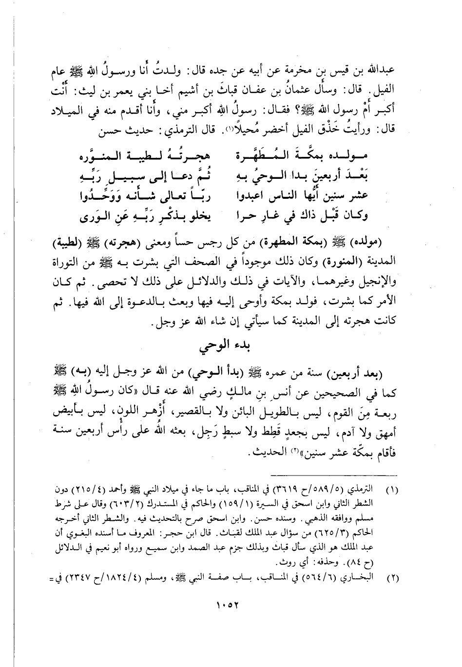 "بَعْدَ أَرْبَعِينَ" سَنَةً مِنْ عُمْرِهِ, صَلَّى اللَّهُ عَلَيْهِ وَسَلَّمَ "بَدَأَ الْوَحْيُ" مِنَ اللَّهِ عَزَّ وَجَلَّ إِلَيْهِ "بِهِ" صَلَّى اللَّهُ عَلَيْهِ وَسَلَّمَ, كَمَا فِي الصَّحِيحَيْنِ عَنْ أَنَسِ بْنِ مَالِكٍ رَضِيَ اللَّهُ عَنْهُ قَالَ: "كَانَ رَسُولُ اللَّهِ -صَلَّى اللَّهُ عَلَيْهِ وَسَلَّمَ- رَبْعَةً مِنَ الْقَوْمِ, لَيْسَ بِالطَّوِيلِ الْبَائِنِ وَلَا بِالْقَصِيرِ, أَزْهَرَ اللَّوْنِ, لَيْسَ بِأَبْيَضَ أَمْهَقَ وَلَا آدَمَ, لَيْسَ بِجَعْدٍ قَطَطٍ وَلَا سَبْطٍ رَجِلٍ, بَعَثَهُ اللَّهُ عَلَى رَأْسِ أَرْبَعِينَ سَنَةً فَأَقَامَ بِمَكَّةَ عَشْرَ سِنِينَ"2 الْحَدِيثَ.