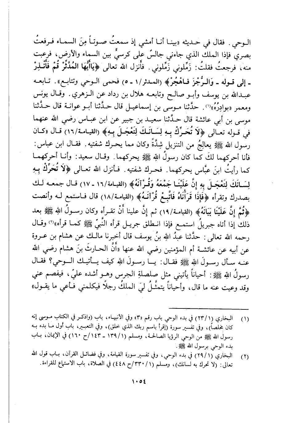 الْوَحْيِ. فَقَالَ فِي حَدِيثِهِ بَيْنَا أَنَا أَمْشِي إِذْ سَمِعْتُ صَوْتًا مِنَ السَّمَاءِ فَرَفَعْتُ بَصَرِي فَإِذَا الْمَلَكُ الَّذِي جَاءَنِي جَالِسٌ عَلَى كُرْسِيٍّ بَيْنَ السَّمَاءِ وَالْأَرْضِ, فَرُعِبْتُ مِنْهُ, فَرَجَعْتُ فَقُلْتُ: زَمِّلُونِي زَمِّلُونِي. فَأَنْزَلَ اللَّهُ تَعَالَى: {يَا أَيُّهَا الْمُدَّثِّرُ قُمْ فَأَنْذِرْ} إِلَى قَوْلِهِ: {وَالرُّجْزَ فَاهْجُرْ} [الْمُدَّثِّرِ: 1-5] فَحَمِيَ الْوَحْيُ وَتَتَابَعَ". تَابَعَهُ عَبْدُ اللَّهِ بْنُ يُوسُفَ وَأَبُو صَالِحٍ وَتَابَعَهُ هِلَالُ بْنُ رَدَّادٍ عَنِ الزُّهْرِيِّ. وَقَالَ يُونُسُ وَمَعْمَرٌ "بَوَادِرُهُ"1. حَدَّثَنَا مُوسَى بْنُ إِسْمَاعِيلَ قَالَ: حَدَّثَنَا أَبُو عَوَانَةَ قَالَ: حَدَّثَنَا مُوسَى بْنُ أَبِي عَائِشَةَ قَالَ: حَدَّثَنَا سَعِيدُ بْنُ جُبَيْرٍ عَنِ ابْنِ عَبَّاسٍ رَضِيَ اللَّهُ عَنْهُمَا فِي قَوْلِهِ تَعَالَى: {لَا تُحَرِّكْ بِهِ لِسَانَكَ لِتَعْجَلَ بِهِ} [الْقِيَامَةِ: 16] قَالَ: "كَانَ رَسُولُ اللَّهِ -صَلَّى اللَّهُ عَلَيْهِ وَسَلَّمَ- يُعَالِجُ مِنَ التَّنْزِيلِ شِدَّةً وَكَانَ مِمَّا يُحَرِّكُ شَفَتَيْهِ. فَقَالَ ابْنُ عَبَّاسٍ: فأنا أحركهما لك كَمَا كَانَ رَسُولُ اللَّهِ -صَلَّى اللَّهُ عَلَيْهِ وَسَلَّمَ- يُحَرِّكُهُمَا. وَقَالَ سَعِيدٌ: وأنا أُحَرِّكُهُمَا كَمَا رَأَيْتُ ابْنَ عَبَّاسٍ يُحَرِّكُهُمَا. فَحَرَّكَ شَفَتَيْهِ. فَأَنْزَلَ اللَّهُ تَعَالَى {لَا تُحَرِّكْ بِهِ لِسَانَكَ لِتَعْجَلَ بِهِ إِنَّ عَلَيْنَا جَمْعَهُ وَقُرْآنَهُ} [الْقِيَامَةِ: 16-17] قَالَ جمعه لك بصدرك وَتَقْرَأُهُ {فَإِذَا قَرَأْنَاهُ فَاتَّبِعْ قُرْآنَهُ} [الْقِيَامَةِ: 18] قَالَ: فَاسْتَمِعْ لَهُ وَأَنْصِتْ {ثُمَّ إِنَّ عَلَيْنَا بَيَانَهُ} [الْقِيَامَةِ: 19] ثُمَّ إِنَّ عَلَيْنَا أَنْ تَقْرَأَهُ وَكَانَ رَسُولُ اللَّهِ -صَلَّى اللَّهُ عَلَيْهِ وَسَلَّمَ- بَعْدَ ذَلِكَ إِذَا أَتَاهُ جِبْرِيلُ اسْتَمَعَ فَإِذَا انْطَلَقَ جِبْرِيلُ قَرَأَهُ النَّبِيُّ -صَلَّى اللَّهُ عَلَيْهِ وَسَلَّمَ- كَمَا قَرَأَهُ"2 وَقَالَ رَحِمَهُ اللَّهُ تَعَالَى: حَدَّثَنَا عَبْدُ اللَّهِ بْنُ يُوسُفَ قَالَ أَخْبَرَنَا مَالِكٌ عَنْ هِشَامِ بْنِ عُرْوَةَ عَنْ أَبِيهِ عَنْ عَائِشَةَ أُمِّ الْمُؤْمِنِينَ رَضِيَ اللَّهُ عَنْهَا: أَنَّ الْحَارِثَ بْنَ هِشَامٍ رَضِيَ عَنْهُ سَأَلَ رَسُولَ اللَّهِ -صَلَّى اللَّهُ عَلَيْهِ وَسَلَّمَ- فَقَالَ: يَا رَسُولَ اللَّهِ كَيْفَ يَأْتِيكَ الْوَحْيُ؟ فَقَالَ رَسُولُ اللَّهِ, صَلَّى اللَّهُ عَلَيْهِ وَسَلَّمَ: "أَحْيَانًا يَأْتِينِي مِثْلَ صَلْصَلَةِ الْجَرَسِ وَهُوَ أَشَدُّهُ عَلَيَّ, فَيُفْصَمُ عَنِّي وَقَدْ وَعَيْتُ عَنْهُ مَا قَالَ, وَأَحْيَانًا يَتَمَثَّلُ لِي الْمَلَكُ رَجُلًا فَيُكَلِّمُنِي فَأَعِي مَا يَقُولُ"