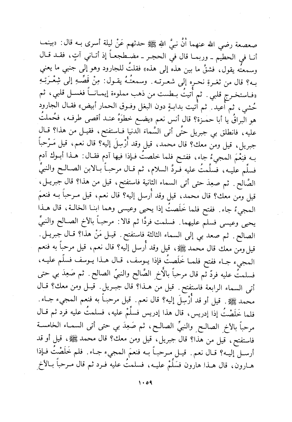 صَعْصَعَةَ رَضِيَ اللَّهُ عَنْهُمَا أَنَّ نَبِيَّ اللَّهِ -صَلَّى اللَّهُ عَلَيْهِ وَسَلَّمَ- حَدَّثَهُمْ عَنْ لَيْلَةِ أُسْرِيَ بِهِ قَالَ: "بَيْنَمَا أَنَا فِي الْحَطِيمِ -وَرُبَّمَا قَالَ فِي الْحِجْرِ- مُضْطَجِعًا إِذْ أَتَانِي آتٍ, فَقَدْ قَالَ وَسَمِعْتُهُ يَقُولُ: فَشَقَّ مَا بَيْنَ هَذِهِ إِلَى هَذِهِ" فَقُلْتُ لِلْجَارُودِ وَهُوَ إِلَى جَنْبِي: مَا يَعْنِي بِهِ؟ قَالَ: مِنْ ثُغْرَةِ نَحْرِهِ إِلَى شِعْرَتِهِ. وَسَمِعْتُهُ يَقُولُ: مِنْ قَصِّهِ إِلَى شِعْرَتِهِ "فَاسْتَخْرَجَ قَلْبِي, ثُمَّ أُتِيتُ بِطَسْتٍ مِنْ ذَهَبٍ مَمْلُوءَةٍ إِيمَانًا فَغُسِلَ قَلْبِي, ثُمَّ حُشِيَ, ثُمَّ أُعِيدَ. ثُمَّ أُتِيتُ بِدَابَّةٍ دُونَ الْبَغْلِ وَفَوْقَ الْحِمَارِ أَبْيَضَ" فَقَالَ الْجَارُودُ: هُوَ الْبُرَاقُ يَا أَبَا حَمْزَةَ؟ قَالَ أَنَسٌ: نَعَمْ. "يَضَعُ خَطْوَهُ عِنْدَ أَقْصَى طَرْفِهِ, فَحُمِلْتُ عَلَيْهِ فَانْطَلَقَ بِي جِبْرِيلُ حَتَّى أَتَى السَّمَاءَ الدُّنْيَا فَاسْتَفْتَحَ, فَقِيلَ: مَنْ هَذَا؟ قَالَ: جِبْرِيلُ. قِيلَ: وَمَنْ مَعَكَ؟ قَالَ: مُحَمَّدٌ. قِيلَ: وقد أُرْسِلَ إِلَيْهِ؟ قَالَ: نَعَمْ. قِيلَ: مَرْحَبًا بِهِ, فَنِعْمَ الْمَجِيءُ جَاءَ. فَفُتِحَ فَلَمَّا خَلَصْتُ فَإِذَا فِيهَا آدَمُ, فَقَالَ: هَذَا أَبُوكَ آدَمُ فَسَلِّمْ عَلَيْهِ. فَسَلَّمْتُ عَلَيْهِ فَرَدَّ السَّلَامَ ثُمَّ قَالَ: مَرْحَبًا بِالِابْنِ الصَّالِحِ وَالنَّبِيِّ الصَّالِحِ. ثُمَّ صَعِدَ حَتَّى أَتَى السَّمَاءَ الثَّانِيَةَ فَاسْتَفْتَحَ, قِيلَ مَنْ هَذَا؟ قَالَ: جِبْرِيلُ. قِيلَ: وَمَنْ مَعَكَ؟ قَالَ: مُحَمَّدٌ. قِيلَ: وقد أُرْسِلَ إِلَيْهِ؟ قَالَ: نَعَمْ. قِيلَ: مَرْحَبًا بِهِ, فَنِعْمَ الْمَجِيءُ جَاءَ. فَفَتَحَ فَلَمَّا خَلَصْتُ إِذَا يَحْيَى وَعِيسَى وَهُمَا ابْنَا الْخَالَةِ, قَالَ: هَذَا يَحْيَى وَعِيسَى فَسَلِّمْ عَلَيْهِمَا. فَسَلَّمْتُ فَرَدَّا ثُمَّ قَالَا: مَرْحَبًا بِالْأَخِ الصَّالِحِ وَالنَّبِيِّ الصَّالِحِ. ثُمَّ صَعِدَ بِي إِلَى السَّمَاءِ الثَّالِثَةِ فَاسْتَفْتَحَ قِيلَ: مَنْ هَذَا؟ قَالَ: جِبْرِيلُ. قِيلَ: وَمَنْ مَعَكَ؟ قَالَ: مُحَمَّدٌ -صَلَّى اللَّهُ عَلَيْهِ وَسَلَّمَ- قِيلَ: وقد أُرْسِلَ إِلَيْهِ؟ قَالَ: نَعَمْ. قِيلَ: مَرْحَبًا بِهِ فَنِعْمَ الْمَجِيءُ جَاءَ. فَفُتِحَ فَلَمَّا خَلَصْتُ فَإِذَا يُوسُفُ قَالَ: هَذَا يُوسُفُ, فَسَلِّمْ عَلَيْهِ. فَسَلَّمْتُ عَلَيْهِ فَرَدَّ ثُمَّ قَالَ: مَرْحَبًا بِالْأَخِ الصَّالِحِ وَالنَّبِيِّ الصَّالِحِ. ثُمَّ صَعِدَ بِي حَتَّى أَتَى السَّمَاءَ الرَّابِعَةَ فَاسْتَفْتَحَ قِيلَ: مَنْ هَذَا؟ قَالَ: جِبْرِيلُ. قِيلَ: وَمَنْ مَعَكَ؟ قَالَ: محمد -صَلَّى اللَّهُ عَلَيْهِ وَسَلَّمَ- قيل: أوقد أُرْسِلَ إِلَيْهِ؟ قَالَ: نَعَمْ. قِيلَ: مَرْحَبًا بِهِ, فَنِعْمَ الْمَجِيءُ جَاءَ. فلما خلصت إذا إِدْرِيسَ قَالَ: هَذَا إِدْرِيسُ فَسَلِّمْ عَلَيْهِ. فَسَلَّمْتُ عَلَيْهِ فَرَدَّ ثُمَّ قَالَ: مَرْحَبًا بِالْأَخِ الصَّالِحِ وَالنَّبِيِّ الصَّالِحِ. ثُمَّ صَعِدَ بِي حَتَّى أَتَى السَّمَاءَ الْخَامِسَةَ فَاسْتَفْتَحَ قِيلَ مَنْ هَذَا؟ قَالَ: جِبْرِيلُ. قِيلَ: وَمَنْ مَعَكَ؟ قَالَ: محمد -صَلَّى اللَّهُ عَلَيْهِ وَسَلَّمَ- قيل: أوقد أُرْسِلَ إِلَيْهِ؟ قَالَ: نَعَمْ. قِيلَ: مَرْحَبًا بِهِ, فَنِعْمَ المجيء جاء. فلم خَلَصْتُ فَإِذَا هَارُونُ قَالَ: هَذَا هَارُونُ فَسَلِّمْ عَلَيْهِ. فَسَلَّمْتُ عَلَيْهِ فَرَدَّ ثُمَّ قَالَ: مَرْحَبًا بِالْأَخِ