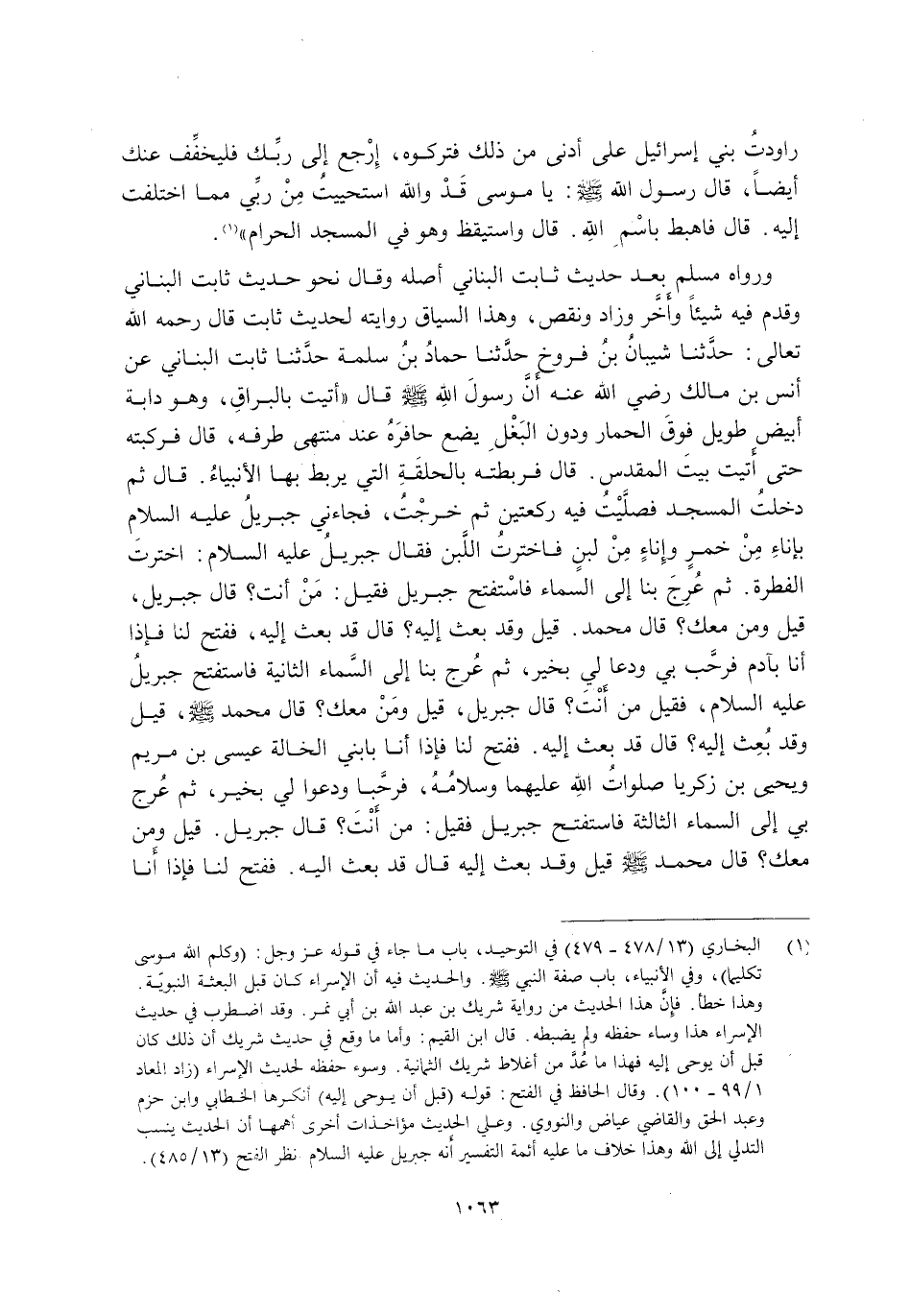 1 البخاري "13/ 478-479" في التوحيد، باب ما جاء في قوله عز وجل: {وَكَلَّمَ اللَّهُ مُوسَى تَكْلِيمًا} ، وفي الأنبياء, باب صفة النبي صَلَّى اللَّهُ عَلَيْهِ وَسَلَّمَ. والحديث فيه أن الإسراء كان قبل البعثة النبوية. وهذا خطأ. فإن هذا الحديث من رواية شريك بن عبد الله بن أبي نمر. وقد اضطرب في حديث الإسراء هذا وساء حفظه ولم يضبطه. قال ابن القيم: وأما ما وقع في حديث شريك أن ذلك كان قبل أن يوحى إليه فهذا ما عُد من أغلاط شريك الثمانية. وسوء حفظه لحديث الإسراء "زاد المعاد 1/ 99-100". وقال الحافظ في الفتح: قوله "قبل أن يوحى إليه" أنكرها الخطابي وابن حزم وعبد الحق والقاضي عياض والنووي. وعلى الحديث مؤاخذات أخرى أهمها أن الحديث ينسب التدلي إلى الله وهذا خلاف ما عليه أئمة التفسير أنه جبريل عليه السلام انظر الفتح "13/ 485".