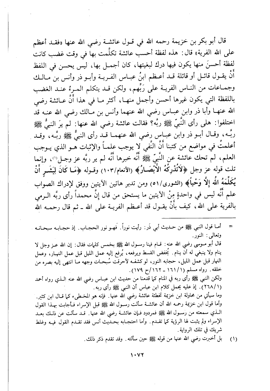 قَالَ أَبُو بَكْرِ بْنِ خُزَيْمَةَ رَحِمَهُ اللَّهُ فِي قَوْلِ عَائِشَةَ رَضِيَ اللَّهُ عَنْهَا "فَقَدْ أَعْظَمَ عَلَى اللَّهِ الْفِرْيَةَ" قَالَ: هَذِهِ لَفْظَةٌ أَحْسَبُ عَائِشَةَ تَكَلَّمَتْ بِهَا فِي وَقْتِ غَضَبٍ, كَانَتْ لَفْظَةٌ أَحْسَنَ مِنْهَا يَكُونُ فِيهَا دَرْكٌ لِبُغْيَتِهَا, كَانَ أَجْمَلَ بِهَا, لَيْسَ يَحْسُنُ فِي اللَّفْظِ أَنْ يَقُولَ قَائِلٌ أَوْ قَائِلَةٌ قَدْ أَعْظَمَ ابْنُ عَبَّاسٍ الْفِرْيَةَ وَأَبُو ذَرٍّ وَأَنَسُ بْنُ مَالِكٍ وَجَمَاعَاتٌ مِنَ النَّاسِ الْفِرْيَةَ عَلَى رَبِّهِمْ, وَلَكِنْ قَدْ يَتَكَلَّمُ الْمَرْءُ عِنْدَ الْغَضَبِ بِاللَّفْظَةِ الَّتِي يَكُونُ غَيْرُهَا أَحْسَنَ وَأَجْمَلَ مِنْهَا, أَكْثَرُ مَا فِي هَذَا أَنَّ عَائِشَةَ رَضِيَ اللَّهُ عَنْهَا وَأَبَا ذَرٍّ وَابْنَ عَبَّاسٍ رَضِيَ اللَّهُ عَنْهُمَا وَأَنَسَ بْنَ مَالِكٍ رَضِيَ اللَّهُ عَنْهُ قَدِ اخْتَلَفُوا: هَلْ رَأَى النَّبِيُّ -صَلَّى اللَّهُ عَلَيْهِ وَسَلَّمَ- رَبَّهُ؟ فَقَالَتْ عَائِشَةُ رَضِيَ اللَّهُ عَنْهَا: لَمْ يَرَ النَّبِيُّ -صَلَّى اللَّهُ عَلَيْهِ وَسَلَّمَ- رَبَّهُ, وَقَالَ أَبُو ذَرٍّ وَابْنُ عَبَّاسٍ رَضِيَ اللَّهُ عَنْهُمَا: قَدْ رَأَى النَّبِيُّ -صَلَّى اللَّهُ عَلَيْهِ وَسَلَّمَ- رَبَّهُ, وَقَدْ أَعْلَمْتُ فِي مَوَاضِعَ مِنْ كُتُبِنَا أَنَّ النَّفْيَ لَا يُوجِبُ عِلْمًا, وَالْإِثْبَاتَ هُوَ الَّذِي يُوجِبُ الْعِلْمَ. لَمْ تَحْكِ عَائِشَةُ عَنِ النَّبِيِّ -صَلَّى اللَّهُ عَلَيْهِ وَسَلَّمَ- أَنَّهُ خَبَّرَهَا أَنَّهُ لَمْ يَرَ رَبَّهُ عَزَّ وَجَلَّ1, وَإِنَّمَا تَلَتْ قَوْلَهُ عَزَّ وَجَلَّ: {لَا تُدْرِكُهُ الْأَبْصَارُ} [الْأَنْعَامِ: 103] وَقَوْلَهُ: {وَمَا كَانَ لِبَشَرٍ أَنْ يُكَلِّمَهُ اللَّهُ إِلَّا وَحْيًا} [الشُّورَى: 51] وَمَنْ تَدَبَّرَ هَاتَيْنِ الْآيَتَيْنِ وَوُفِّقَ لِإِدْرَاكِ الصَّوَابِ عَلِمَ أَنَّهُ لَيْسَ فِي وَاحِدَةٍ مِنَ الْآيَتَيْنِ مَا يَسْتَحِقُّ مَنْ قال إن محمد رَأَى رَبَّهُ الرَّمْيَ بِالْفِرْيَةِ عَلَى اللَّهِ, كَيْفَ بِأَنْ يَقُولَ قَدْ أَعْظَمَ الْفَرْيَةَ عَلَى اللَّهِ, ثُمَّ قَالَ رَحِمَهُ اللَّهُ