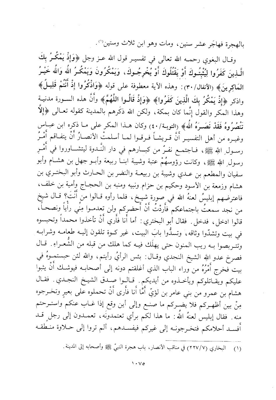 وَقَالَ الْبَغَوِيُّ رَحِمَهُ اللَّهُ تَعَالَى فِي تَفْسِيرِ قَوْلِ اللَّهِ عَزَّ وَجَلَّ: {وَإِذْ يَمْكُرُ بِكَ الَّذِينَ كَفَرُوا لِيُثْبِتُوكَ أَوْ يَقْتُلُوكَ أَوْ يُخْرِجُوكَ وَيَمْكُرُونَ وَيَمْكُرُ اللَّهُ وَاللَّهُ خَيْرُ الْمَاكِرِينَ} [الْأَنْفَالِ: 30] وَهَذِهِ الْآيَةُ مَعْطُوفَةٌ عَلَى قَوْلِهِ: {وَاذْكُرُوا إِذْ أَنْتُمْ قَلِيلٌ} وَاذْكُرْ {وَإِذْ يَمْكُرُ بِكَ الَّذِينَ كَفَرُوا} {وَإِذْ قَالُوا اللَّهُمَّ} وَأَنَّ هَذِهِ السُّورَةَ مَدَنِيَّةٌ, وَهَذَا الْمَكْرُ وَالْقَوْلُ إِنَّمَا كَانَ بِمَكَّةَ, وَلَكِنَّ اللَّهَ ذَكَرَهُمْ بِالْمَدِينَةِ كَقَوْلِهِ تَعَالَى: {إِلَّا تَنْصُرُوهُ فَقَدْ نَصَرَهُ اللَّهُ} [التَّوْبَةِ: 40] وَكَانَ هَذَا الْمَكْرُ عَلَى مَا ذَكَرَهُ ابْنُ عَبَّاسٍ وَغَيْرُهُ مِنْ أَهْلِ التَّفْسِيرِ أَنَّ قُرَيْشًا فَرِقُوا لَمَّا أَسْلَمَتِ الْأَنْصَارُ أَنْ يَتَفَاقَمَ أَمْرُ رَسُولِ اللَّهِ -صَلَّى اللَّهُ عَلَيْهِ وَسَلَّمَ- فَاجْتَمَعَ نَفَرٌ مِنْ كِبَارِهِمْ فِي دَارِ النَّدْوَةِ لِيَتَشَاوَرُوا فِي أَمْرِ رَسُولِ اللَّهِ -صَلَّى اللَّهُ عَلَيْهِ وَسَلَّمَ- وَكَانَتْ رُءُوسُهُمْ عَتَبَةُ وَشَيْبَةُ ابْنَا رَبِيعَةَ وَأَبُو جَهِلَ بْنُ هِشَامٍ وَأَبُو سُفْيَانَ وَالْمُطْعَمُ بْنُ عَدِيٍّ وَشَيْبَةُ بْنُ رَبِيعَةَ وَالنَّضْرُ بْنُ الْحَارِثِ وَأَبُو الْبَخْتَرِيُّ بْنُ هِشَامٍ وَزَمْعَةُ بْنُ الْأَسْوَدِ وَحَكِيمُ بْنُ حِزَامٍ وَنَبِيهٌ وَمُنَبِّهُ بْنُ الْحَجَّاجِ وَأُمَيَّةُ بْنُ خَلَفٍ, فَاعْتَرَضَهُمْ إِبْلِيسُ لَعَنَهُ اللَّهُ فِي صُورَةِ شَيْخٍ, فَلَمَّا رَأَوْهُ قَالُوا: مَنْ أَنْتَ؟ قَالَ: شَيْخٌ مِنْ نَجْدٍ سَمِعْتُ بِاجْتِمَاعِكُمْ فَأَرَدْتُ أَنْ أَحْضُرَكُمْ وَلَنْ تُعْدَمُوا مِنِّي رَأْيًا وَنُصْحًا. قَالُوا: ادْخُلْ فَدَخَلَ, فَقَالَ أَبُو الْبَخْتَرِيُّ: أَمَّا أَنَا فَأَرَى أن تأخذوا محمد وَتَحْبِسُوهُ فِي بَيْتٍ وَتَشُدُّوا وِثَاقَهُ, وَتَسُدُّوا بَابَ الْبَيْتِ, غَيْرَ كَوَّةٍ تُلْقُونَ إِلَيْهِ طَعَامَهُ وَشَرَابَهُ وَتَتَرَبَّصُوا بِهِ رَيْبَ الْمَنُونِ حَتَّى يَهْلَكَ فِيهِ كَمَا هَلَكَ مَنْ قَبْلَهُ مِنَ الشُّعَرَاءِ, قَالَ: فَصَرَخَ عَدُوُّ اللَّهِ الشَّيْخُ النَّجْدِيُّ, وَقَالَ: بِئْسَ الرَّأْيُ رَأَيْتُمْ, وَاللَّهِ لَئِنْ حَبَسْتُمُوهُ فِي بَيْتٍ فَخَرَجَ أَمَرُهُ مِنْ وَرَاءِ الْبَابِ الَّذِي أَغْلَقْتُمْ دُونَهُ إِلَى أَصْحَابِهِ فَيُوشِكُ أَنْ يَثِبُوا عَلَيْكُمْ وَيُقَاتِلُوكُمْ وَيَأْخُذُوهُ مِنْ أَيْدِيكُمْ. قَالُوا: صَدَقَ الشَّيْخُ النَّجْدِيُّ, فَقَالَ هِشَامُ بْنُ عَمْرٍو مِنْ بَنِي عَامِرِ بْنِ لُؤَيٍّ: أَمَّا أَنَا فَأَرَى أَنْ تَحْمِلُوهُ عَلَى بَعِيرٍ وَتُخْرِجُوهُ مِنْ بَيْنِ أَظْهُرِكُمْ فَلَا يَضُرُّكُمْ مَا صَنَعَ وَإِلَى أَيْنَ وَقَعَ إِذَا غَابَ عَنْكُمْ وَاسْتَرَحْتُمْ مِنْهُ. فَقَالَ إِبْلِيسُ لَعَنَهُ اللَّهُ: مَا هَذَا لَكُمْ بِرَأْيٍ تَعْتَمِدُونَهُ, تَعْمِدُونَ إِلَى رَجُلٍ قَدْ أَفْسَدَ أَحْلَامَكُمْ فَتُخْرِجُونَهُ إِلَى غَيْرِكُمْ فَيُفْسِدُهُمْ, أَلَمْ تَرَوْا إِلَى حَلَاوَةِ مَنْطِقِهِ
