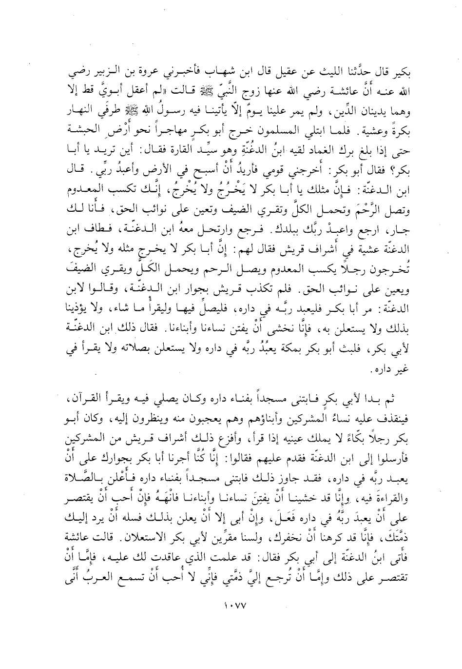 بُكَيْرٍ قَالَ: حَدَّثَنَا اللَّيْثُ عَنْ عُقَيْلٍ قَالَ: ابْنُ شِهَابٍ فَأَخْبَرَنِي عُرْوَةُ بْنُ الزُّبَيْرِ رَضِيَ اللَّهُ عَنْهُ أَنَّ عَائِشَةَ رَضِيَ اللَّهُ عَنْهَا زَوْجَ النَّبِيِّ -صَلَّى اللَّهُ عَلَيْهِ وَسَلَّمَ- قَالَتْ: "لَمْ أَعْقِلْ أَبَوَيَّ قَطُّ إِلَّا وَهُمَا يَدِينَانِ الدِّينَ, وَلَمْ يَمُرَّ عَلَيْنَا يَوْمٌ إِلَّا يَأْتِينَا فِيهِ رَسُولُ اللَّهِ -صَلَّى اللَّهُ عَلَيْهِ وَسَلَّمَ- طَرَفَيِ النَّهَارِ بُكْرَةً وَعَشِيَّةً, فَلَمَّا ابْتُلِيَ الْمُسْلِمُونَ خَرَجَ أَبُو بَكْرٍ مُهَاجِرًا نَحْوَ أَرْضِ الْحَبَشَةِ حَتَّى إِذَا بَلَغَ بِرْكَ الْغِمَادِ لَقِيَهُ ابْنُ الدَّغِنَةِ وَهُوَ سَيِّدُ الْقَارَةِ فَقَالَ: أَيْنَ تُرِيدُ يَا أَبَا بَكْرٍ؟ فَقَالَ أَبُو بَكْرٍ: أَخْرَجَنِي قَوْمِي فأريد أن أسبح فِي الْأَرْضِ وَأَعْبُدَ رَبِّي. قَالَ ابْنُ الدَّغِنَةِ: فَإِنَّ مِثْلَكَ يَا أَبَا بَكْرٍ لَا يَخْرُجُ وَلَا يُخْرَجُ, إِنَّكَ تَكْسِبُ الْمَعْدُومَ وَتَصِلُ الرَّحِمَ وَتَحْمِلُ الْكَلَّ وَتَقْرِي الضَّيْفَ وتعين على النوائب الْحَقِّ. فَأَنَا لَكَ جَارٌ, ارْجِعْ وَاعْبُدْ رَبَّكَ بِبَلَدِكَ. فَرَجَعَ وَارْتَحَلَ مَعَهُ ابْنُ الدَّغِنَةِ, فَطَافَ ابْنُ الدَّغِنَةِ عَشِيَّةً فِي أَشْرَافِ قُرَيْشٍ فَقَالَ لَهُمْ: إِنَّ أَبَا بَكْرٍ لَا يَخْرُجُ مِثْلُهُ وَلَا يُخْرَجُ, تُخْرِجُونَ رَجُلًا يُكْسِبُ الْمَعْدُومَ وَيَصِلُ الرَّحِمَ وَيَحْمِلُ الْكَلَّ وَيَقْرِي الضَّيْفَ وَيُعِينُ عَلَى نَوَائِبِ الْحَقِّ. فَلَمْ تُكَذِّبْ قُرَيْشٌ بِجِوَارِ ابْنِ الدَّغِنَةِ. وَقَالُوا: لِابْنِ الدَّغِنَةِ مُرْ أَبَا بَكْرٍ فَلْيَعْبُدْ رَبَّهُ فِي دَارِهِ, فَلْيُصَلِّ فِيهَا وَلْيَقْرَأْ مَا شَاءَ, وَلَا يُؤْذِينَا بِذَلِكَ وَلَا يَسْتَعْلِنْ بِهِ, فَإِنَّا نَخْشَى أَنْ يَفْتِنَ نِسَاءَنَا وَأَبْنَاءَنَا, فَقَالَ ذَلِكَ ابْنُ الدَّغِنَةِ لِأَبِي بَكْرٍ, فَلَبِثَ أَبُو بَكْرٍ بِمَكَةَ يَعْبُدُ رَبَّهُ فِي دَارِهِ وَلَا يَسْتَعْلِنُ بِصَلَاتِهِ, وَلَا يَقْرَأُ فِي غَيْرِ دَارِهِ.