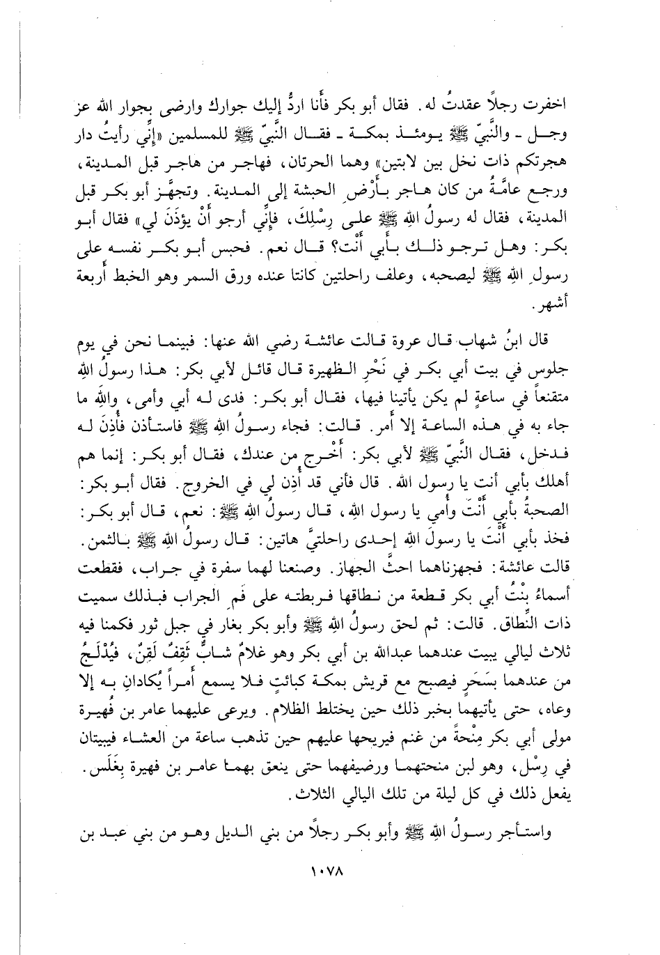قَالَ ابْنُ شِهَابٍ: قَالَ عُرْوَةُ: قَالَتْ عَائِشَةُ رَضِيَ اللَّهُ عَنْهَا: فَبَيْنَمَا نحن في يوم جُلُوسٌ فِي بَيْتِ أَبِي بَكْرٍ فِي نَحْرِ الظَّهِيرَةِ قَالَ قَائِلٌ لِأَبِي بَكْرٍ: هَذَا رَسُولُ اللَّهِ مُتَقَنِّعًا فِي سَاعَةٍ لَمْ يَكُنْ يَأْتِينَا فِيهَا, فَقَالَ أَبُو بَكْرٍ: فِدَى لَهُ أَبِي وَأُمِّي, وَاللَّهِ مَا جَاءَ بِهِ فِي هَذِهِ السَّاعَةِ إِلَّا أَمْرٌ. قَالَتْ: فَجَاءَ رَسُولُ اللَّهِ -صَلَّى اللَّهُ عَلَيْهِ وَسَلَّمَ- فَاسْتَأْذَنَ فَأُذِنَ لَهُ فَدَخَلَ, فَقَالَ النَّبِيُّ -صَلَّى اللَّهُ عَلَيْهِ وَسَلَّمَ- لِأَبِي بَكْرٍ: "أَخْرِجْ مَنْ عِنْدَكَ" فَقَالَ أَبُو بَكْرٍ: إِنَّمَا هُمْ أَهْلُكَ بأبي أنت وأمي يَا رَسُولَ اللَّهِ. قَالَ: "فَإِنِّي قَدْ أُذِنَ لِي فِي الْخُرُوجِ" فَقَالَ أَبُو بَكْرٍ: الصُّحْبَةُ بأبي أنت وأمي يَا رَسُولَ اللَّهِ. قَالَ رَسُولُ اللَّهِ, صَلَّى اللَّهُ عَلَيْهِ وَسَلَّمَ: "نَعَمْ" قَالَ أَبُو بَكْرٍ: فَخُذْ بأبي أنت وأمي يَا رَسُولَ اللَّهِ إِحْدَى رَاحِلَتَيَّ هَاتَيْنِ: قَالَ رَسُولُ اللَّهِ, صَلَّى اللَّهُ عَلَيْهِ وَسَلَّمَ: "بِالثَّمَنِ". قَالَتْ عَائِشَةُ: فَجَهَّزْنَاهُمَا أَحَثَّ الْجِهَازِ, وَصَنَعْنَا لَهُمَا سُفْرَةً فِي جِرَابٍ, فَقَطَعَتْ أَسْمَاءُ بِنْتُ أَبِي بَكْرٍ قِطْعَةً مِنْ نِطَاقِهَا فَرَبَطَتْهُ عَلَى فَمِ الْجِرَابِ فَبِذَلِكَ سميت ذات النطاق. قَالَتْ: ثُمَّ لَحِقَ رَسُولُ اللَّهِ -صَلَّى اللَّهُ عَلَيْهِ وَسَلَّمَ- وَأَبُو بَكْرٍ بِغَارٍ فِي جَبَلِ ثَوْرٍ, فَكَمَنَا فيه ثلاث ليالي يَبِيتُ عِنْدَهُمَا عَبْدُ اللَّهِ بْنُ أَبِي بَكْرٍ وَهُوَ غُلَامٌ شَابٌّ ثَقِفٌ لَقِنٌ, فَيُدْلِجُ مِنْ عِنْدِهِمَا بِسَحَرٍ فَيُصْبِحُ مَعَ قُرَيْشٍ بِمَكَّةَ كَبَائِتٍ فَلَا يسمع أمرا يكادان بِهِ إِلَّا وَعَاهُ حَتَّى يَأْتِيَهُمَا بِخَبَرِ ذَلِكَ حِينَ يَخْتَلِطُ الظَّلَامُ, وَيَرْعَى عَلَيْهِمَا عَامِرُ بْنُ فُهَيْرَةَ مَوْلَى أَبِي بَكْرٍ مِنْحَةً مِنْ غنم فيريحها عليهم حِينَ تَذْهَبُ سَاعَةٌ مِنَ الْعِشَاءِ فَيَبِيتَانِ فِي رِسْلٍ, وَهُوَ لَبَنُ مِنْحَتِهِمَا وَرَضِيفِهِمَا حتى ينعق بهما عَامِرُ بْنُ فُهَيْرَةَ بِغَلَسٍ. يَفْعَلُ ذَلِكَ فِي كُلِّ لَيْلَةٍ من تلك اليالي الثَّلَاثِ.