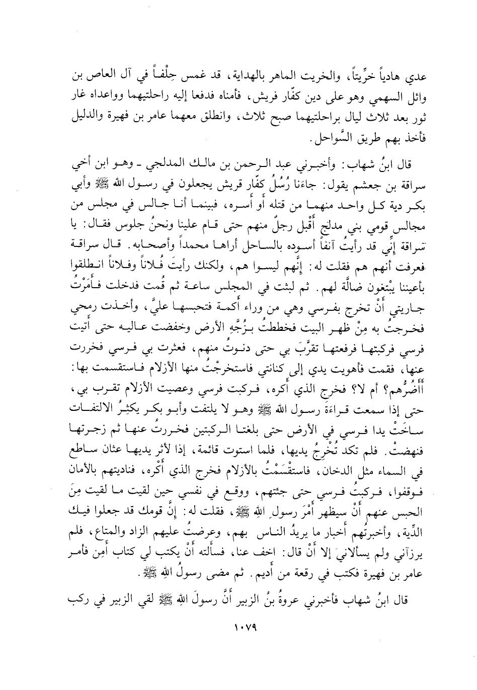 قَالَ ابْنُ شِهَابٍ: وَأَخْبَرَنِي عَبْدُ الرَّحْمَنِ بْنُ مَالِكٍ الْمُدْلِجِيُّ, وَهُوَ ابْنُ أَخِي سُرَاقَةَ بْنِ جُعْشُمٍ يَقُولُ: جَاءَنَا رُسُلُ كُفَّارِ قُرَيْشٍ يَجْعَلُونَ فِي رَسُولِ اللَّهِ -صَلَّى اللَّهُ عَلَيْهِ وَسَلَّمَ- وَأَبِي بَكْرٍ دِيَةَ كُلِّ وَاحِدٍ مِنْهُمَا مَنْ قَتَلَهُ أَوْ أَسَرَهُ, فَبَيْنَمَا أَنَا جَالِسٌ فِي مَجْلِسٍ مِنْ مَجَالِسِ قَوْمِي بَنِي مُدْلِجٍ أَقْبَلَ رَجُلٌ مِنْهُمْ حَتَّى قَامَ عَلَيْنَا وَنَحْنُ جُلُوسٌ, فَقَالَ: يَا سُرَاقَةُ إِنِّي قَدْ رَأَيْتُ آنِفًا أَسْوِدَةً بِالسَّاحِلِ أُرَاهَا مُحَمَّدًا وَأَصْحَابَهُ, قَالَ سُرَاقَةُ: فَعَرَفْتُ أَنَّهُمْ هُمْ فَقُلْتُ لَهُ: إِنَّهُمْ لَيْسُوا هُمْ, وَلَكِنَّكَ رَأَيْتَ فُلَانًا وَفُلَانًا, انْطَلَقُوا بِأَعْيُنِنَا يَبْتَغُونَ ضَالَّةً لَهُمْ. ثُمَّ لَبِثْتُ فِي الْمَجْلِسِ سَاعَةً ثُمَّ قُمْتُ فَدَخَلْتُ فَأَمَرْتُ جَارِيَتِي أَنْ تَخْرُجَ بِفَرَسِي وَهِيَ مِنْ وَرَاءِ أَكَمَةٍ فَتَحْبِسَهَا عَلَيَّ, وَأَخَذْتُ رُمْحِي فَخَرَجْتُ بِهِ مِنْ ظهر البيت فخططت بِزُجِّهِ الْأَرْضَ وَخَفَضْتُ عَالِيَهُ حَتَّى أَتَيْتُ فَرَسِي فَرَكِبْتُهَا فَرَفَعْتُهَا تُقَرِّبُ بِي حَتَّى دَنَوْتُ مِنْهُمْ, فَعَثَرَتْ بِي فَرَسِي فَخَرَرْتُ عَنْهَا, فَقُمْتُ فَأَهْوَيْتُ يَدِي إِلَى كِنَانَتِي فَاسْتَخْرَجْتُ مِنْهَا الْأَزْلَامَ فَاسْتَقْسَمْتُ بِهَا: أَأَضُرُّهُمْ؟ أَمْ لَا؟ فَخَرَجَ الَّذِي أَكْرَهُ, فَرَكِبْتُ فَرَسِي وَعَصَيْتُ الْأَزْلَامَ تُقَرِّبُ بِي, حَتَّى إِذَا سَمِعْتُ قِرَاءَةَ رَسُولِ اللَّهِ -صَلَّى اللَّهُ عَلَيْهِ وَسَلَّمَ- وَهُوَ لَا يَلْتَفِتُ, وَأَبُو بَكْرٍ يُكْثِرُ الِالْتِفَاتَ سَاخَتْ يَدَا فَرَسِي فِي الْأَرْضِ حَتَّى بَلَغَتَا الرُّكْبَتَيْنِ فَخَرَرْتُ عَنْهَا ثُمَّ زَجَرْتُهَا فَنَهَضَتْ. فَلَمْ تَكَدْ تُخْرِجُ يَدَيْهَا, فَلَمَّا استوت قائمة, إذ لِأَثَرِ يَدَيْهَا عُثَانٌ سَاطِعٌ فِي السَّمَاءِ مِثْلُ الدُّخَانِ, فَاسْتَقْسَمْتُ بِالْأَزْلَامِ فَخَرَجَ الَّذِي أَكْرَهُ, فَنَادَيْتُهُمْ بِالْأَمَانِ فَوَقَفُوا, فَرَكِبْتُ فَرَسِي حَتَّى جِئْتُهُمْ, وَوَقَعَ فِي نَفْسِي حِينَ لَقِيتُ مَا لَقِيتُ مِنَ الْحَبْسِ عَنْهُمْ أَنْ سَيَظْهَرُ أَمْرُ رَسُولِ اللَّهِ -صَلَّى اللَّهُ عَلَيْهِ وَسَلَّمَ- فَقُلْتُ لَهُ: إِنَّ قَوْمَكَ قَدْ جَعَلُوا فِيكَ الدِّيَةَ, وَأَخْبَرْتُهُمْ أَخْبَارَ مَا يُرِيدُ النَّاسُ بِهِمْ, وَعَرَضْتُ عَلَيْهِمُ الزَّادَ وَالْمَتَاعَ, فَلَمْ يَرْزَآنِي وَلَمْ يَسْأَلَانِي إِلَّا أَنْ قَالَ: "أَخْفِ عَنَّا" فَسَأَلْتُهُ أَنْ يَكْتُبَ لِي كِتَابَ أَمْنٍ. فَأَمَرَ عَامِرَ بْنَ فُهَيْرَةَ فَكَتَبَ فِي رُقْعَةٍ مِنْ أَدِيمٍ. ثُمَّ مَضَى رَسُولُ اللَّهِ, صَلَّى اللَّهُ عَلَيْهِ وَسَلَّمَ.