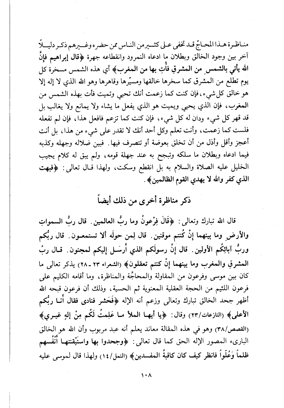 مُنَاظَرَةِ هَذَا الْمُحَاجِّ قَدْ تَخْفَى عَلَى كَثِيرٍ مِنَ النَّاسِ مِمَّنْ حَضَرَهُ وَغَيْرِهِمْ ذَكَرَ دَلِيلًا آخَرَ بَيَّنَ وُجُودَ الْخَالِقِ وَبُطْلَانَ مَا ادَّعَاهُ النُّمْرُودُ وَانْقِطَاعَهُ جَهْرَةً {قَالَ إِبْرَاهِيمُ فَإِنَّ اللَّهَ يَأْتِي بِالشَّمْسِ مِنَ الْمَشْرِقِ فَأْتِ بِهَا مِنَ الْمَغْرِبِ} أَيْ: هَذِهِ الشَّمْسُ مُسَخَّرَةٌ كُلَّ يَوْمٍ تَطْلُعُ مِنَ الْمَشْرِقِ كَمَا سَخَّرَهَا خَالِقُهَا وَمُسَيِّرُهَا وَقَاهِرُهَا وَهُوَ اللَّهُ الَّذِي لَا إِلَهَ إِلَّا هُوَ خَالِقُ كُلِّ شَيْءٍ فَإِنْ كُنْتَ كَمَا زَعَمْتَ أَنَّكَ تُحْيِي وَتُمِيتُ فَأْتِ بِهَذِهِ الشَّمْسِ مِنَ الْمَغْرِبِ, فَإِنَّ الَّذِي يُحْيِي وَيُمِيتُ هُوَ الَّذِي يَفْعَلُ مَا يَشَاءُ وَلَا يُمَانَعُ وَلَا يُغَالَبُ بَلْ قَدْ قَهَرَ كُلَّ شَيْءٍ وَدَانَ لَهُ كُلُّ شَيْءٍ فَإِنْ كُنْتَ كَمَا تَزْعُمُ فَافْعَلْ هَذَا فَإِنْ لَمْ تَفْعَلْهُ فَلَسْتَ كَمَا زَعَمْتَ وَأَنْتَ تَعْلَمُ وَكُلُّ أَحَدٍ أَنَّكَ لَا تَقْدِرُ عَلَى شَيْءٍ مِنْ هَذَا, بَلْ أَنْتَ أَعْجَزُ وَأَقَلُّ وَأَذَلُّ مِنْ أَنْ تَخْلُقَ بَعُوضَةً أَوْ تَتَصَرَّفَ فِيهَا. فَبَيَّنَ ضَلَالَهُ وَجَهْلَهُ وَكَذِبَهُ فِيمَا ادَّعَاهُ وَبُطْلَانَ مَا سَلَكَهُ وَتَبَجَّحَ بِهِ عِنْدَ جَهَلَةِ قَوْمِهِ وَلَمْ يَبْقَ لَهُ كَلَامٌ يُجِيبُ الْخَلِيلَ عَلَيْهِ الصَّلَاةُ وَالسَّلَامُ بِهِ بَلِ انْقَطَعَ وَسَكَتَ, وَلِهَذَا قَالَ تَعَالَى: {فَبُهِتَ الَّذِي كَفَرَ وَاللَّهُ لَا يَهْدِي الْقَوْمَ الظَّالِمِينَ} .
