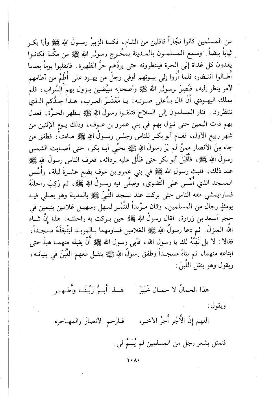 مِنَ الْمُسْلِمِينَ كَانُوا تُجَّارًا قَافِلِينَ مِنَ الشَّامِ, فَكَسَا الزُّبَيْرُ رَسُولَ اللَّهِ -صَلَّى اللَّهُ عَلَيْهِ وَسَلَّمَ- وَأَبَا بَكْرٍ ثِيَابًا بِيضًا. وَسَمِعَ الْمُسْلِمُونَ بِالْمَدِينَةِ بِمَخْرَجِ رَسُولِ اللَّهِ -صَلَّى اللَّهُ عَلَيْهِ وَسَلَّمَ- مِنْ مَكَّةَ فَكَانُوا يَغْدُونَ كُلَّ غَدَاةٍ إِلَى الْحَرَّةِ فَيَنْتَظِرُونَهُ حَتَّى يَرُدَّهُمْ حَرُّ الظَّهِيرَةِ. فَانْقَلَبُوا يَوْمًا بَعْدَ ما أطالوا انتظاره فَلَمَّا أَوَوْا إِلَى بُيُوتِهِمْ أَوْفَى رَجُلٌ مِنْ يَهُودَ عَلَى أُطُمٍ مِنْ آطَامِهِمْ لِأَمْرٍ يَنْظُرُ إِلَيْهِ, فَبَصُرَ بِرَسُولِ اللَّهِ -صَلَّى اللَّهُ عَلَيْهِ وَسَلَّمَ- وَأَصْحَابِهِ مُبَيَّضِينَ يَزُولُ بِهِمُ السَّرَابُ, فَلَمْ يَمْلِكِ الْيَهُودِيُّ أَنْ قَالَ بِأَعْلَى صوته: يا معشر الْعَرَبِ؛ هَذَا جَدُّكُمُ الَّذِي تَنْتَظِرُونَ. فَثَارَ الْمُسْلِمُونَ إِلَى السِّلَاحِ فَتَلَقَّوْا رَسُولَ اللَّهِ -صَلَّى اللَّهُ عَلَيْهِ وَسَلَّمَ- بِظَهْرِ الْحَرَّةِ, فَعَدَلَ بِهِمْ ذَاتَ الْيَمِينِ حَتَّى نَزَلَ بِهِمْ فِي بَنِي عَمْرِو بْنِ عَوْفٍ, وَذَلِكَ يَوْمَ الِاثْنَيْنِ مِنْ شَهْرِ رَبِيعٍ الْأَوَّلِ, فَقَامَ أَبُو بَكْرٍ لِلنَّاسِ وَجَلَسَ رَسُولُ اللَّهِ -صَلَّى اللَّهُ عَلَيْهِ وَسَلَّمَ- صَامِتًا, فَطَفِقَ مَنْ جَاءَ مِنَ الْأَنْصَارِ مِمَّنْ لَمْ يَرَ رَسُولَ اللَّهِ -صَلَّى اللَّهُ عَلَيْهِ وَسَلَّمَ- يُحَيِّي أَبَا بَكْرٍ, حَتَّى أَصَابَتِ الشَّمْسُ رَسُولَ اللَّهِ -صَلَّى اللَّهُ عَلَيْهِ وَسَلَّمَ- فَأَقْبَلَ أَبُو بَكْرٍ حَتَّى ظَلَّلَ عَلَيْهِ بِرِدَائِهِ, فَعَرَفَ النَّاسُ رَسُولَ اللَّهِ -صَلَّى اللَّهُ عَلَيْهِ وَسَلَّمَ- عِنْدَ ذَلِكَ, فَلَبِثَ رَسُولُ اللَّهِ -صَلَّى اللَّهُ عَلَيْهِ وَسَلَّمَ- فِي بَنِي عَمْرِو بْنِ عَوْفٍ بِضْعَ عَشْرَةَ لَيْلَةً, وَأَسَّسَ الْمَسْجِدَ الَّذِي أُسِّسَ عَلَى التَّقْوَى, وَصَلَّى فِيهِ رَسُولُ اللَّهِ -صَلَّى اللَّهُ عَلَيْهِ وَسَلَّمَ- ثُمَّ رَكِبَ رَاحِلَتَهُ فَسَارَ يَمْشِي مَعَهُ النَّاسُ حَتَّى بَرَكَتْ عند مسجد النبي -صَلَّى اللَّهُ عَلَيْهِ وَسَلَّمَ- بِالْمَدِينَةِ وَهُوَ يُصَلِّي فِيهِ يَوْمَئِذٍ رِجَالٌ مِنَ الْمُسْلِمِينَ, وَكَانَ مِرْبَدًا لِلتَّمْرِ لِسَهْلٍ وَسُهَيْلٍ غُلَامَيْنِ يَتِيمَيْنِ فِي حَجْرِ أَسْعَدَ بْنِ زُرَارَةَ, فَقَالَ رَسُولُ اللَّهِ -صَلَّى اللَّهُ عَلَيْهِ وَسَلَّمَ- حِينَ بَرَكَتْ بِهِ رَاحِلَتُهُ: "هَذَا إِنْ شَاءَ اللَّهُ الْمَنْزِلُ" ثُمَّ دَعَا رَسُولُ اللَّهِ -صَلَّى اللَّهُ عَلَيْهِ وَسَلَّمَ- الْغُلَامَيْنِ فَسَاوَمَهُمَا بِالْمِرْبَدِ لِيَتَّخِذَهُ مَسْجِدًا, فَقَالَا: لَا, بَلْ نَهَبُهُ لَكَ يَا رَسُولَ اللَّهِ. فَأَبَى رَسُولُ اللَّهِ -صَلَّى اللَّهُ عَلَيْهِ وَسَلَّمَ- أَنْ يَقْبَلَهُ مِنْهُمَا هِبَةً حَتَّى ابْتَاعَهُ مِنْهُمَا, ثُمَّ بَنَاهُ مَسْجِدًا وَطَفِقَ رَسُولُ اللَّهِ -صَلَّى اللَّهُ عَلَيْهِ وَسَلَّمَ- يَنْقُلُ مَعَهُمُ اللَّبِنَ فِي بُنْيَانِهِ, وَيَقُولُ وَهُوَ يَنْقُلُ اللَّبِنَ: