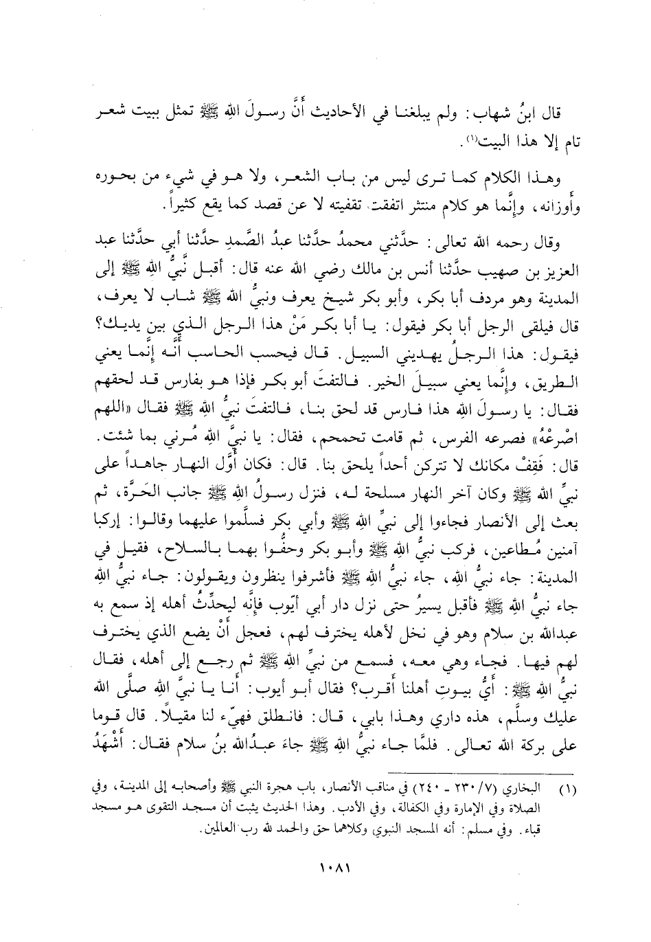 وَقَالَ رَحِمَهُ اللَّهُ تَعَالَى: حَدَّثَنِي مُحَمَّدٌ حَدَّثَنَا عَبْدُ الصَّمَدِ حَدَّثَنَا أَبِي حَدَّثَنَا عَبْدُ الْعَزِيزِ بْنُ صُهَيْبٍ حَدَّثَنَا أَنَسُ بْنُ مَالِكٍ رَضِيَ اللَّهُ عَنْهُ قَالَ: أَقْبَلَ نَبِيُّ اللَّهِ -صَلَّى اللَّهُ عَلَيْهِ وَسَلَّمَ- إِلَى الْمَدِينَةِ وَهُوَ مُرْدِفٌ أَبَا بَكْرٍ, وَأَبُو بَكْرٍ شَيْخٌ يُعْرَفُ وَنَبِيُّ اللَّهِ -صَلَّى اللَّهُ عَلَيْهِ وَسَلَّمَ- شَابٌّ لَا يُعْرَفُ, قَالَ: فَيَلْقَى الرَّجُلُ أَبَا بَكْرٍ فَيَقُولُ: يَا أَبَا بَكْرٍ مَنْ هَذَا الرَّجُلُ الَّذِي بَيْنَ يَدَيْكَ؟ فَيَقُولُ: هَذَا الرَّجُلُ يَهْدِينِي السَّبِيلَ. قَالَ: فَيَحْسَبُ الْحَاسِبُ أَنَّهُ إِنَّمَا يَعْنِي الطَّرِيقَ, وَإِنَّمَا يَعْنِي سَبِيلَ الْخَيْرِ. فَالْتَفَتَ أَبُو بَكْرٍ فَإِذَا هُوَ بِفَارِسٍ قَدْ لَحِقَهُمْ فَقَالَ: يَا رَسُولَ اللَّهِ هَذَا فَارِسٌ قَدْ لَحِقَ بِنَا, فَالْتَفَتَ نَبِيُّ اللَّهِ -صَلَّى اللَّهُ عَلَيْهِ وَسَلَّمَ- فَقَالَ: "اللَّهُمَّ اصْرَعْهُ" فَصَرَعَهُ الْفَرَسُ, ثُمَّ قَامَتْ تُحَمْحِمُ, فَقَالَ: يَا نَبِيَّ اللَّهِ مُرْنِي بِمَا شِئْتَ. قَالَ: فَقِفْ مَكَانَكَ لَا تَتْرُكَنَّ أَحَدًا يَلْحَقُ بِنَا. قَالَ: فَكَانَ أَوَّلَ النَّهَارِ جَاهِدًا عَلَى نَبِيِّ اللَّهِ -صَلَّى اللَّهُ عَلَيْهِ وَسَلَّمَ- وَكَانَ آخِرَ النَّهَارِ مَسْلَحَةً لَهُ, فَنَزَلَ رَسُولُ اللَّهِ -صَلَّى اللَّهُ عَلَيْهِ وَسَلَّمَ- جَانِبَ الْحَرَّةِ, ثُمَّ بَعَثَ إِلَى الْأَنْصَارِ فَجَاءُوا إِلَى نَبِيِّ اللَّهِ -صَلَّى اللَّهُ عَلَيْهِ وَسَلَّمَ- وَأَبِي بَكْرٍ فَسَلَّمُوا عَلَيْهِمَا, وَقَالُوا: ارْكَبَا آمِنَيْنِ مُطَاعَيْنِ, فَرَكِبَ نَبِيُّ اللَّهِ -صَلَّى اللَّهُ عَلَيْهِ وَسَلَّمَ- وَأَبُو بَكْرٍ وَحَفُّوا بِهِمَا بِالسِّلَاحِ, فَقِيلَ فِي الْمَدِينَةِ: جَاءَ نَبِيُّ اللَّهِ, جَاءَ نَبِيُّ اللَّهِ -صَلَّى اللَّهُ عَلَيْهِ وَسَلَّمَ- فَأَشْرَفُوا يَنْظُرُونَ وَيَقُولُونَ: جَاءَ نَبِيُّ اللَّهِ, جَاءَ نَبِيُّ اللَّهِ -صَلَّى اللَّهُ عَلَيْهِ وَسَلَّمَ- فَأَقْبَلَ يَسِيرُ حَتَّى نَزَلَ دَارِ أَبِي أَيُّوبَ فَإِنَّهُ لَيُحَدِّثُ أَهْلَهُ إِذْ سَمِعَ بِهِ عَبْدُ اللَّهِ بْنُ سَلَامٍ وَهُوَ فِي نَخْلٍ لِأَهْلِهِ يخترف لهم, فجعل أَنْ يَضَعَ الَّذِي يَخْتَرِفُ لَهُمْ فِيهَا. فَجَاءَ وَهِيَ مَعَهُ, فَسَمِعَ مِنْ نَبِيِّ اللَّهِ -صَلَّى اللَّهُ عَلَيْهِ وَسَلَّمَ- ثُمَّ رَجَعَ إِلَى أَهْلِهِ, فَقَالَ نَبِيُّ اللَّهِ, صَلَّى اللَّهُ عَلَيْهِ وَسَلَّمَ: "أَيُّ بُيُوتِ أَهْلِنَا أَقْرَبُ؟ " فَقَالَ أَبُو أَيُّوبَ: أَنَا يَا نَبِيَّ اللَّهِ صَلَّى اللَّهُ عَلَيْكَ وَسَلَّمَ, هَذِهِ دَارِي وَهَذَا بَابِي. قَالَ: "فَانْطَلِقْ فَهَيِّئْ لَنَا مَقِيلًا" قَالَ: قُومَا عَلَى بَرَكَةِ اللَّهِ تَعَالَى. فَلَمَّا جَاءَ نَبِيُّ اللَّهِ -صَلَّى اللَّهُ عَلَيْهِ وَسَلَّمَ- جَاءَ عَبْدُ اللَّهِ بْنُ سَلَامٍ فَقَالَ: أَشْهَدُ