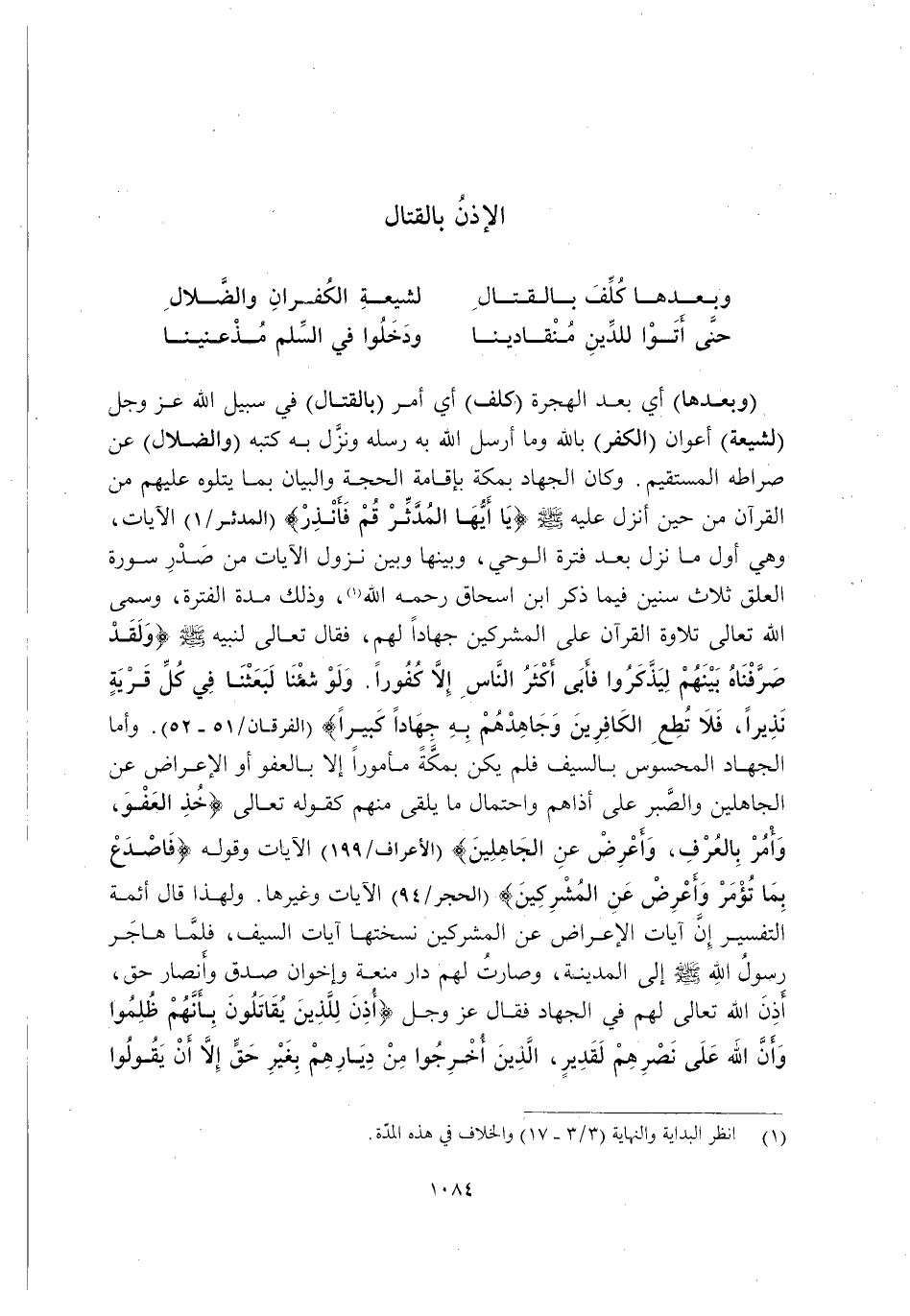 "وَبَعْدَهَا" أَيْ: بَعْدَ الْهِجْرَةِ "كُلِّفَ" أَيْ: أُمِرَ "بِالْقِتَالِ" فِي سَبِيلِ اللَّهِ عَزَّ وَجَلَّ "لِشِيعَةِ" أَعْوَانِ "الْكُفْرِ" بِاللَّهِ وَمَا أَرْسَلَ اللَّهُ بِهِ رُسُلَهُ وَنَزَّلَ بِهِ كُتُبَهُ "وَالضَّلَالِ" عَنْ صِرَاطِهِ الْمُسْتَقِيمِ. وَكَانَ الْجِهَادُ بِمَكَّةَ بِإِقَامَةِ الْحُجَّةِ وَالْبَيَانِ بِمَا يَتْلُوهُ عَلَيْهِمْ مِنَ الْقُرْآنِ مِنْ حِينِ أُنْزِلَ عَلَيْهِ, صَلَّى اللَّهُ عَلَيْهِ وَسَلَّمَ {يَا أَيُّهَا الْمُدَّثِّرُ، قُمْ فَأَنْذِرْ} [الْمُدَّثِّرِ: 1] الْآيَاتِ, وَهِيَ أَوَّلُ مَا نَزَلَ بَعْدَ فَتْرَةِ الْوَحْيِ, وَبَيْنَهَا وَبَيْنَ نُزُولِ الْآيَاتِ مِنْ صَدْرِ سُورَةِ الْعَلَقِ ثَلَاثُ سِنِينَ فِيمَا ذَكَرَ ابْنُ إِسْحَاقَ رَحِمَهُ اللَّهُ1, وَذَلِكَ مُدَّةَ الْفَتْرَةِ, وَسَمَّى اللَّهَ تَعَالَى تِلَاوَةَ الْقُرْآنِ عَلَى الْمُشْرِكِينَ جِهَادًا لَهُمْ, فَقَالَ تَعَالَى لِنَبِيِّهِ, صَلَّى اللَّهُ عَلَيْهِ وَسَلَّمَ: {وَلَقَدْ صَرَّفْنَاهُ بَيْنَهُمْ لِيَذَّكَّرُوا فَأَبَى أَكْثَرُ النَّاسِ إِلَّا كُفُورًا، وَلَوْ شِئْنَا لَبَعَثْنَا فِي كُلِّ قَرْيَةٍ نَذِيرًا، فَلَا تُطِعِ الْكَافِرِينَ وَجَاهِدْهُمْ بِهِ جِهَادًا كَبِيرًا} [الْفُرْقَانِ: 51-52] . وَأَمَّا الْجِهَادُ الْمَحْسُوسُ بِالسَّيْفِ فَلَمْ يَكُنْ بِمَكَّةَ مَأْمُورًا إِلَّا بِالْعَفْوِ أَوِ الْإِعْرَاضِ عَنِ الْجَاهِلِينَ وَالصَّبْرِ عَلَى أَذَاهُمْ وَاحْتِمَالِ مَا يَلْقَى مِنْهُمْ كَقَوْلِهِ تَعَالَى: {خُذِ الْعَفْوَ وَأْمُرْ بِالْعُرْفِ وَأَعْرِضْ عَنِ الْجَاهِلِينَ} [الْأَعْرَافِ: 199] الْآيَاتِ وَقَوْلِهِ: {فَاصْدَعْ بِمَا تُؤْمَرُ وَأَعْرِضْ عَنِ الْمُشْرِكِينَ} [الْحِجْرِ: 94] الْآيَاتِ, وَغَيْرَهَا. وَلِهَذَا قَالَ أَئِمَّةُ التَّفْسِيرِ: إِنِّ آيَاتِ الْإِعْرَاضِ عَنِ الْمُشْرِكِينَ نَسَخَتْهَا آيَاتُ السَّيْفِ, فَلَمَّا هَاجَرَ رَسُولُ اللَّهِ -صَلَّى اللَّهُ عَلَيْهِ وَسَلَّمَ- إِلَى الْمَدِينَةِ, وَصَارَتْ لَهُمْ دَارُ مَنَعَةٍ وَإِخْوَانُ صِدْقٍ وَأَنْصَارُ حَقٍّ, أَذِنَ اللَّهُ تَعَالَى لَهُمْ فِي الْجِهَادِ فَقَالَ عَزَّ وَجَلَّ: {أُذِنَ لِلَّذِينَ يُقَاتَلُونَ بِأَنَّهُمْ ظُلِمُوا وَإِنَّ اللَّهَ عَلَى نَصْرِهِمْ لَقَدِيرٌ الَّذِينَ أُخْرِجُوا مِنْ دِيَارِهِمْ بِغَيْرِ حَقٍّ إِلَّا أَنْ يَقُولُوا