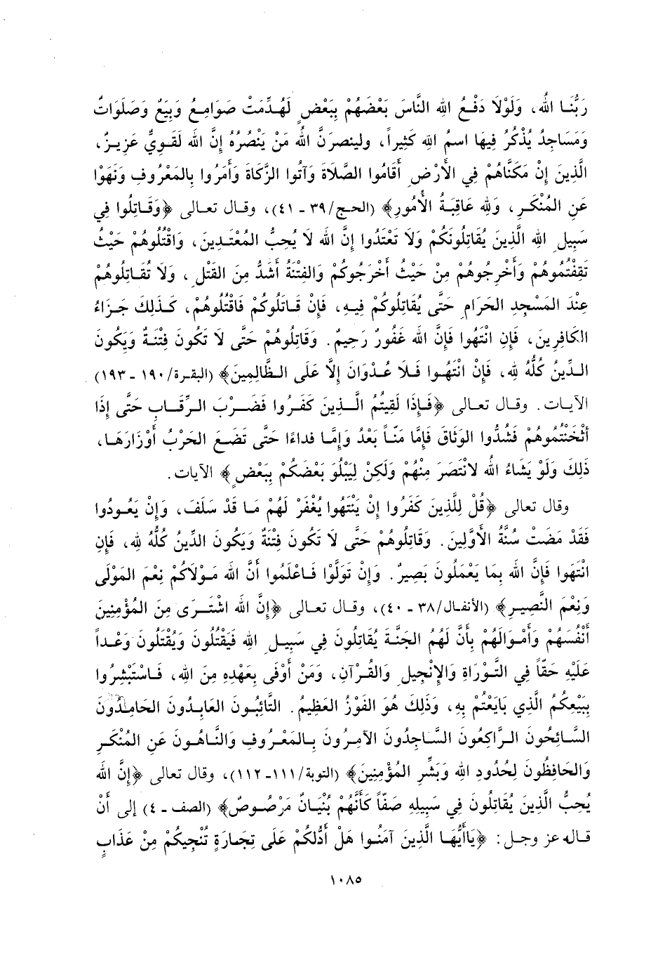رَبُّنَا اللَّهُ وَلَوْلَا دَفْعُ اللَّهِ النَّاسَ بَعْضَهُمْ بِبَعْضٍ لَهُدِّمَتْ صَوَامِعُ وَبِيَعٌ وَصَلَوَاتٌ وَمَسَاجِدُ يُذْكَرُ فِيهَا اسْمُ اللَّهِ كَثِيرًا وَلَيَنْصُرَنَّ اللَّهُ مَنْ يَنْصُرُهُ إِنَّ اللَّهَ لَقَوِيٌّ عَزِيزٌ الَّذِينَ إِنْ مَكَّنَّاهُمْ فِي الْأَرْضِ أَقَامُوا الصَّلَاةَ وَآتَوُا الزَّكَاةَ وَأَمَرُوا بِالْمَعْرُوفِ وَنَهَوْا عَنِ الْمُنْكَرِ وَلِلَّهِ عَاقِبَةُ الْأُمُورِ} [الْحَجِّ: 39-41] وَقَالَ تَعَالَى: {وَقَاتِلُوا فِي سَبِيلِ اللَّهِ الَّذِينَ يُقَاتِلُونَكُمْ وَلَا تَعْتَدُوا إِنَّ اللَّهَ لَا يُحِبُّ الْمُعْتَدِينَ وَاقْتُلُوهُمْ حَيْثُ ثَقِفْتُمُوهُمْ وَأَخْرِجُوهُمْ مِنْ حَيْثُ أَخْرَجُوكُمْ وَالْفِتْنَةُ أَشَدُّ مِنَ الْقَتْلِ وَلَا تُقَاتِلُوهُمْ عِنْدَ الْمَسْجِدِ الْحَرَامِ حَتَّى يُقَاتِلُوكُمْ فِيهِ فَإِنْ قَاتَلُوكُمْ فَاقْتُلُوهُمْ كَذَلِكَ جَزَاءُ الْكَافِرِينَ فَإِنِ انْتَهَوْا فَإِنَّ اللَّهَ غَفُورٌ رَحِيمٌ وَقَاتِلُوهُمْ حَتَّى لَا تَكُونَ فِتْنَةٌ وَيَكُونَ الدِّينُ كُلُّهُ لِلَّهِ فَإِنِ انْتَهَوْا فَلَا عُدْوَانَ إِلَّا عَلَى الظَّالِمِينَ} [الْبَقَرَةِ: 190-193] الْآيَاتِ, وَقَالَ تَعَالَى: {فَإِذَا لَقِيتُمُ الَّذِينَ كَفَرُوا فَضَرْبَ الرِّقَابِ حَتَّى إِذَا أَثْخَنْتُمُوهُمْ فَشُدُّوا الْوَثَاقَ فَإِمَّا مَنًّا بَعْدُ وَإِمَّا فِدَاءً حَتَّى تَضَعَ الْحَرْبُ أَوْزَارَهَا ذَلِكَ وَلَوْ يَشَاءُ اللَّهُ لَانْتَصَرَ مِنْهُمْ وَلَكِنْ لِيَبْلُوَ بَعْضَكُمْ بِبَعْضٍ} الْآيَاتِ.
