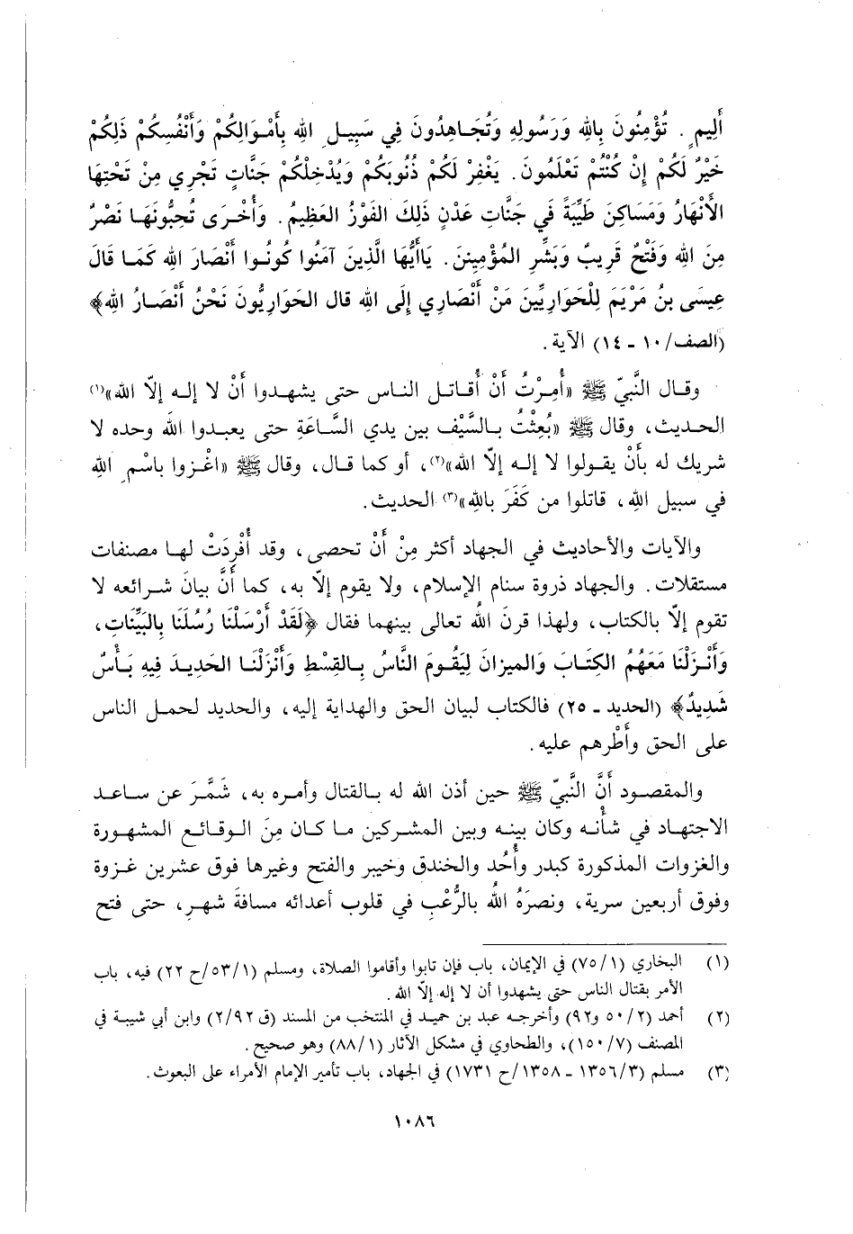 وَقَالَ النَّبِيُّ, صَلَّى اللَّهُ عَلَيْهِ وَسَلَّمَ: "أُمِرْتُ أَنْ أُقَاتِلَ النَّاسَ حَتَّى يَشْهَدُوا أَنْ لَا إِلَهَ إِلَّا اللَّهُ" 1 الْحَدِيثَ, وَقَالَ صَلَّى اللَّهُ عَلَيْهِ وَسَلَّمَ: "بُعِثْتُ بِالسَّيْفِ بَيْنَ يَدَيِ السَّاعَةِ حَتَّى يَعْبُدُوا اللَّهَ وَحْدَهُ لَا شَرِيكَ لَهُ بِأَنْ يَقُولُوا لَا إِلَهَ إِلَّا اللَّهُ" 2, أَوْ كَمَا قَالَ, وَقَالَ صَلَّى اللَّهُ عَلَيْهِ وَسَلَّمَ: "اغْزُوَا بِاسْمِ اللَّهِ فِي سَبِيلِ اللَّهِ قَاتِلُوا مَنْ كَفَرَ بِاللَّهِ" 3 الْحَدِيثَ.