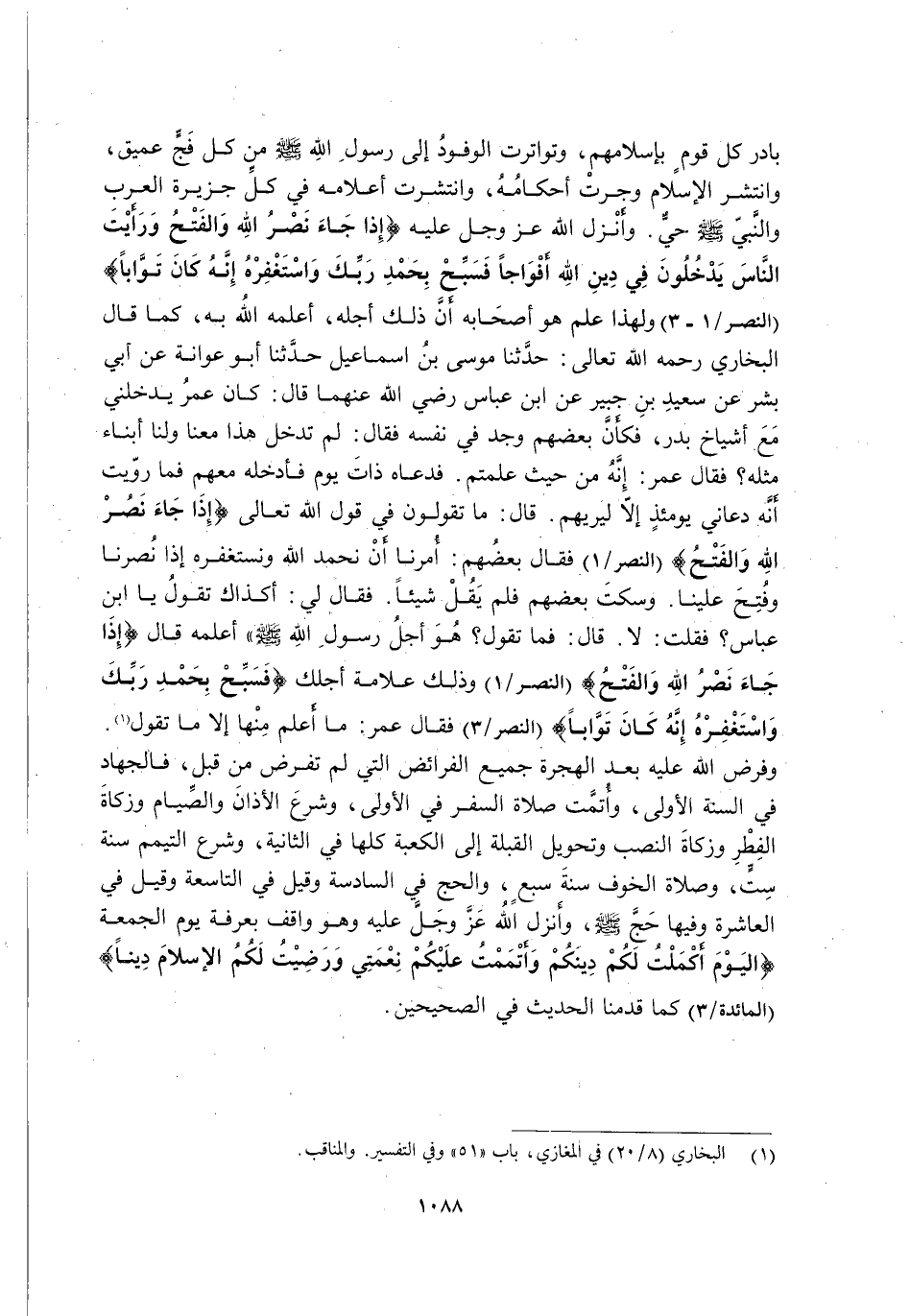 بَادَرَ كُلُّ قَوْمٍ بِإِسْلَامِهِمْ, وَتَوَاتَرَتِ الْوُفُودُ إِلَى رَسُولِ اللَّهِ -صَلَّى اللَّهُ عَلَيْهِ وَسَلَّمَ- مِنْ كُلِّ فَجٍّ عَمِيقٍ, وَانْتَشَرَ الْإِسْلَامُ وَجَرَتْ أَحْكَامُهُ, وَانْتَشَرَتْ أَعْلَامُهُ فِي كُلِّ جَزِيرَةِ الْعَرَبِ وَالنَّبِيُّ -صَلَّى اللَّهُ عَلَيْهِ وَسَلَّمَ- حَيٌّ. وَأَنْزَلَ اللَّهُ عَزَّ وَجَلَّ عَلَيْهِ {إِذَا جَاءَ نَصْرُ اللَّهِ وَالْفَتْحُ وَرَأَيْتَ النَّاسَ يَدْخُلُونَ فِي دِينِ اللَّهِ أَفْوَاجًا فَسَبِّحْ بِحَمْدِ رَبِّكَ وَاسْتَغْفِرْهُ إِنَّهُ كَانَ تَوَّابًا} [النَّصْرَ: 1-3] وَلِهَذَا عَلَّمَ هُوَ وأصحابه أَنَّ ذلك أجله, أعلنه اللَّهُ بِهِ, كَمَا قَالَ الْبُخَارِيُّ رَحِمَهُ اللَّهُ تَعَالَى: حَدَّثَنَا مُوسَى بْنُ إِسْمَاعِيلَ حَدَّثَنَا أَبُو عَوَانَةَ عَنْ أَبِي بِشْرٍ عَنْ سَعِيدِ بْنِ جُبَيْرٍ عَنِ ابْنِ عَبَّاسٍ رَضِيَ اللَّهُ عَنْهُمَا قَالَ: كَانَ عُمَرُ يُدْخِلُنِي مَعَ أَشْيَاخِ بَدْرٍ, فَكَأَنَّ بَعْضَهُمْ وَجَدَ فِي نَفْسِهِ فَقَالَ: لِمَ تُدْخِلُ هَذَا مَعَنَا وَلَنَا أَبْنَاءُ مِثْلُهُ؟ فَقَالَ عُمَرُ: إِنَّهُ مِنْ حَيْثُ عَلِمْتُمْ. فَدَعَاهُ ذَاتَ يَوْمٍ فَأَدْخَلَهُ مَعَهُمْ فَمَا رَوَيْتُ أَنَّهُ دَعَانِي يَوْمَئِذٍ إِلَّا لِيُرِيَهُمْ قَالَ: مَا تَقُولُونَ فِي قَوْلِ اللَّهِ تَعَالَى: {إِذَا جَاءَ نَصْرُ اللَّهِ وَالْفَتْحُ} [النَّصْرِ: 1] فَقَالَ بَعْضُهُمْ: أُمِرْنَا أَنْ نَحْمَدَ اللَّهَ وَنَسْتَغْفِرَهُ إِذَا نُصِرْنَا وَفُتِحَ عَلَيْنَا. وَسَكَتَ بَعْضُهُمْ فَلَمْ يَقُلْ شَيْئًا. فَقَالَ لِي: أكذاك تقول يابن عَبَّاسٍ؟ فَقُلْتُ: لَا, قَالَ فَمَا تَقُوُلُ: هُوَ أَجَلُ رَسُولِ اللَّهِ -صَلَّى اللَّهُ عَلَيْهِ وَسَلَّمَ- أُعْلِمَهُ, قَالَ: {إِذَا جَاءَ نَصْرُ اللَّهِ وَالْفَتْحُ} [النَّصْرِ: 1] وَذَلِكَ عَلَامَةُ أَجْلِكَ {فَسَبِّحْ بِحَمْدِ رَبِّكَ وَاسْتَغْفِرْهُ إِنَّهُ كَانَ تَوَّابًا} [النَّصْرَ: 3] فَقَالَ عُمَرُ: مَا أَعْلَمُ مِنْهَا إِلَّا مَا تَقُولُ1. وَفَرَضَ اللَّهُ عَلَيْهِ بَعْدَ الْهِجْرَةِ جَمِيعَ الْفَرَائِضِ الَّتِي لَمْ تُفْرَضْ مِنْ قَبْلُ, فَالْجِهَادُ فِي السَّنَةِ الْأُولَى, وَأُتِمَّتْ صَلَاةُ السَّفَرِ فِي الْأُولَى, وَشَرَعَ الْأَذَانَ وَالصِّيَامَ وَزَكَاةَ الْفِطْرِ وَزَكَاةَ النُّصُبِ وَتَحْوِيلَ الْقِبْلَةِ إِلَى الْكَعْبَةِ كُلَّهَا فِي الثَّانِيَةِ, وَشَرَعَ التَّيَمُّمَ سَنَةَ سِتٍّ, وَصَلَاةَ الْخَوْفِ سَنَةَ سَبْعٍ, وَالْحَجَّ فِي السَّادِسَةِ وَقِيلَ فِي التَّاسِعَةِ وَقِيلَ فِي الْعَاشِرَةِ وَفِيهَا حَجَّ -صَلَّى اللَّهُ عَلَيْهِ وَسَلَّمَ- وَأَنْزَلَ اللَّهُ عَزَّ وَجَلَّ عَلَيْهِ وَهُوَ وَاقِفٌ بِعَرَفَةَ يَوْمَ الْجُمُعَةِ {الْيَوْمَ أَكْمَلْتُ لَكُمْ دِينَكُمْ وَأَتْمَمْتُ عَلَيْكُمْ نِعْمَتِي وَرَضِيتُ لَكُمُ الْإِسْلَامَ دِينًا} [الْمَائِدَةِ: 3] كَمَا قَدَّمْنَا الْحَدِيثُ فِي الصَّحِيحَيْنِ.