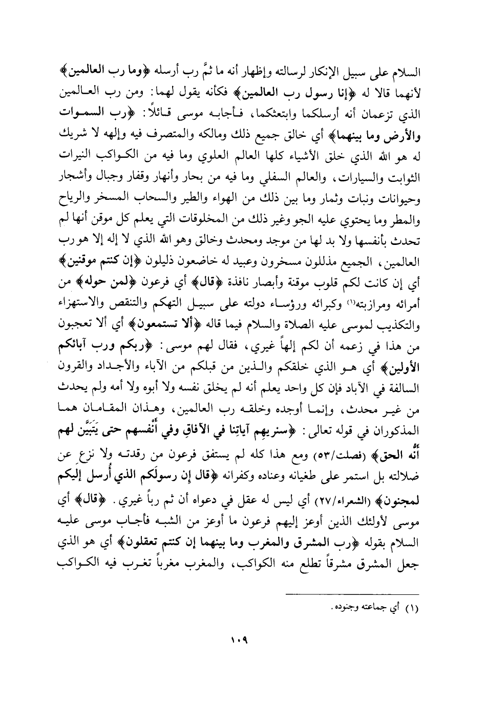 السَّلَامُ عَلَى سَبِيلِ الْإِنْكَارِ لِرِسَالَتِهِ وَإِظْهَارِ أَنَّهُ مَا ثَمَّ رَبٌّ أَرْسَلَهُ {وَمَا رَبُّ الْعَالَمِينَ} لِأَنَّهُمَا قَالَا لَهُ: {إِنَّا رَسُولُ رَبِّ الْعَالَمِينَ} فَكَأَنَّهُ يَقُولُ لَهُمَا: وَمَنْ رَبُّ الْعَالَمِينَ الَّذِي تَزْعُمَانِ أَنَّهُ أَرْسَلَكُمَا وَابْتَعَثَكُمَا فَأَجَابَهُ موسى قائلا: {قَالَ رَبُّ السَّمَاوَاتِ وَالْأَرْضِ وَمَا بَيْنَهُمَا} أَيْ: خَالِقُ جَمِيعِ ذَلِكَ وَمَالِكُهُ وَالْمُتَصَرِّفُ فِيهِ وَإِلَهُهُ لَا شَرِيكَ لَهُ هُوَ اللَّهُ الَّذِي خَلَقَ الْأَشْيَاءَ كُلَّهَا الْعَالَمَ الْعُلْوِيَّ وَمَا فِيهِ مِنَ الْكَوَاكِبِ النَّيِّرَاتِ الثَّوَابِتِ وَالسَّيَّارَاتِ, وَالْعَالَمِ السُّفْلِيِّ وَمَا فِيهِ مِنْ بِحَارٍ وَأَنْهَارٍ وَقِفَارٍ وَجِبَالٍ وَأَشْجَارٍ وَحَيَوَانَاتٍ وَنَبَاتٍ وَثِمَارٍ وَمَا بَيْنَ ذَلِكَ مِنَ الْهَوَاءِ وَالطَّيْرِ وَالسَّحَابِ الْمُسَخَّرِ وَالرِّيَاحِ وَالْمَطَرِ وَمَا يَحْتَوِي عَلَيْهِ الْجَوُّ وَغَيْرِ ذَلِكَ مِنَ الْمَخْلُوقَاتِ الَّتِي يَعْلَمُ كُلُّ مُوقِنٍ أَنَّهَا لَمْ تَحْدَثْ بِأَنْفُسِهَا وَلَا بُدَّ لَهَا مِنْ مُوجِدٍ وَمُحْدِثٍ وَخَالِقٍ وَهُوَ اللَّهُ الَّذِي لَا إِلَهَ إِلَّا هُوَ رَبُّ الْعَالَمِينَ الْجَمِيعُ مُذَلَّلُونَ مُسَخَّرُونَ وَعَبِيدٌ لَهُ خَاضِعُونَ ذَلِيلُونَ {إِنْ كُنْتُمْ مُوقِنِينَ} أَيْ: إِنْ كَانَتْ لَكُمْ قُلُوبٌ مُوقِنَةٌ وَأَبْصَارٌ نَافِذَةٌ {قَالَ} أَيْ: فِرْعَوْنُ {لِمَنْ حَوْلَهُ} مِنْ أُمَرَائِهِ وَمَرَازِبَتِهِ1 وَكُبَرَائِهِ وَرُؤَسَاءِ دَوْلَتِهِ عَلَى سَبِيلِ التَّهَكُّمِ وَالتَّنَقُّصِ وَالِاسْتِهْزَاءِ وَالتَّكْذِيبِ لِمُوسَى عَلَيْهِ الصَّلَاةُ وَالسَّلَامُ فِيمَا قَالَهُ: {أَلَا تَسْتَمِعُونَ} أَيْ: أَلَا تَعْجَبُونَ مِنْ هَذَا فِي زَعْمِهِ أَنَّ لَكُمْ إِلَهًا غَيْرِي, فَقَالَ لَهُمْ مُوسَى: {رَبُّكُمْ وَرَبُّ آبَائِكُمُ الْأَوَّلِينَ} أَيْ: هُوَ الَّذِي خَلَقَكُمْ وَالَّذِينَ مِنْ قَبْلِكُمْ مِنَ الْآبَاءِ وَالْأَجْدَادِ وَالْقُرُونِ السَّالِفَةِ فِي الْآبَادِ فَإِنَّ كُلَّ وَاحِدٍ يَعْلَمُ أَنَّهُ لَمْ يَخْلُقْ نَفْسَهُ وَلَا أَبُوهُ وَلَا أُمُّهُ وَلَمْ يُحْدَثْ مِنْ غَيْرِ مُحْدِثٍ, وَإِنَّمَا أَوْجَدَهُ وَخَلَقَهُ رَبُّ الْعَالَمِينَ وَهَذَانِ الْمَقَامَانِ هُمَا الْمَذْكُورَانِ فِي قَوْلِهِ تَعَالَى: {سَنُرِيهِمْ آيَاتِنَا فِي الْآفَاقِ وَفِي أَنْفُسِهِمْ حَتَّى يَتَبَيَّنَ لَهُمْ أَنَّهُ الْحَقُّ} [فُصِّلَتْ: 53] وَمَعَ هَذَا كُلِّهِ لَمْ يَسْتَفِقْ فِرْعَوْنُ مِنْ رَقْدَتِهِ وَلَا نَزَعَ عَنْ ضَلَالَتِهِ بَلِ اسْتَمَرَّ عَلَى طُغْيَانِهِ وَعِنَادِهِ وَكُفْرَانِهِ {قَالَ إِنَّ رَسُولَكُمُ الَّذِي أُرْسِلَ إِلَيْكُمْ لَمَجْنُونٌ} [الشُّعَرَاءِ: 27] أَيْ: لَيْسَ لَهُ عَقْلٌ فِي دَعْوَاهُ أَنَّ ثَمَّ رَبًّا غَيْرِي {قَالَ} أَيْ: مُوسَى لِأُولَئِكَ الَّذِينَ أَوْعَزَ إِلَيْهِمْ فِرْعَوْنُ مَا أَوْعَزَ مِنَ الشُّبَهِ فَأَجَابَ مُوسَى عَلَيْهِ السَّلَامُ بِقَوْلِهِ: {رَبُّ الْمَشْرِقِ وَالْمَغْرِبِ وَمَا بَيْنَهُمَا إِنْ كُنْتُمْ تَعْقِلُونَ} أَيْ: هُوَ الَّذِي جَعَلَ الْمَشْرِقَ مَشْرِقًا تَطْلُعُ مِنْهُ الْكَوَاكِبُ وَالْمَغْرِبَ مَغْرِبًا تَغْرُبُ فِيهِ الْكَوَاكِبُ