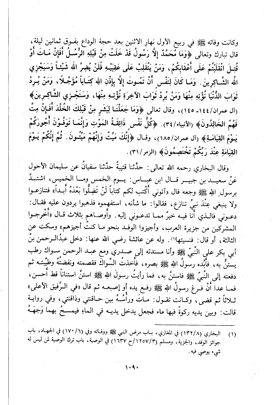 وَكَانَتْ وَفَاتُهُ -صَلَّى اللَّهُ عَلَيْهِ وَسَلَّمَ- فِي رَبِيعٍ الْأَوَّلِ نَهَارَ الِاثْنَيْنِ بَعْدَ حَجَّةِ الْوَدَاعِ بِفَوْقِ ثَمَانِينَ لَيْلَةً, قَالَ تَبَارَكَ وَتَعَالَى: {وَمَا مُحَمَّدٌ إِلَّا رَسُولٌ قَدْ خَلَتْ مِنْ قَبْلِهِ الرُّسُلُ أَفَإِنْ مَاتَ أَوْ قُتِلَ انْقَلَبْتُمْ عَلَى أَعْقَابِكُمْ وَمَنْ يَنْقَلِبْ عَلَى عَقِبَيْهِ فَلَنْ يَضُرَّ اللَّهَ شَيْئًا وَسَيَجْزِي اللَّهُ الشَّاكِرِينَ وَمَا كَانَ لِنَفْسٍ أَنْ تَمُوتَ إِلَّا بِإِذْنِ اللَّهِ كِتَابًا مُؤَجَّلًا وَمَنْ يُرِدْ ثَوَابَ الدُّنْيَا نُؤْتِهِ مِنْهَا وَمَنْ يُرِدْ ثَوَابَ الْآخِرَةِ نُؤْتِهِ مِنْهَا وَسَنَجْزِي الشَّاكِرِينَ} [آلِ عِمْرَانَ: 144-145] وَقَالَ تَعَالَى: {وَمَا جَعَلْنَا لِبَشَرٍ مِنْ قَبْلِكَ الْخُلْدَ أَفَإِنْ مِتَّ فَهُمُ الْخَالِدُونَ} [الْأَنْبِيَاءِ: 34] {كُلُّ نَفْسٍ ذَائِقَةُ الْمَوْتِ وَإِنَّمَا تُوَفَّوْنَ أُجُورَكُمْ يَوْمَ الْقِيَامَةِ} [آلِ عِمْرَانَ: 185] وَقَالَ: {إِنَّكَ مَيِّتٌ وَإِنَّهُمْ مَيِّتُونَ ثُمَّ إِنَّكُمْ يَوْمَ الْقِيَامَةِ عِنْدَ رَبِّكُمْ تَخْتَصِمُونَ} [الزُّمَرِ: 31] .