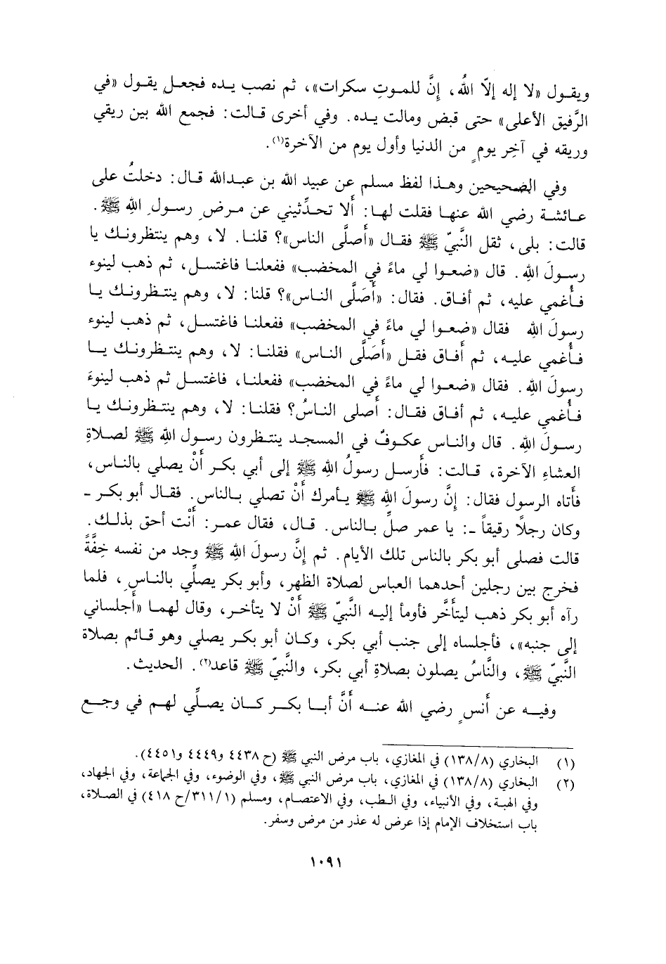 وَفِي الصَّحِيحَيْنِ وَهَذَا لَفْظُ مُسْلِمٍ عَنْ عُبَيْدِ اللَّهِ بْنِ عَبْدِ اللَّهِ قَالَ: دَخَلْتُ عَلَى عَائِشَةَ رَضِيَ اللَّهُ عَنْهَا فَقُلْتُ لَهَا: أَلَا تُحَدِّثِينِي عَنْ مَرَضِ رَسُولِ اللَّهِ صَلَّى اللَّهُ عَلَيْهِ وَسَلَّمَ؟. قَالَتْ: بَلَى, ثَقُلَ النَّبِيُّ -صَلَّى اللَّهُ عَلَيْهِ وَسَلَّمَ- فَقَالَ: "أَصَلَّى النَّاسُ"؟ قُلْنَا: لَا, وَهُمْ يَنْتَظِرُونَكَ يَا رَسُولَ اللَّهِ. قَالَ: "ضَعُوا لِي مَاءً فِي الْمِخْضَبِ" فَفَعَلْنَا فَاغْتَسَلَ, ثُمَّ ذَهَبَ لِيَنُوءَ فَأُغْمِيَ عَلَيْهِ ثُمَّ أَفَاقَ, فَقَالَ: "أَصَلَّى النَّاسُ"؟ قُلْنَا: لَا, وَهُمْ يَنْتَظِرُونَكَ يَا رَسُولَ اللَّهِ, فَقَالَ: "ضَعُوا لِي مَاءً فِي الْمِخْضَبِ" فَفَعَلْنَا فَاغْتَسَلَ ثُمَّ ذَهَبَ لِيَنُوءَ فَأُغْمِيَ عَلَيْهِ, ثُمَّ أَفَاقَ فَقَالَ: "أصلى الناس"؟ فقلنا: لَا, وَهُمْ يَنْتَظِرُونَكَ يَا رَسُولَ اللَّهِ, فَقَالَ: "ضَعُوا لِي مَاءً فِي الْمِخْضَبِ" فَفَعَلْنَا فَاغْتَسَلَ ثُمَّ ذَهَبَ لِيَنُوءَ فَأُغْمِيَ عَلَيْهِ, ثُمَّ أَفَاقَ فَقَالَ: "أَصَلَّى النَّاسُ"؟ فَقُلْنَا: لَا, وَهُمْ يَنْتَظِرُونَكَ يَا رسول الله قال: وَالنَّاسُ عُكُوفٌ فِي الْمَسْجِدِ يَنْتَظِرُونَ رَسُولَ اللَّهِ -صَلَّى اللَّهُ عَلَيْهِ وَسَلَّمَ- لِصَلَاةِ الْعِشَاءِ الْآخِرَةِ, قَالَتْ: فَأَرْسَلَ رَسُولُ اللَّهِ -صَلَّى اللَّهُ عَلَيْهِ وَسَلَّمَ- إِلَى أَبِي بَكْرٍ أَنْ يُصَلِّيَ بِالنَّاسِ, فَأَتَاهُ الرَّسُولُ فَقَالَ: إِنَّ رَسُولَ اللَّهِ -صَلَّى اللَّهُ عَلَيْهِ وَسَلَّمَ- يَأْمُرُكَ أَنْ تُصَلِّيَ بِالنَّاسِ. فَقَالَ أَبُو بَكْرٍ وَكَانَ رَجُلًا رَقِيقًا: يَا عُمَرُ صَلِّ بِالنَّاسِ. قَالَ: فَقَالَ عُمَرُ: أَنْتَ أَحَقُّ بِذَلِكَ. قَالَتْ: فَصَلَّى أبو بكر بالناس تِلْكَ الْأَيَّامَ, ثُمَّ إِنَّ رَسُولَ اللَّهِ -صَلَّى اللَّهُ عَلَيْهِ وَسَلَّمَ- وَجَدَ مِنْ نَفْسِهِ خِفَّةً فَخَرَجَ بَيْنَ رَجُلَيْنِ أَحَدُهُمَا الْعَبَّاسُ لِصَلَاةِ الظُّهْرِ, وَأَبُو بَكْرٍ يُصَلِّي بِالنَّاسِ, فَلَمَّا رَآهُ أَبُو بَكْرٍ ذَهَبَ لِيَتَأَخَّرَ فَأَوْمَأَ إِلَيْهِ النَّبِيُّ -صَلَّى اللَّهُ عَلَيْهِ وَسَلَّمَ- أَنْ لَا يَتَأَخَّرَ, وَقَالَ لَهُمَا: "أَجْلِسَانِي إِلَى جَنْبِهِ". فَأَجْلَسَاهُ إِلَى جَنْبِ أَبِي بَكْرٍ, وَكَانَ أَبُو بَكْرٍ يُصَلِّي وَهُوَ قَائِمٌ بِصَلَاةِ النَّبِيِّ -صَلَّى اللَّهُ عَلَيْهِ وَسَلَّمَ- وَالنَّاسُ يُصَلُّونَ بِصَلَاةِ أَبِي بَكْرٍ وَالنَّبِيُّ -صَلَّى اللَّهُ عَلَيْهِ وَسَلَّمَ- قَاعِدٌ2. الْحَدِيثَ.