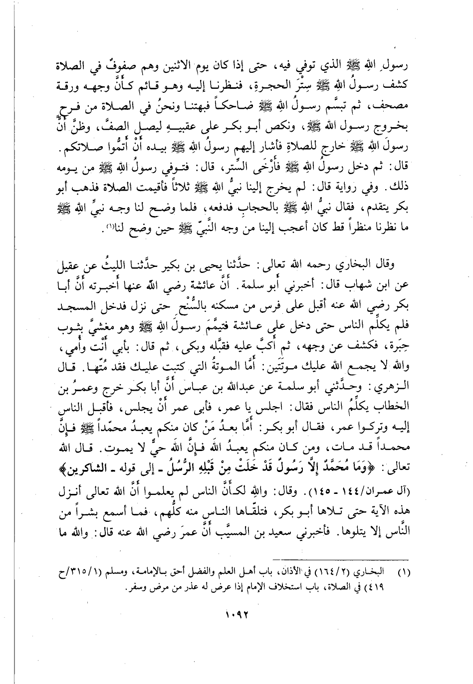 وَقَالَ الْبُخَارِيُّ رَحِمَهُ اللَّهُ تَعَالَى: حَدَّثَنَا يَحْيَى بْنُ بُكَيْرٍ حَدَّثَنَا اللَّيْثُ عَنْ عُقَيْلٍ عَنِ ابْنِ شِهَابٍ قَالَ: أَخْبَرَنِي أَبُو سَلَمَةَ أَنَّ عَائِشَةَ رَضِيَ اللَّهُ عَنْهَا أَخْبَرَتْهُ أَنَّ أَبَا بَكْرٍ رَضِيَ اللَّهُ عَنْهُ أَقْبَلَ عَلَى فَرَسٍ مِنْ مَسْكَنِهِ بِالسُّنْحِ حَتَّى نَزَلَ فَدَخَلَ الْمَسْجِدَ فَلَمْ يُكَلِّمِ النَّاسَ حَتَّى دَخَلَ عَلَى عَائِشَةَ, فَتَيَمَّمَ رَسُولَ اللَّهِ -صَلَّى اللَّهُ عَلَيْهِ وَسَلَّمَ- وَهُوَ مُغَشًّى بِثَوْبِ حِبَرَةٍ, فَكَشَفَ عَنْ وَجْهِهِ ثُمَّ أَكَبَّ عَلَيْهِ فَقَبَّلَهُ وَبَكَى, ثُمَّ قَالَ: بِأَبِي أَنْتَ وَأُمِّي, وَاللَّهِ لَا يَجْمَعُ اللَّهُ عَلَيْكَ مَوْتَتَيْنِ: أَمَّا الْمَوْتَةُ الَّتِي كُتِبَتْ عَلَيْكَ فَقَدْ مُتَّهَا. قَالَ الزُّهْرِيُّ: وَحَدَّثَنِي أَبُو سَلَمَةَ عَنْ عَبْدِ اللَّهِ بْنِ عَبَّاسٍ أَنَّ أَبَا بَكْرٍ خَرَجَ وَعُمَرُ بْنُ الْخَطَّابِ يُكَلِّمُ النَّاسَ فَقَالَ: اجْلِسْ يَا عُمَرُ, فَأَبَى عُمَرُ أَنْ يَجْلِسَ, فَأَقْبَلَ النَّاسُ إِلَيْهِ وَتَرَكُوا عُمَرَ, فَقَالَ أَبُو بَكْرٍ: أما بعد من كَانَ مِنْكُمْ يَعْبُدُ مُحَمَّدًا -صَلَّى اللَّهُ عَلَيْهِ وَسَلَّمَ- فَإِنَّ مُحَمَّدًا قَدْ مَاتَ, وَمَنْ كَانَ مِنْكُمْ يَعْبُدُ اللَّهَ فَإِنَّ اللَّهَ حَيٌّ لَا يَمُوتُ, قَالَ اللَّهُ تَعَالَى: {وَمَا مُحَمَّدٌ إِلَّا رَسُولٌ قَدْ خَلَتْ مِنْ قَبْلِهِ الرُّسُلُ} إِلَى قَوْلِهِ: {الشَّاكِرِينَ} [آلِ عِمْرَانَ: 144-145] وَقَالَ: وَاللَّهِ لَكَأَنَّ النَّاسَ لَمْ يَعْلَمُوا أن الله تعالى أَنْزَلَ هَذِهِ الْآيَةَ حَتَّى تَلَاهَا أَبُو بَكْرٍ, فَتَلَقَّاهَا النَّاسُ مِنْهُ كُلُّهُمْ, فَمَا أَسْمَعُ بَشَرًا مِنَ النَّاسِ إِلَّا يَتْلُوهَا. فَأَخْبَرَنِي سَعِيدُ بْنُ الْمُسَيَّبِ أَنَّ عُمَرَ رَضِيَ اللَّهُ عَنْهُ قَالَ: وَاللَّهِ مَا
