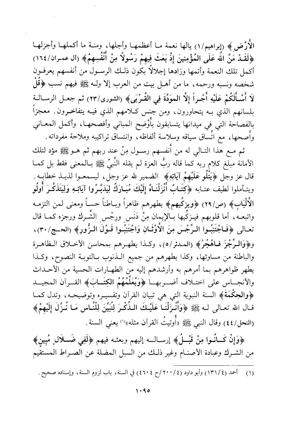 الْأَرْضِ} [إِبْرَاهِيمَ: 1] يَا لَهَا نِعْمَةً مَا أَعْظَمَهَا وَأَجَلَّهَا, وَمِنَّةً مَا أَكْمَلَهَا وَأَجْزَلَهَا {لَقَدْ مَنَّ اللَّهُ عَلَى الْمُؤْمِنِينَ إِذْ بَعَثَ فِيهِمْ رَسُولًا مِنْ أَنْفُسِهِمْ} [آلِ عِمْرَانَ: 164] أَكْمَلَ تِلْكَ النِّعْمَةَ وَأَتَمَّهَا وَزَادَهَا إِجْلَالًا بِكَوْنِ ذَلِكَ الرَّسُولِ مِنْ أَنْفُسِهِمْ؛ يَعْرِفُونَ شَخْصَهُ وَنَسَبَهُ وَرَحِمَهُ, مَا مِنْ أَهْلِ بَيْتٍ مِنَ الْعَرَبِ إِلَّا وَلَهُ -صَلَّى اللَّهُ عَلَيْهِ وَسَلَّمَ- فِيهِمْ نَسَبٌ {قُلْ لَا أَسْأَلُكُمْ عَلَيْهِ أَجْرًا إِلَّا الْمَوَدَّةَ فِي الْقُرْبَى} [الشُّورَى: 23] ثُمَّ جَعَلَ الرِّسَالَةَ بِلِسَانِهِمُ الَّذِي بِهِ يَتَحَاوَرُونَ, وَمِنْ جِنْسِ كَلَامِهِمُ الَّذِي فِيهِ يَتَفَاخَرُونَ, مُعْجِزًا بِالْفَصَاحَةِ الَّتِي فِي مَيْدَانِهَا يَتَسَابَقُونَ بِأَوْضَحِ الْمَبَانِي وَأَفْصَحِهَا, وَأَكْمَلِ الْمَعَانِي وَأَصَحِّهَا, مَعَ اتِّسَاقِ سِيَاقِهِ وَسَلَاسَةِ أَلْفَاظِهِ, وَانْتِسَاقِ تَرَاكِيبِهِ وَمَلَاحَةِ مُفْرَدَاتِهِ.