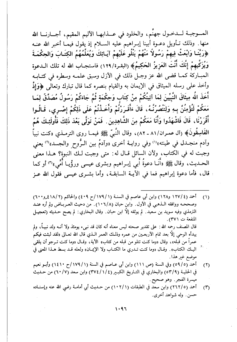 الْمُوجِبَةِ لِدُخُولِ جَهَنَّمَ, وَالْخُلُودِ فِي عَذَابِهَا الْأَلِيمِ الْمُقِيمِ, أَجَارَنَا اللَّهُ مِنْهَا. وَذَلِكَ تَأْوِيلُ دَعْوَةِ أَبِينَا إِبْرَاهِيمَ عَلَيْهِ السَّلَامُ إِذْ يَقُولُ فِيمَا أَخْبَرَ اللَّهُ عَنْهُ: {رَبَّنَا وَابْعَثْ فِيهِمْ رَسُولًا مِنْهُمْ يَتْلُو عَلَيْهِمْ آيَاتِكَ وَيُعَلِّمُهُمُ الْكِتَابَ وَالْحِكْمَةَ وَيُزَكِّيهِمْ إِنَّكَ أَنْتَ الْعَزِيزُ الْحَكِيمُ} [الْبَقَرَةِ: 129] فَاسْتَجَابَ اللَّهُ لَهُ تِلْكَ الدَّعْوَةَ الْمُبَارَكَةَ كَمَا قَضَى اللَّهُ عَزَّ وَجَلَّ ذَلِكَ فِي الْأَزَلِ وَسَبَقَ عَلِمُهُ وَسَطَرَهُ فِي كِتَابِهِ, وَأَخَذَ عَلَى رُسُلِهِ الْمِيثَاقَ فِي الْإِيمَانِ بِهِ وَالْقِيَامِ بِنَصْرِهِ, كَمَا قَالَ تَبَارَكَ وَتَعَالَى: {وَإِذْ أَخَذَ اللَّهُ مِيثَاقَ النَّبِيِّينَ لَمَا آتَيْتُكُمْ مِنْ كِتَابٍ وَحِكْمَةٍ ثُمَّ جَاءَكُمْ رَسُولٌ مُصَدِّقٌ لِمَا مَعَكُمْ لَتُؤْمِنُنَّ بِهِ وَلَتَنْصُرُنَّهُ قَالَ أَأَقْرَرْتُمْ وَأَخَذْتُمْ عَلَى ذَلِكُمْ إِصْرِي قَالُوا أَقْرَرْنَا قَالَ فَاشْهَدُوا وَأَنَا مَعَكُمْ مِنَ الشَّاهِدِينَ فَمَنْ تَوَلَّى بَعْدَ ذَلِكَ فَأُولَئِكَ هُمُ الْفَاسِقُونَ} [آلِ عِمْرَانَ: 81-82] وَقَالَ النَّبِيُّ -صَلَّى اللَّهُ عَلَيْهِ وَسَلَّمَ- فِيمَا رَوَى التِّرْمِذِيُّ: "كُنْتُ نَبِيًّا وَآدَمُ مُنْجَدِلٍ فِي طِينَتِهِ" 1 وَفِي رِوَايَةٍ أُخْرَى "وَآدَمُ بَيْنَ الرُّوحِ وَالْجَسَدِ" 2 يَعْنِي وَجَبَتْ لَهُ فِي الْكِتَابِ, وَلِأَنَّ السَّائِلَ قَالَ لَهُ: مَتَى وَجَبَتْ لَكَ النُّبُوَّةُ؟ هَذَا مَعْنَى الْحَدِيثِ, وَقَالَ, صَلَّى اللَّهُ عَلَيْهِ وَسَلَّمَ: "أَنَا دَعْوَةُ أَبِي إِبْرَاهِيمَ وَبُشْرَى عِيسَى وَرُؤْيَا أُمِّي" 3 أَوْ كَمَا قَالَ, فَأَمَّا دَعْوَةُ إِبْرَاهِيمَ فَمَا فِي الْآيَةِ السَّابِقَةِ, وَأَمَّا بُشْرَى عِيسَى فَقَوْلُ اللَّهِ عَزَّ
