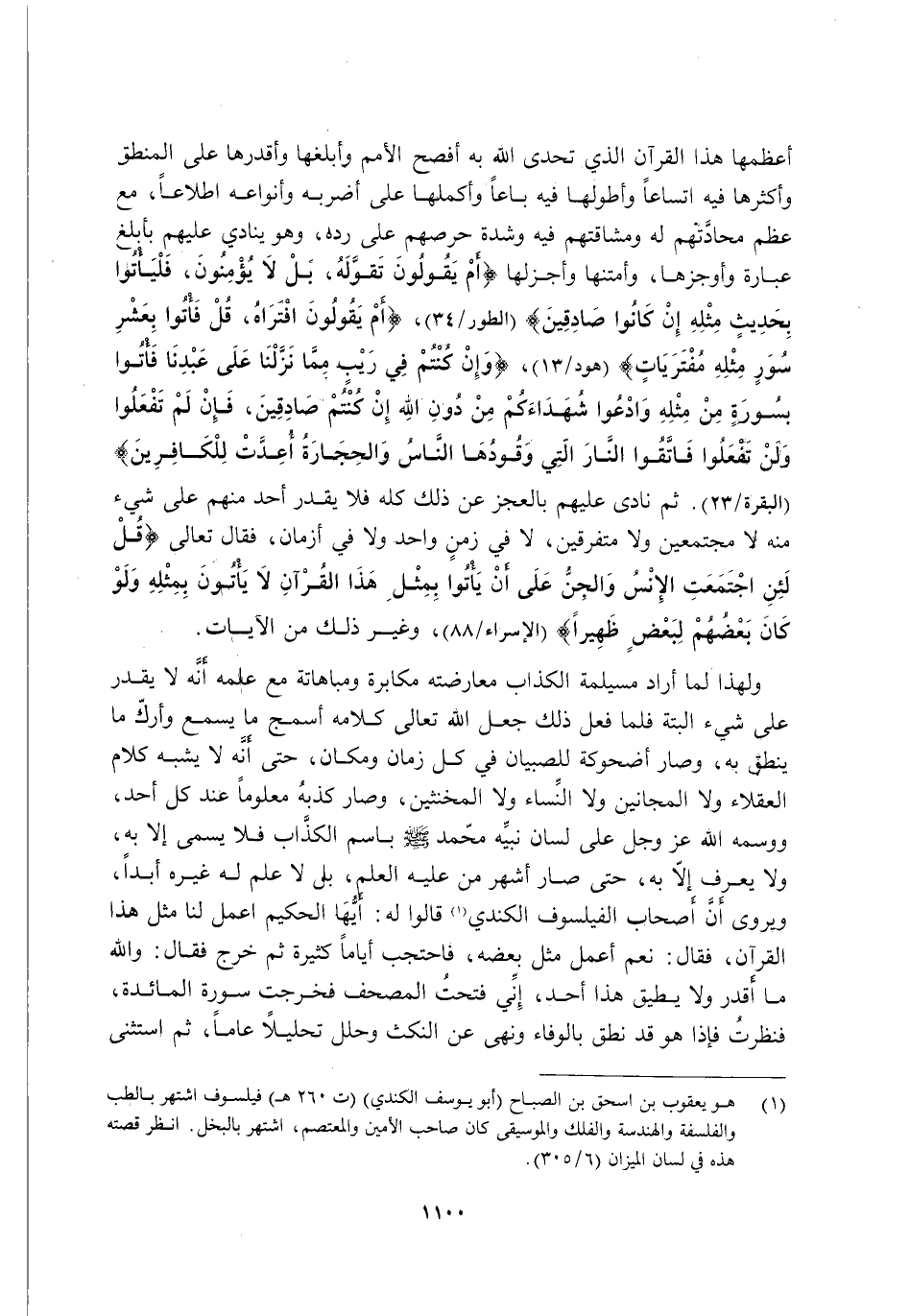 وَلِهَذَا لِمَا أَرَادَ مُسَيْلِمَةُ الْكَذَّابُ معارضته مكابرة ومباهاتة مَعَ عِلْمِهِ أَنَّهُ لَا يَقْدِرُ عَلَى شَيْءٍ الْبَتَّةَ فَلَمَّا فَعَلَ ذَلِكَ جَعَلَ اللَّهُ تَعَالَى كَلَامَهُ أَسْمَجَ مَا يُسْمَعُ وَأَرَكَّ مَا يُنْطَقُ بِهِ, وَصَارَ أُضْحُوكَةً لِلصِّبْيَانِ فِي كُلِّ زَمَانٍ وَمَكَانٍ, حَتَّى أَنَّهُ لَا يُشْبِهُ كَلَامَ الْعُقَلَاءِ وَلَا الْمَجَانِينَ وَلَا النِّسَاءِ وَلَا الْمُخَنَّثِينَ, وَصَارَ كَذِبُهُ مَعْلُومًا عِنْدَ كُلِّ أَحَدٍ, وَوَسَمَهُ اللَّهُ عَزَّ وَجَلَّ عَلَى لِسَانِ نَبِيِّهِ مُحَمَّدٍ -صَلَّى اللَّهُ عَلَيْهِ وَسَلَّمَ- بِاسْمِ الْكَذَّابِ فَلَا يُسَمَّى إِلَّا بِهِ, وَلَا يُعْرَفُ إِلَّا بِهِ, حَتَّى صَارَ أَشْهَرَ مَنْ عَلَيْهِ الْعَلَمُ, بَلْ لَا عَلَمَ لَهُ غَيْرُهُ أَبَدًا, وَيُرْوَى أَنَّ أَصْحَابَ الْفَيْلَسُوفِ الْكِنْدِيِّ1 قَالُوا لَهُ: أَيُّهَا الْحَكِيمُ اعْمَلْ لَنَا مِثْلَ هَذَا الْقُرْآنِ فَقَالَ: نَعَمْ أَعْمَلُ مِثْلَ بَعْضِهِ, فَاحْتَجَبَ أَيَّامًا كَثِيرَةً ثُمَّ خَرَجَ فَقَالَ: وَاللَّهِ مَا أَقْدِرُ وَلَا يَطِيقُ هَذَا أَحَدٌ, إِنِّي فَتَحْتُ الْمُصْحَفَ فَخَرَجَتْ سُورَةُ الْمَائِدَةِ, فَنَظَرْتُ فَإِذَا هُوَ قَدْ نَطَقَ بِالْوَفَاءِ وَنَهَى عَنِ النَّكْثِ وَحَلَّلَ تَحْلِيلًا عَامًا, ثُمَّ اسْتَثْنَى
