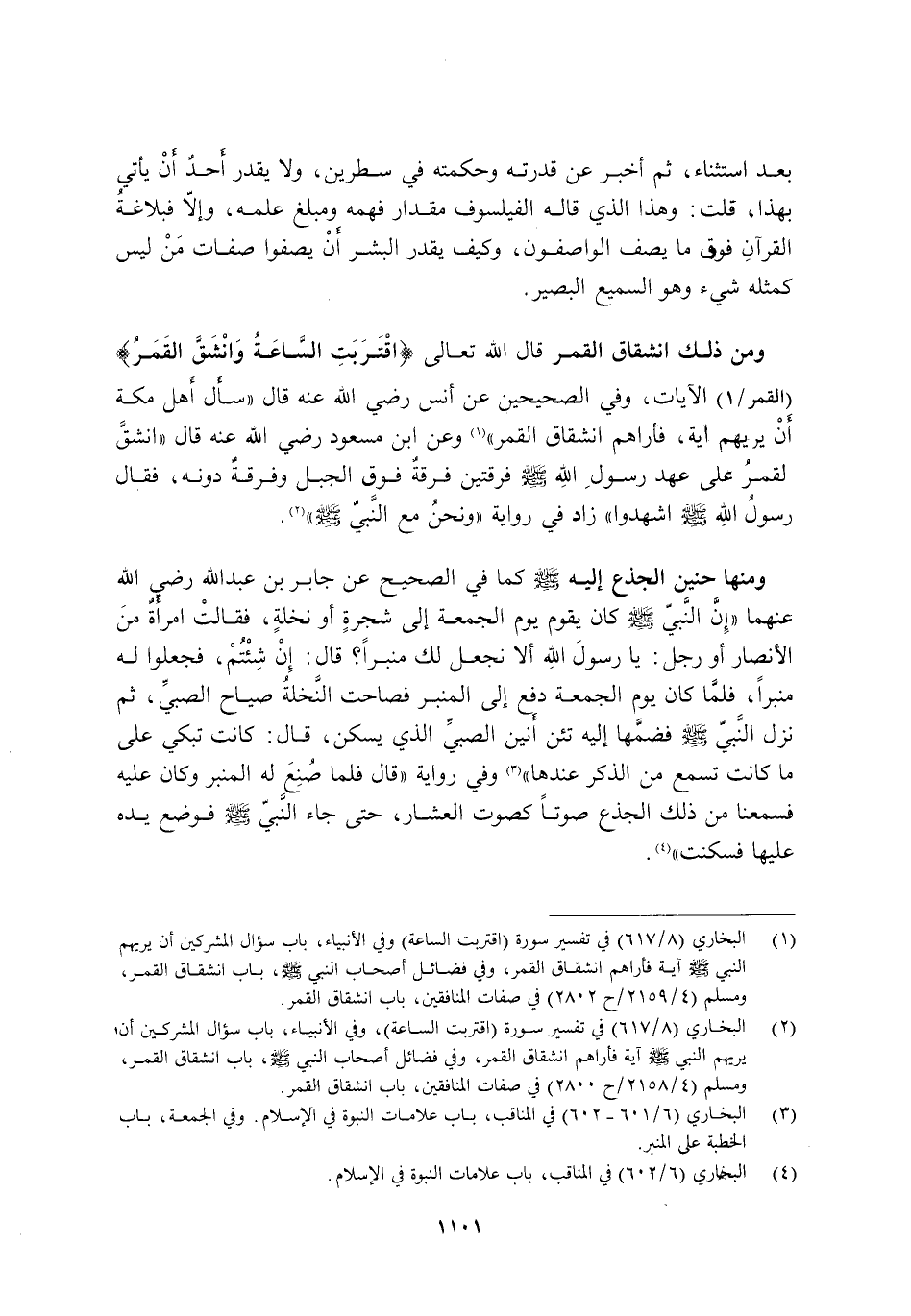 2 البخاري "8/ 617" في تفسير سورة {اقْتَرَبَتِ السَّاعَةُ} ، وفي الأنبياء، باب سؤال المشركين أن يريهم النبي -صَلَّى اللَّهُ عَلَيْهِ وَسَلَّمَ- آية فأراهم انشقاق القمر، وفي فضائل أصحاب النبي صَلَّى اللَّهُ عَلَيْهِ وَسَلَّمَ، باب انشقاق القمر، ومسلم "4/ 2158/ ح2800" في صفات المنافقين، باب انشقاق القمر.
