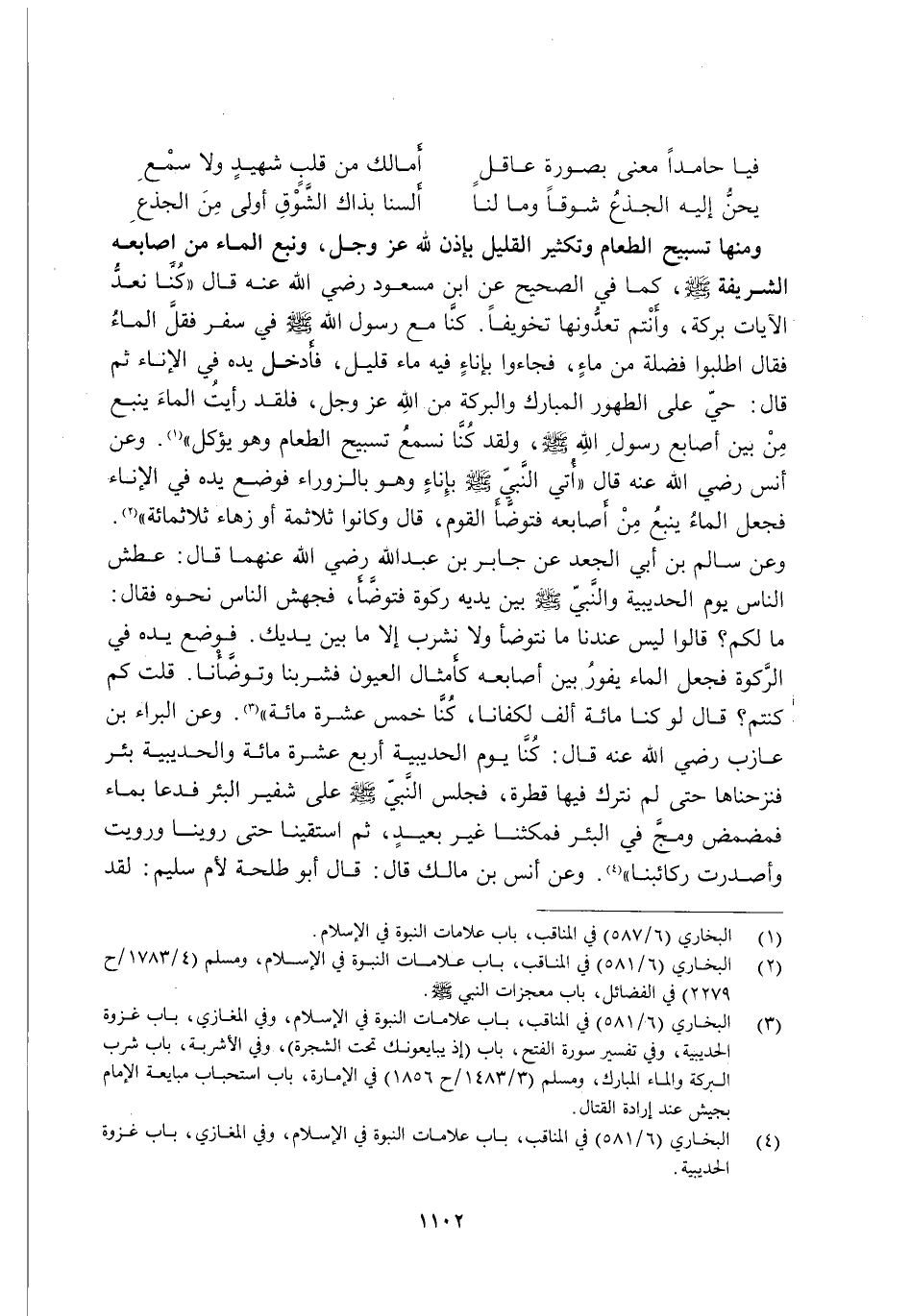 وَمِنْهَا تَسْبِيحُ الطَّعَامِ وَتَكْثِيرُ الْقَلِيلِ بِإِذْنِ اللَّهِ عَزَّ وَجَلَّ, وَنَبْعُ الْمَاءِ مِنْ أَصَابِعِهِ الشَّرِيفَةِ -صَلَّى اللَّهُ عَلَيْهِ وَسَلَّمَ- كَمَا فِي الصَّحِيحِ عَنِ ابْنِ مَسْعُودٍ رَضِيَ اللَّهُ عَنْهُ قَالَ: "كُنَّا نَعُدُّ الْآيَاتِ بَرَكَةً, وَأَنْتُمْ تَعُدُّونَهَا تَخْوِيفًا. كُنَّا مَعَ رَسُولِ اللَّهِ -صَلَّى اللَّهُ عَلَيْهِ وَسَلَّمَ- فِي سَفَرٍ فَقَلَّ الْمَاءُ فَقَالَ: "اطْلُبُوا فَضْلَةً مِنْ مَاءٍ" فَجَاءُوا بِإِنَاءٍ فِيهِ مَاءٌ قَلِيلٌ, فَأَدْخَلَ يَدَهُ فِي الْإِنَاءِ ثُمَّ قَالَ: "حَيَّ عَلَى الطَّهُورِ الْمُبَارَكِ وَالْبَرَكَةُ مِنَ اللَّهِ" فَلَقَدْ رَأَيْتُ الْمَاءَ يَنْبُعُ مِنْ بَيْنِ أَصَابِعِ رَسُولِ اللَّهِ -صَلَّى اللَّهُ عَلَيْهِ وَسَلَّمَ- وَلَقَدْ كُنَّا نَسْمَعُ تَسْبِيحَ الطَّعَامِ وَهُوَ يُؤْكَلُ" وَعَنْ أَنَسٍ رَضِيَ اللَّهُ عَنْهُ قَالَ: أَتَى النَّبِيُّ -صَلَّى اللَّهُ عَلَيْهِ وَسَلَّمَ- بِإِنَاءٍ وَهُوَ بِالزَّوْرَاءِ فَوَضْعَ يَدَهُ فِي الْإِنَاءِ فَجَعَلَ الْمَاءُ يَنْبُعُ مِنْ أَصَابِعِهِ فَتَوَضَّأَ الْقَوْمُ, قَالَ: وَكَانُوا ثَلَاثَمِائَةٍ أَوْ زُهَاءَ ثَلَاثِمِائَةٍ"2.