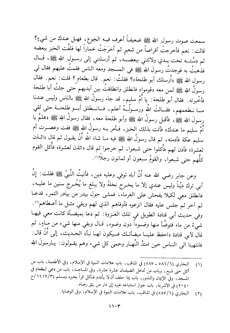 1 البخاري "6/ 586-587" في المناقب، باب علامات النبوة في الإسلام، وفي الأطعمة، باب من أكل حتى شبع, وباب من أدخل الضيفان عشرة عشرة، وفي المساجد، باب من دعي لطعام في المسجد، وفي الأيمان والنذور، باب إذا حلف أن لا يأتدم فأكل تمرا بخبزة ومسلم "3/ 1612/ ح2040" في الأشربة، باب جواز استتباعه غيره إلى دار من يثق رضاه.