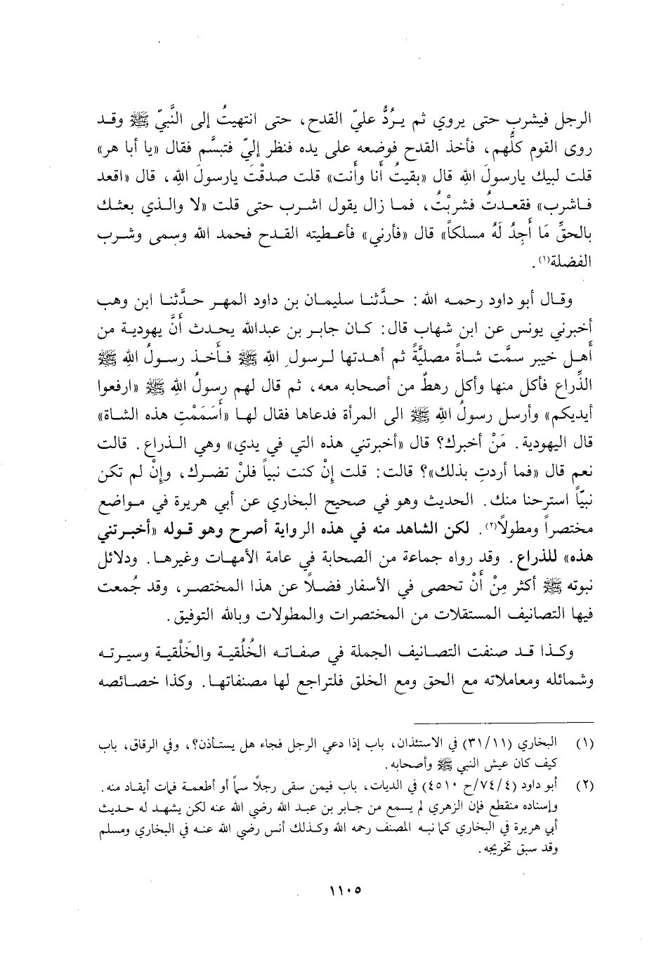 وَقَالَ أَبُو دَاوُدَ رَحِمَهُ اللَّهُ: حَدَّثَنَا سُلَيْمَانُ بن داود المهر حَدَّثَنَا ابْنُ وَهْبٍ أَخْبَرَنِي يُونُسُ عَنِ ابْنِ شِهَابٍ قَالَ: كَانَ جَابِرُ بْنُ عَبْدِ اللَّهِ يُحَدِّثُ أَنَّ يَهُودِيَّةً مِنْ أَهْلِ خَيْبَرَ سَمَّتْ شَاةً مَصْلِيَّةً ثُمَّ أَهْدَتْهَا لِرَسُولِ اللَّهِ -صَلَّى اللَّهُ عَلَيْهِ وَسَلَّمَ- فَأَخَذَ رَسُولُ اللَّهِ -صَلَّى اللَّهُ عَلَيْهِ وَسَلَّمَ- الذِّرَاعَ فَأَكَلَ مِنْهَا وَأَكَلَ رَهْطٌ مِنْ أَصْحَابِهِ مَعَهُ, ثُمَّ قَالَ لَهُمْ رَسُولُ اللَّهِ, صَلَّى اللَّهُ عَلَيْهِ وَسَلَّمَ: "ارْفَعُوا أَيْدِيَكُمْ" وَأَرْسَلَ رَسُولُ اللَّهِ -صَلَّى اللَّهُ عَلَيْهِ وَسَلَّمَ- إِلَى الْمَرْأَةِ فَدَعَاهَا فَقَالَ لَهَا: "أَسَمَمْتِ هَذِهِ الشَّاةَ" قَالَتِ الْيَهُودِيَّةُ: مَنْ أَخْبَرَكَ. قَالَ: "أَخْبَرَتْنِي هَذِهِ الَّتِي فِي يَدِي" وَهِيَ الذِّرَاعُ. قَالَتْ: نَعَمْ. قَالَ: "فَمَا أَرَدْتِ بِذَلِكَ" قَالَتْ: قُلْتُ إِنْ كُنْتَ نَبِيًّا فَلَنْ تَضُرَّكَ, وَإِنْ لَمْ تَكُنْ نَبِيًّا اسْتَرَحْنَا مِنْكَ. الْحَدِيثَ وَهُوَ فِي صَحِيحِ الْبُخَارِيِّ عَنْ أَبِي هُرَيْرَةَ فِي مَوَاضِعَ مُخْتَصَرًا وَمُطَوَّلًا2. لَكِنِ الشَّاهِدُ مِنْهُ فِي هَذِهِ الرِّوَايَةِ أَصْرَحُ وَهُوَ قَوْلُهُ: "أَخْبَرَتْنِي هَذِهِ". لِلذِّرَاعِ. وَقَدْ رَوَاهُ جَمَاعَةٌ مِنَ الصَّحَابَةِ فِي عَامَّةِ الْأُمَّهَاتِ وَغَيْرِهَا. وَدَلَائِلِ نُبُوَّتِهِ -صَلَّى اللَّهُ عَلَيْهِ وَسَلَّمَ- أَكْثَرَ مِنْ أَنْ تُحْصَى فِي الْأَسْفَارِ فَضْلًا عَنْ هَذَا الْمُخْتَصَرِ, وَقَدْ جُمِعَتْ فِيهَا التَّصَانِيفُ الْمُسْتَقِلَّاتُ مِنَ الْمُخْتَصَرَاتِ وَالْمُطَوَّلَاتِ وَبِاللَّهِ التَّوْفِيقُ.