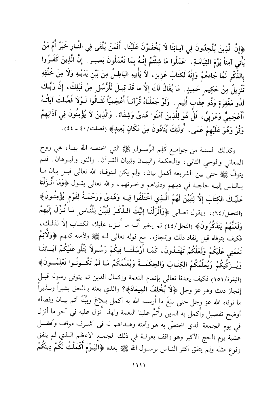 وَكَذَلِكَ السُّنَّةُ مِنْ جَوَامِعِ كَلِمِ الرَّسُولِ -صَلَّى اللَّهُ عَلَيْهِ وَسَلَّمَ- الَّتِي اخْتَصَّهُ اللَّهُ بِهَا, هِيَ رُوحُ الْمَعَانِي وَالْوَحْيُ الثَّانِي, وَالْحِكْمَةُ وَالْبَيَانُ وَتِبْيَانُ الْقُرْآنِ, وَالنُّورُ وَالْبُرْهَانُ. فَلَمْ يُتَوَفَّ -صَلَّى اللَّهُ عَلَيْهِ وَسَلَّمَ- حَتَّى بَيَّنَ الشَّرِيعَةَ أَكْمَلَ بَيَانٍ, وَلَمْ يَكُنْ لِيَتَوَفَّاهُ اللَّهُ تَعَالَى قَبْلَ بَيَانِ مَا بِالنَّاسِ إِلَيْهِ حَاجَةً فِي دِينِهِمْ وَدُنْيَاهُمْ وَآخِرَتِهِمْ, وَاللَّهُ تَعَالَى يَقُولُ: {وَمَا أَنْزَلْنَا عَلَيْكَ الْكِتَابَ إِلَّا لِتُبَيِّنَ لَهُمُ الَّذِي اخْتَلَفُوا فِيهِ وَهُدًى وَرَحْمَةً لِقَوْمٍ يُؤْمِنُونَ} [النَّحْلِ: 64] وَيَقُولُ تَعَالَى: {وَأَنْزَلْنَا إِلَيْكَ الذِّكْرَ لِتُبَيِّنَ لِلنَّاسِ مَا نُزِّلَ إِلَيْهِمْ وَلَعَلَّهُمْ يَتَفَكَّرُونَ} [النَّحْلِ: 44] ثُمَّ يُخْبِرُ أَنَّهُ مَا أَنْزَلَ عَلَيْكَ الْكِتَابَ إِلَّا لِذَلِكَ, فَكَيْفَ يَتَوَفَّاهُ قَبْلَ إِنْفَادِ ذَلِكَ وَإِنْجَازِهِ, مَعَ قَوْلِهِ تَعَالَى لَهُ -صَلَّى اللَّهُ عَلَيْهِ وَسَلَّمَ- وَلِأُمَّتِهِ كُلِّهِمْ: {وَلِأُتِمَّ نِعْمَتِي عَلَيْكُمْ وَلَعَلَّكُمْ تَهْتَدُونَ كَمَا أَرْسَلْنَا فِيكُمْ رَسُولًا مِنْكُمْ يَتْلُو عَلَيْكُمْ آيَاتِنَا وَيُزَكِّيكُمْ وَيُعَلِّمُكُمُ الْكِتَابَ وَالْحِكْمَةَ وَيُعَلِّمُكُمْ مَا لَمْ تَكُونُوا تَعْلَمُونَ} [الْبَقَرَةِ: 151] فَكَيْفَ يَعِدُنَا تَعَالَى بِإِتْمَامِ النِّعْمَةِ وَإِكْمَالِ الدِّينِ ثُمَّ يَتَوَفَّى رَسُولَهُ قَبْلَ إِنْجَازِ ذَلِكَ وَهُوَ عَزَّ وَجَلَّ {لَا يُخْلِفُ الْمِيعَادَ} ؟ وَالَّذِي بَعَثَهُ بِالْحَقِّ بَشِيرًا وَنَذِيرًا مَا تَوَفَّاهُ اللَّهُ عَزَّ وَجَلَّ حَتَّى بَلَّغَ مَا أَرْسَلَهُ اللَّهُ بِهِ أَكْمَلَ بِلَاغٍ وَبَيَّنَهُ أَتَمَّ بَيَانٍ وَفَصَّلَهُ أَوْضَحَ تَفْصِيلٍ وَأَكْمَلَ بِهِ الدِّينَ وَأَتَمَّ عَلَيْنَا النِّعْمَةَ وَلِهَذَا أَنْزَلَ عَلَيْهِ فِي آخِرِ مَا أَنْزَلَ فِي يَوْمِ الْجُمُعَةِ الَّذِي اخْتُصَّ بِهِ هُوَ وَأُمَّتُهُ وَهَدَاهُمْ لَهُ فِي أَشْرَفِ مَوْقِفٍ وَأَفْضَلِ عَشِيَّةٍ يَوْمَ الْحَجِّ الْأَكْبَرِ وَهُوَ وَاقِفٌ بِعَرَفَةَ فِي ذَلِكَ الْجَمْعِ الْأَعْظَمِ الَّذِي لَمْ يَتَّفِقْ وُقُوعُ مِثْلُهُ وَلَمْ يَتَّفِقْ أَكْثَرُ النَّاسِ بِرَسُولِ اللَّهِ -صَلَّى اللَّهُ عَلَيْهِ وَسَلَّمَ- بَعْدَهُ {الْيَوْمَ أَكْمَلْتُ لَكُمْ دِينَكُمْ