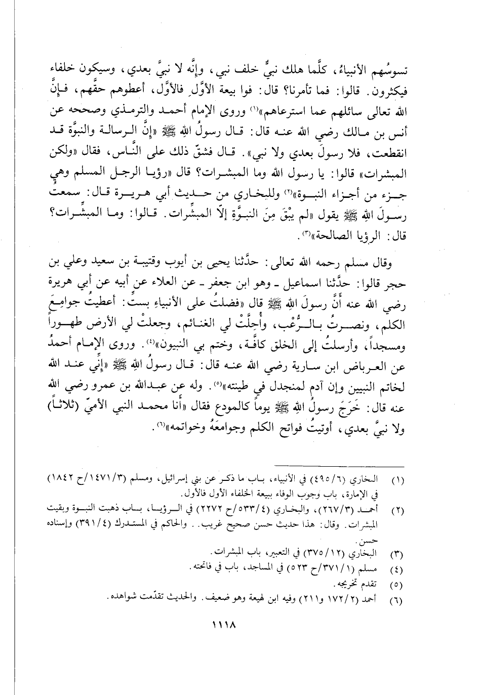 وَقَالَ مُسْلِمٌ رَحِمَهُ اللَّهُ تَعَالَى: حَدَّثَنَا يَحْيَى بْنُ أَيُّوبَ وَقُتَيْبَةُ بْنُ سَعِيدٍ وَعَلِيُّ بْنُ حُجْرٍ قَالُوا: حَدَّثَنَا إِسْمَاعِيلُ وَهُوَ ابْنُ جَعْفَرٍ عَنِ الْعَلَاءِ عَنْ أَبِيهِ عَنْ أَبِي هُرَيْرَةَ رَضِيَ اللَّهُ عَنْهُ أَنَّ رَسُولَ اللَّهِ -صَلَّى اللَّهُ عَلَيْهِ وَسَلَّمَ- قَالَ: "فُضِّلْتُ عَلَى الْأَنْبِيَاءِ بِسِتٍّ: أُعْطِيْتُ جَوَامِعَ الْكَلِمِ, وَنُصِرْتُ بِالرُّعْبِ, وَأُحِلَتْ لِيَ الْغَنَائِمُ, وَجُعِلَتْ لِي الْأَرْضُ طَهُورًا وَمَسْجِدًا, وَأُرْسِلْتُ إِلَى الْخَلْقِ كَافَّةً, وَخُتِمَ بِي النَّبِيُّونَ" 4. وَرَوَى الْإِمَامُ أَحْمَدُ عَنِ الْعِرْبَاضِ ابن سَارِيَةَ رَضِيَ اللَّهُ عَنْهُ قَالَ: قَالَ رَسُولُ اللَّهِ, صَلَّى اللَّهُ عَلَيْهِ وَسَلَّمَ: "إِنِّي عِنْدَ اللَّهِ لَخَاتَمُ النَّبِيِّينَ وَإِنَّ آدَمَ لَمُنْجَدِلٌ فِي طِينَتِهِ" 5. وَلَهُ عَنْ عَبْدِ اللَّهِ بْنِ عَمْرٍو رضي الله عنهما قَالَ: خَرَجَ رَسُولُ اللَّهِ -صَلَّى اللَّهُ عَلَيْهِ وَسَلَّمَ- يَوْمًا كَالْمُوَدِّعِ فَقَالَ: "أَنَا مُحَمَّدٌ النَّبِيُّ الْأُمِّيُّ "ثَلَاثًا" وَلَا نَبِيَّ بَعْدِي, أُوتِيْتُ فَوَاتِحَ الْكَلِمِ وَجَوَامِعَهُ وَخَوَاتِمَهُ" 6.